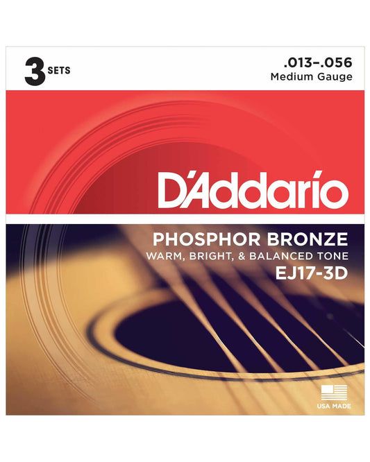 D'Addario EJ17-3D Phosphor Bronze Medium Gauge Acoustic Guitar Strings, Three Pack