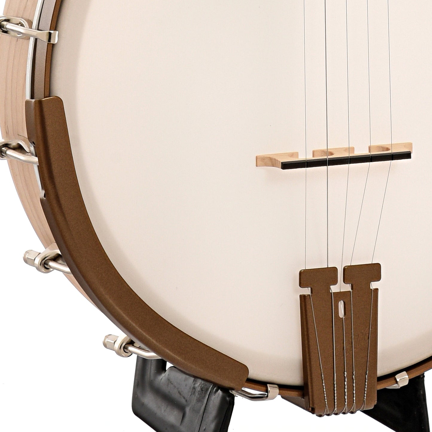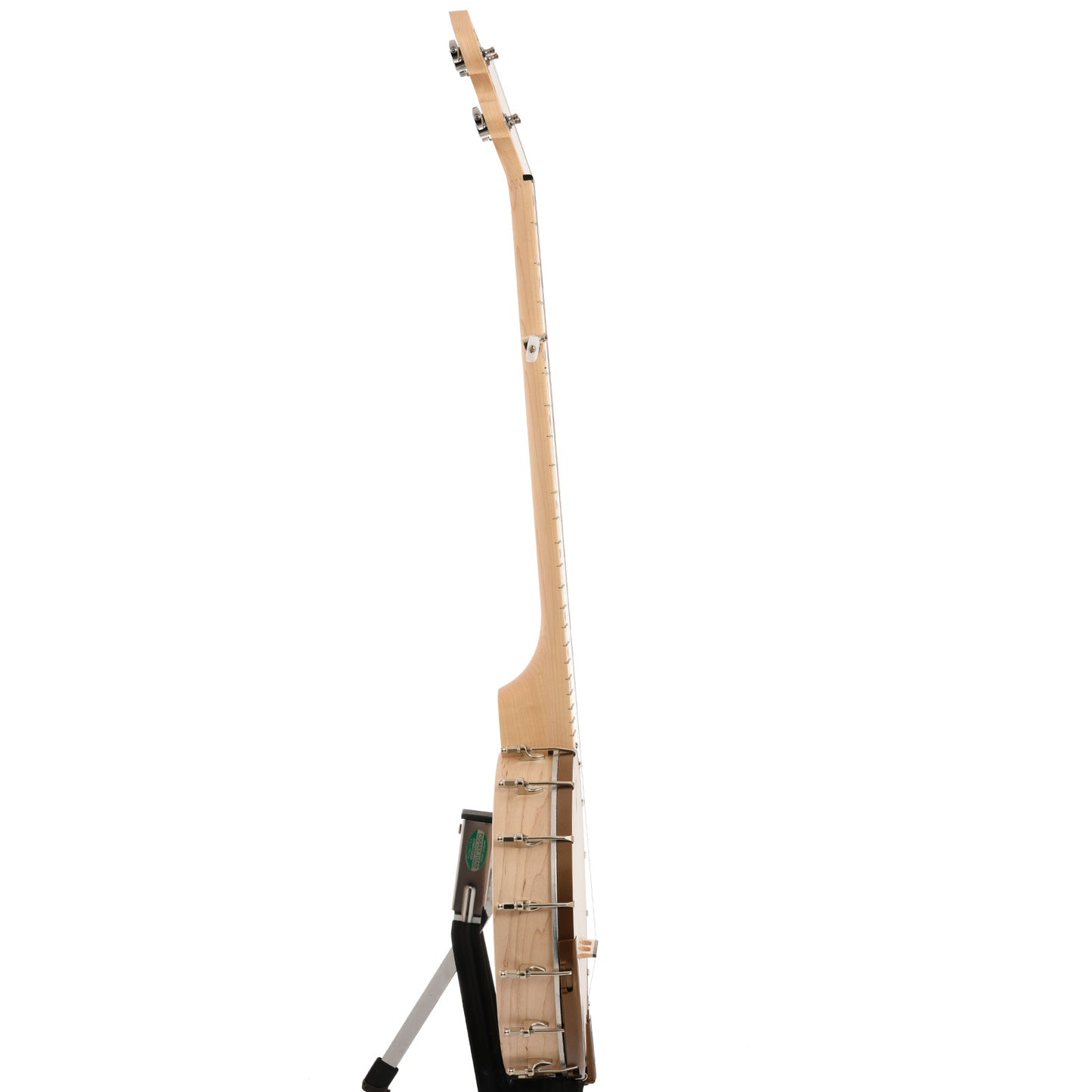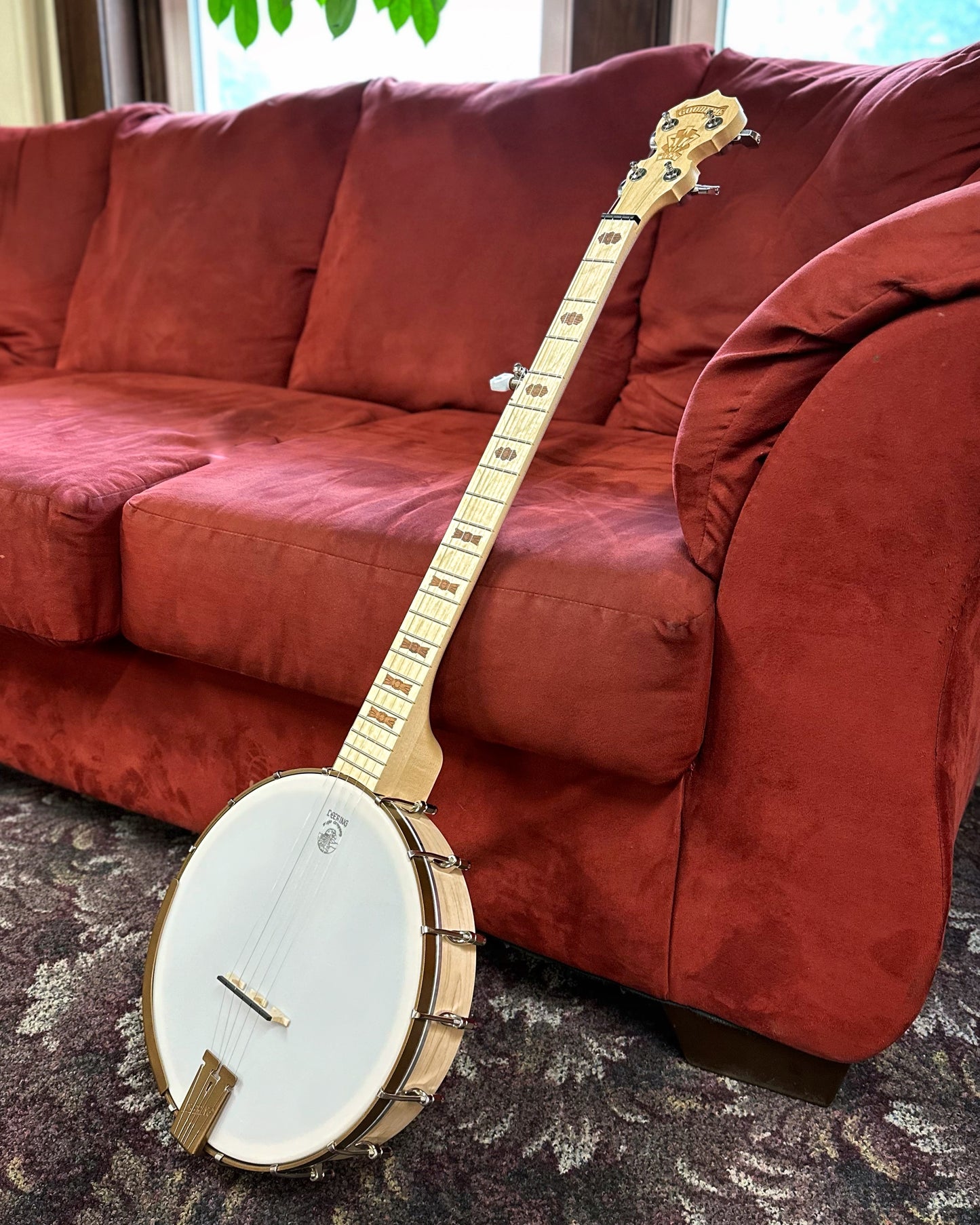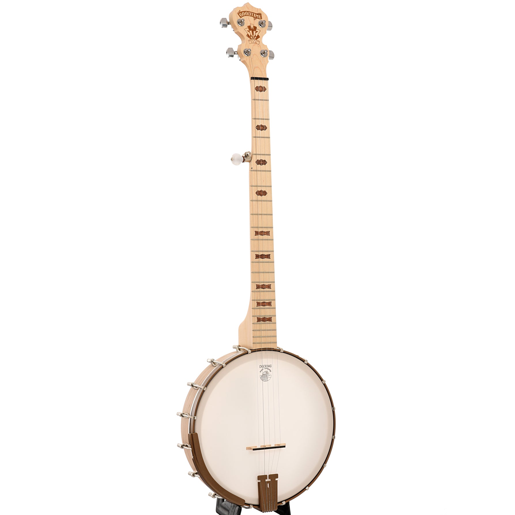 With its excellent tone and playability, the Goodtime banjo is a fine choice for students of all styles, especially Old Time or Appalachian styles. It has a slender rock maple neck and a 3-ply violin grade maple rim with an 11” frosted head. Cosmetic features include art deco style fingerboard inlays and peghead engraving, and a bronze powdercoat finish on the tailpiece, tension hoop & armrest.