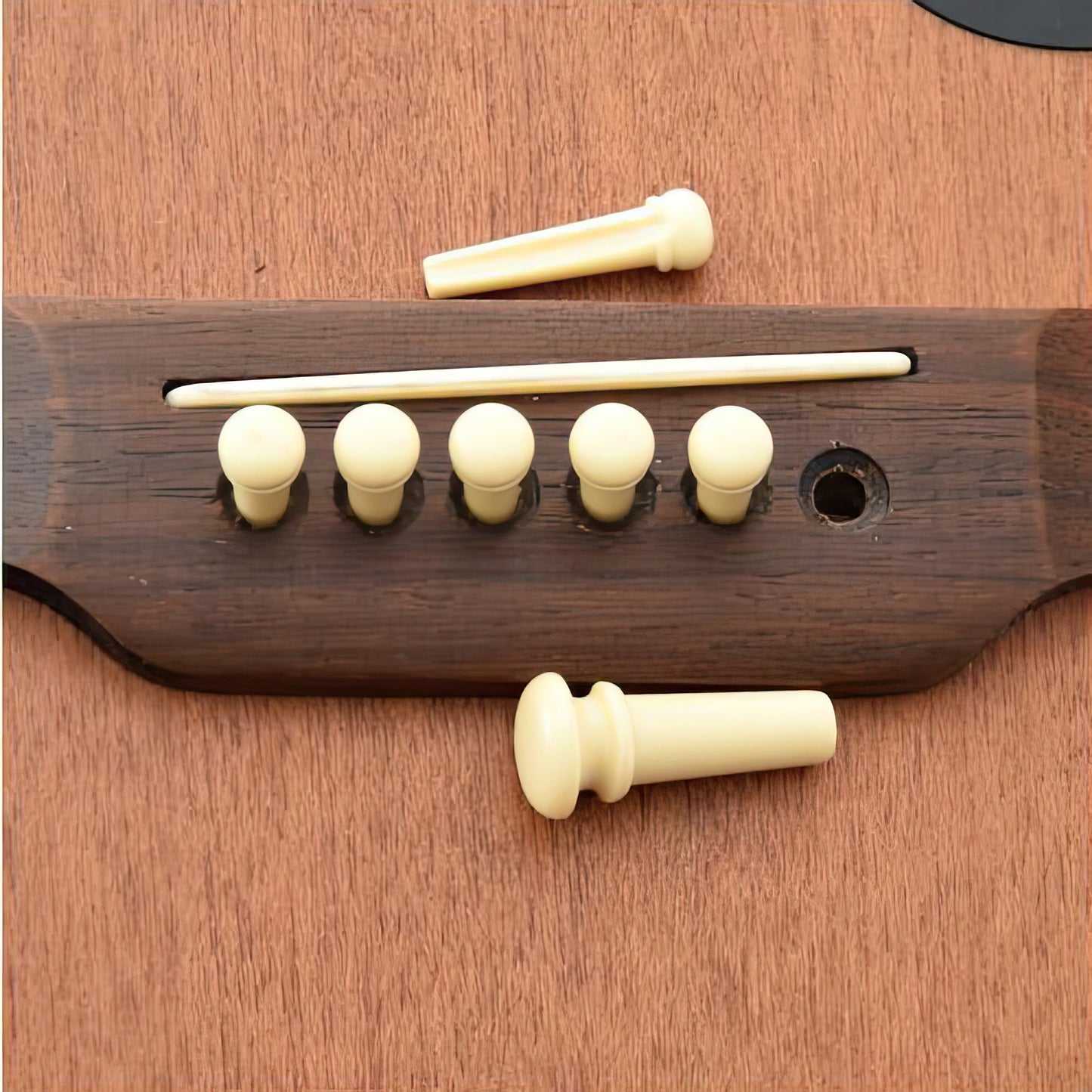 Plain "aged" cream, authentic slotted replica pins as used on L & J model Gibson guitars from 1938-1941. Set includes six bridge pins and one endpin. Bridge pins have a 7.85 mm head diameter, 5.74 mm cone diameter & 5 degree taper. Imported from Germany.