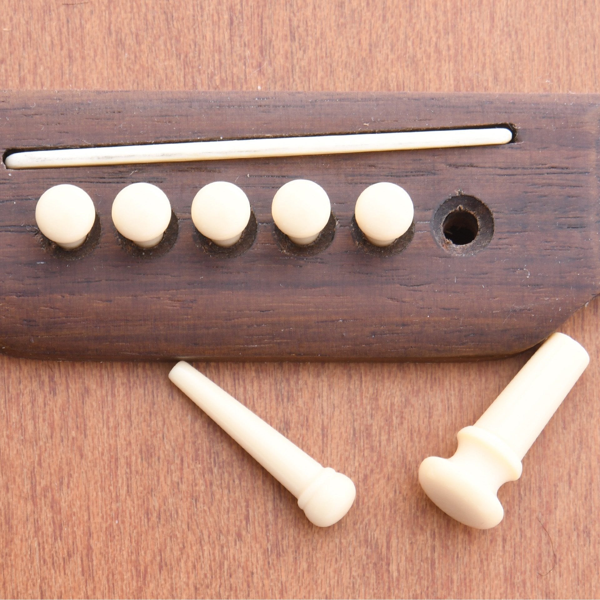 Plain "aged" cream, authentic non-slotted replica pins as used on L-1, L-2 & Nick Lucas (NL) model Gibson guitars from 1930-1932. Also used on 1930's Larson Brothers guitars. Set includes six bridge pins and one endpin. Bridge pins have a 8.1 mm head diameter, 5.6 mm cone diameter & 5 degree taper. Imported from Germany.