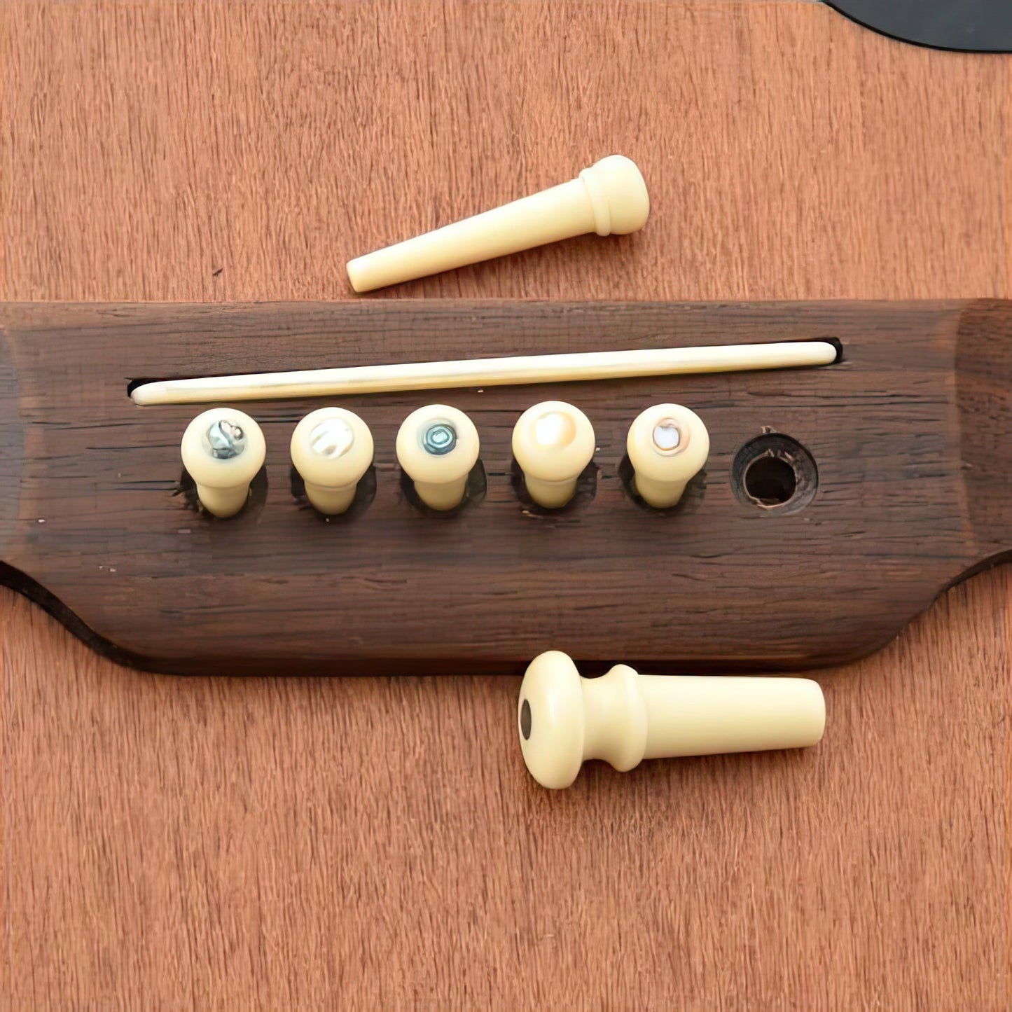 ANTIQUE ACOUSTICS REPLICA MARTIN GUITAR PIN SETS - "Pre-war" Martin acoustic guitars are amongst the most prized instruments on the planet. Careful expert restoration work, when needed, is always well appreciated and very highly valued. So too, finely crafted replica parts. Now, from Germany, developed by a couple of luthiers well versed in the art of guitar restoration, comes this line of replica Martin pin sets. Meticulously crafted, these pin sets are categorized by the specific model Martin and the specific time span the pins were used on that model. Since the dating of Martin guitars is easily done with the serial number, the appropriate pin sets are easily found. These sets include six original bridge pins and an endpin. We are very pleased to offer them.