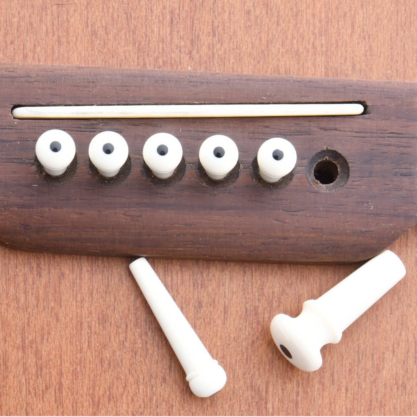 Ivory white with black dot, authentic non-slotted replica pins as used on style 28 Martin guitars from 1939-1945. Set includes six bridge pins and one endpin. Bridge pins have a 7.75 mm head diameter, 6.1 mm cone diameter & 5 degree taper. Imported from Germany.