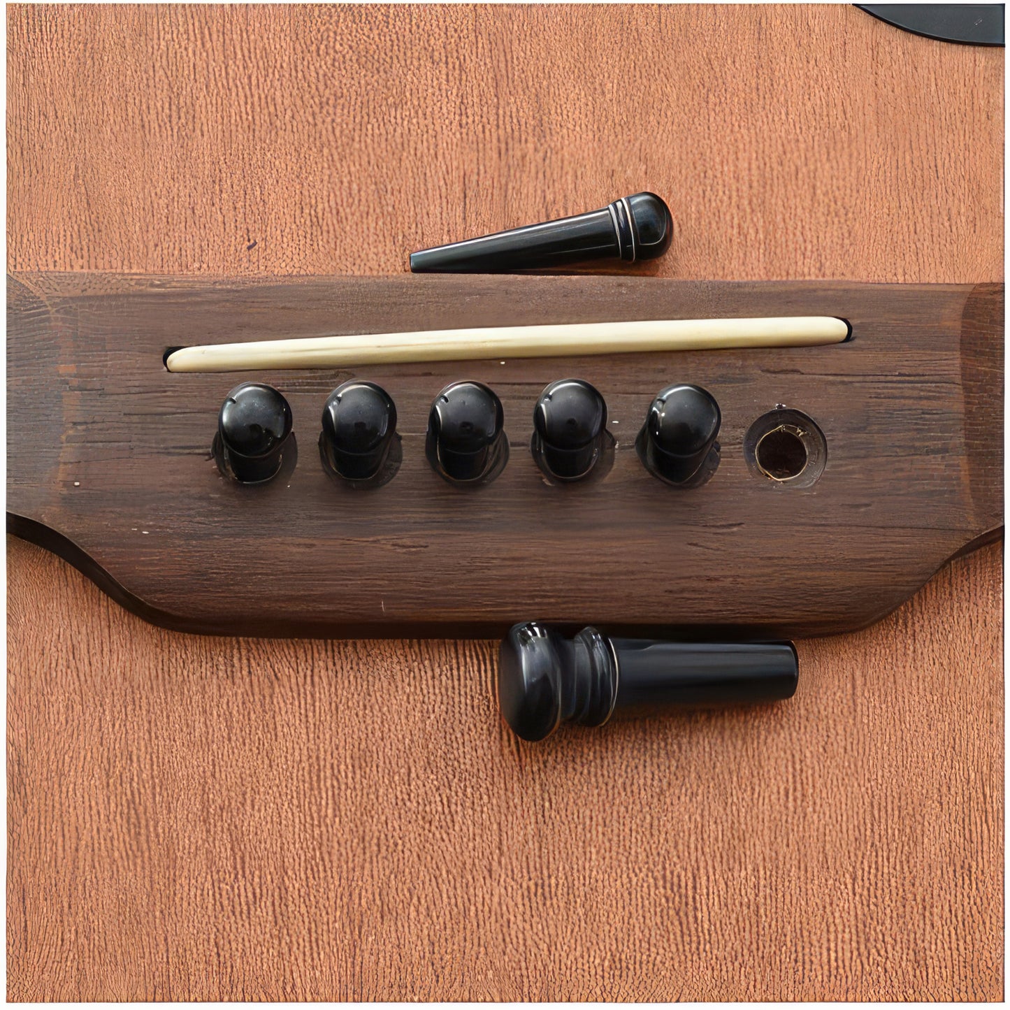 Plain black, authentic non-slotted replica pins as used on style 15, 16, 17 & 18 Martin guitars from 1943-1970's. Set includes six bridge pins and one endpin. Bridge pins have a 7.6 mm head diameter, 5.6 mm cone diameter & 5 degree taper. Imported from Germany.