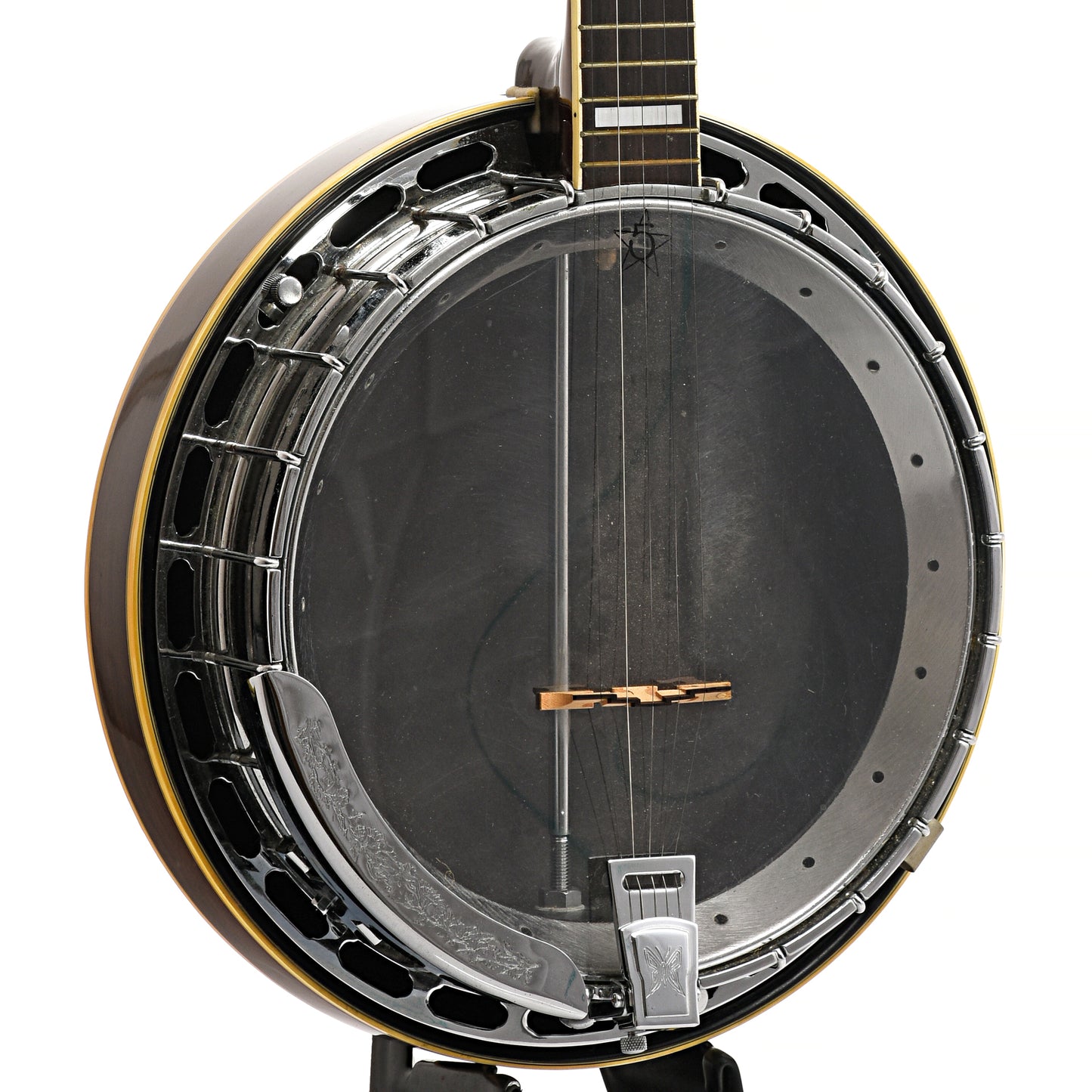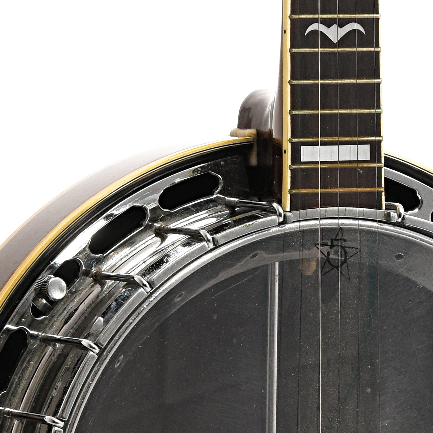 Features on this well-made '70's imported 5-string resonator banjo include 5/8” multi-ply maple rim, double bound rosewood resonator, 20-hole flathead tone ring, 22-fret rosewood fingerboard with fancy inlay, Five-Star Planetary tuners installed. Needs some work to make it playable (needs fretwork, 5th string tuner loose, action high, strings, set-up, clean-up, etc. – sold AS-IS)