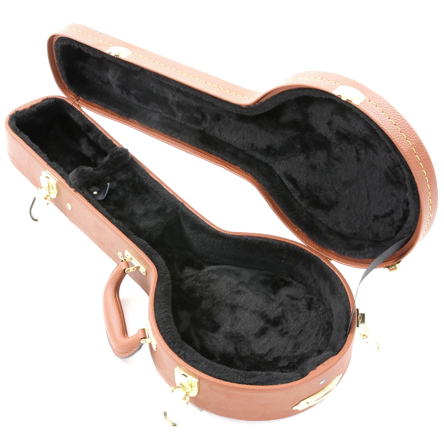 Deluxe archtop hardshell case fits ukes with rims up to 8" diameter. Inside dimensions approximately: 8-3/4" diameter, 2-1/2" deep, 23" long. Brown vinyl covering, brown plush padded lining, small accessory pocket. (Slightly too small for Gold Tone Banjolele, our #GTBJU.) Also, the width of the case in the peghead end is 3-1/2", so if your instrument has tuners that stick out of the side of the peghead, it may not fit in this case.