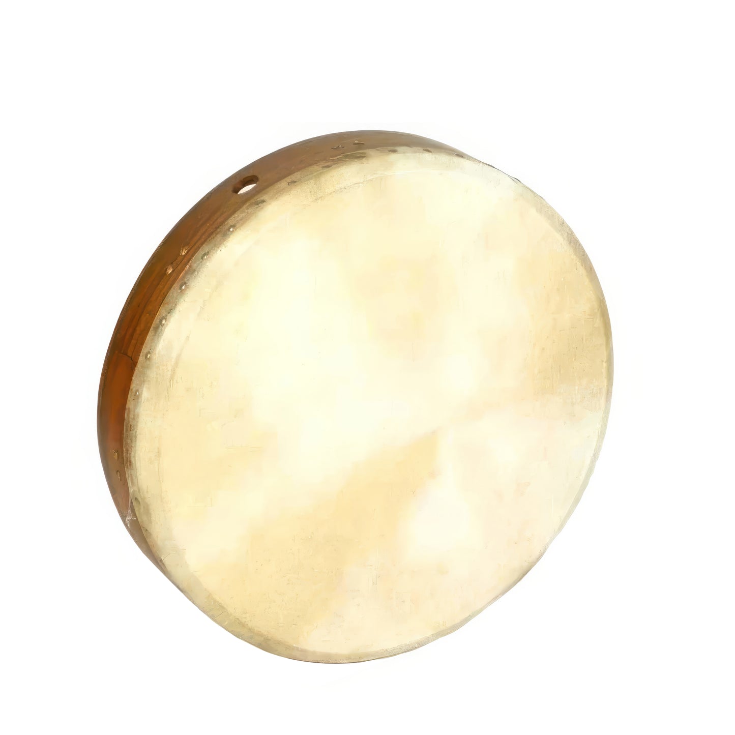 Single goatskin head, worked for extra softness, tacked and glued, 18 x 3.5" rosewood rim, double crossbar. Inside the rim tuning bolts. Includes tipper, tuning wrench, and info sheet.