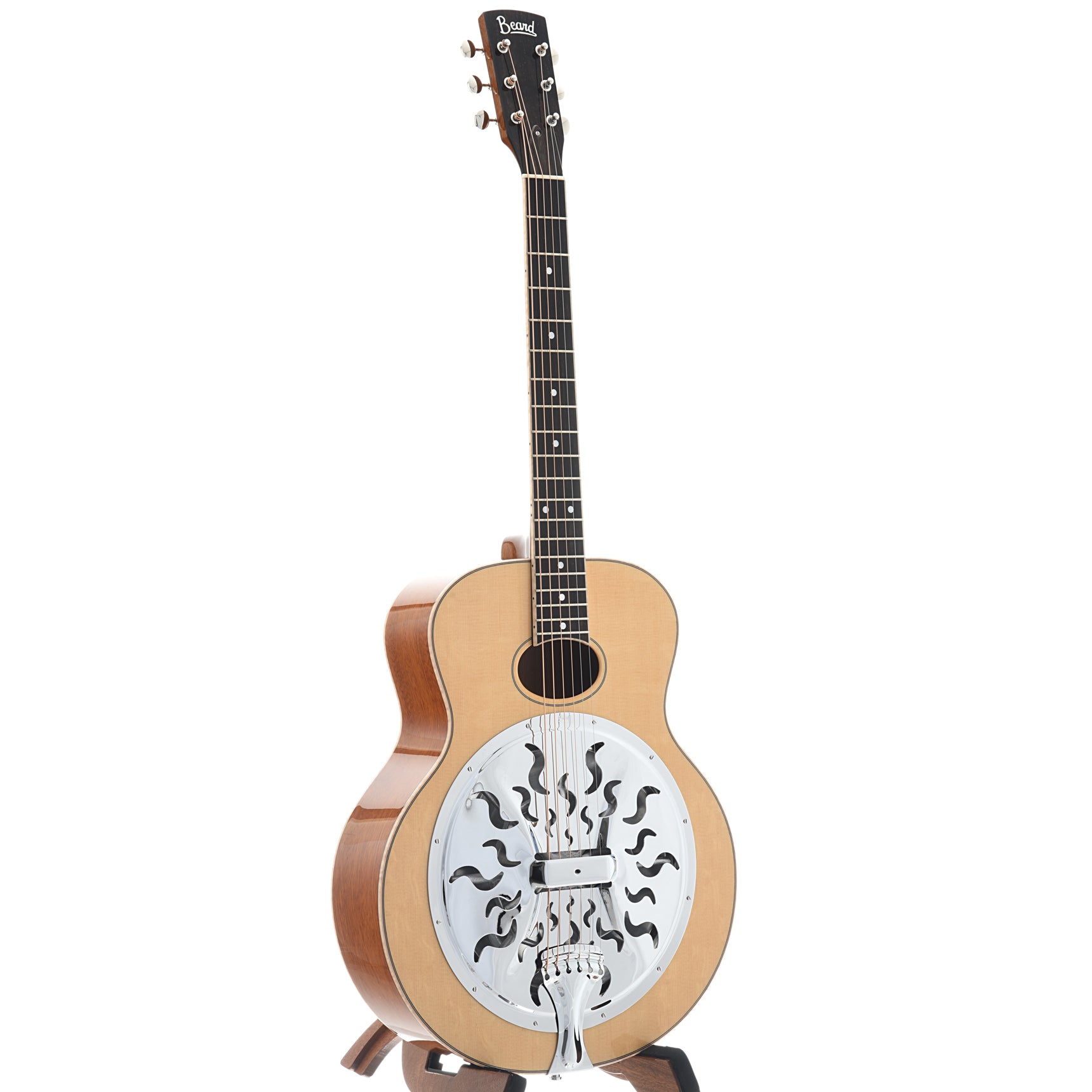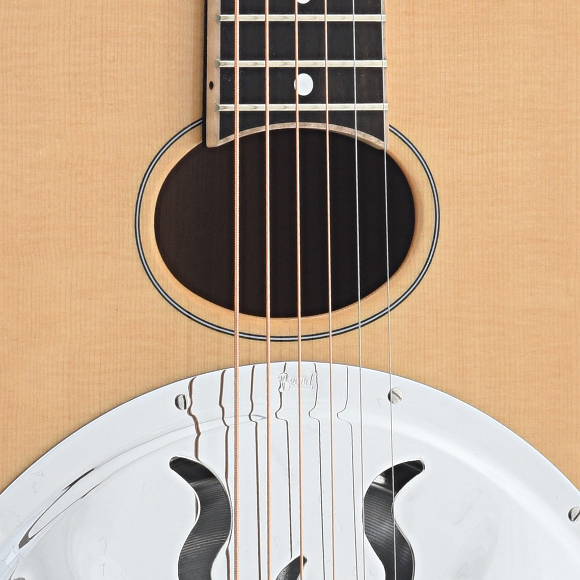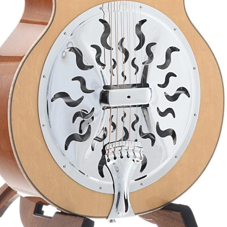 ROUNDNECK ACOUSTIC-ELECTRIC RESONATOR GUITAR - The now classic open-body resonator guitar design with an oval soundhole for a rich warm powerful acoustic sound and an installed Fishman Nashville Aura-ready pickup for a performance ready amplified sound. Body is the impressive Beard A-model with arched back, wider 15" lower bout and 4" depth, all combining to yield a huge sound. Made with all solid woods; mahogany back, sides & neck and spruce top. Other features include ebony fretboard with pearl dot inlay, solid headstock with open gear Waverly tuners, solar pattern coverplate atop a Beard Legend-Cone spun cone with cast aluminum #14 spider bridge & hard maple saddle inserts, 1-3/4" nut, 25" scale, gloss lacquer natural finish, traditional tailpiece, chrome hardware and flame-maple bound body & neck. Includes shaped wooden hardshell case.