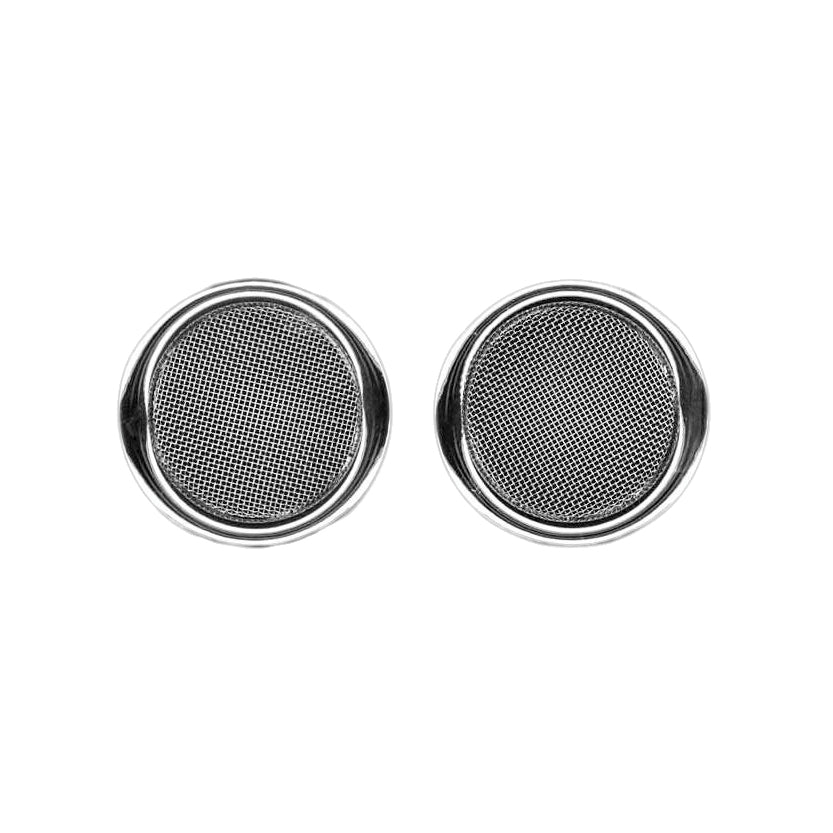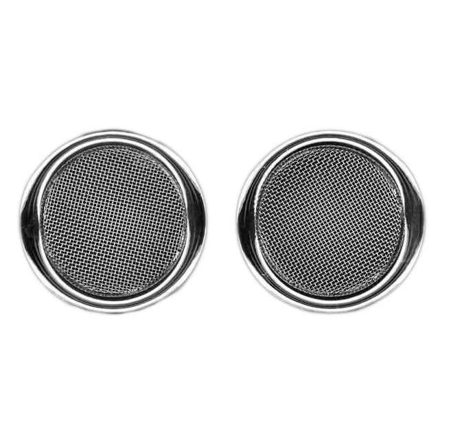 Pair of chrome plated brass soundhole rings with screens. Standard style and size. Fits most resonator guitars.