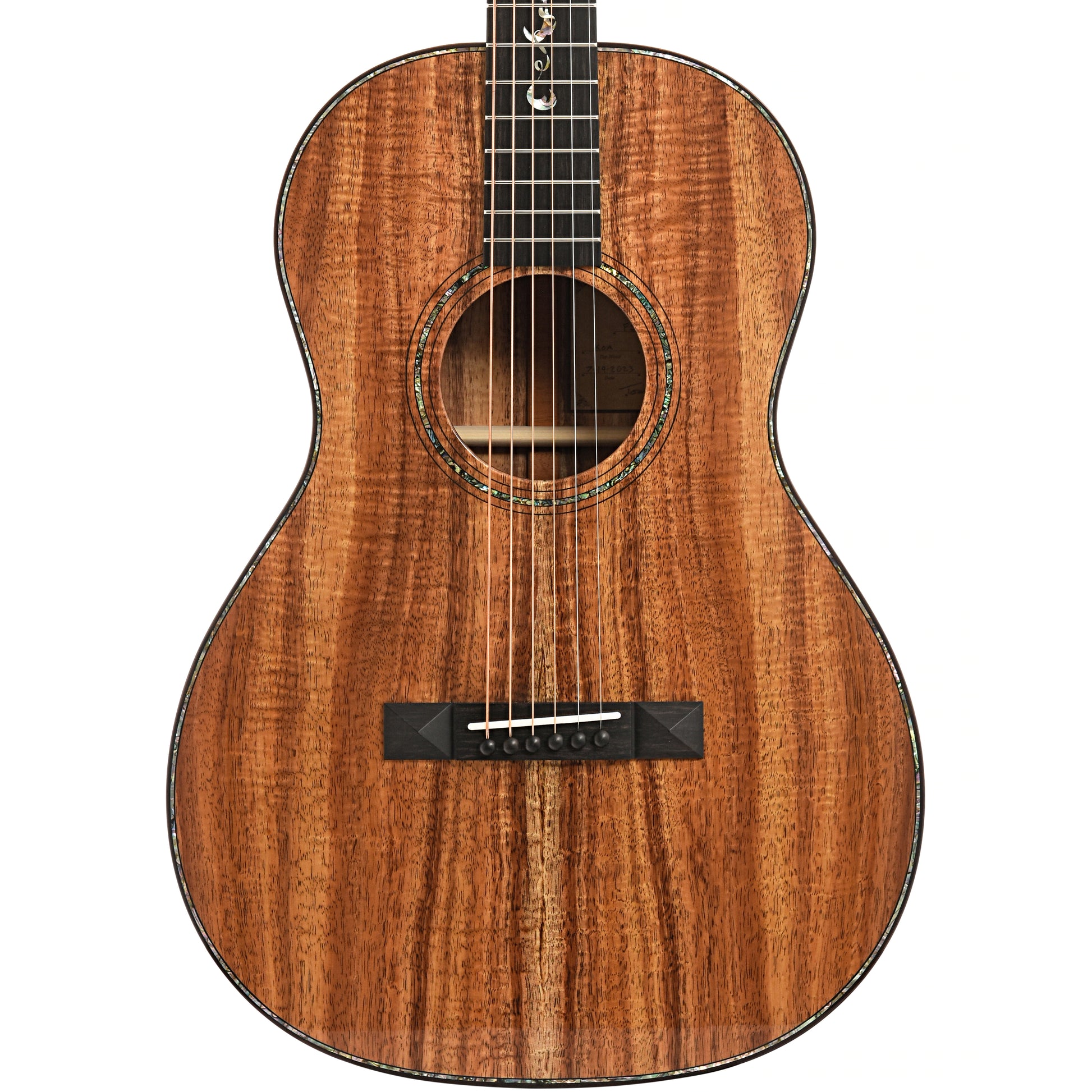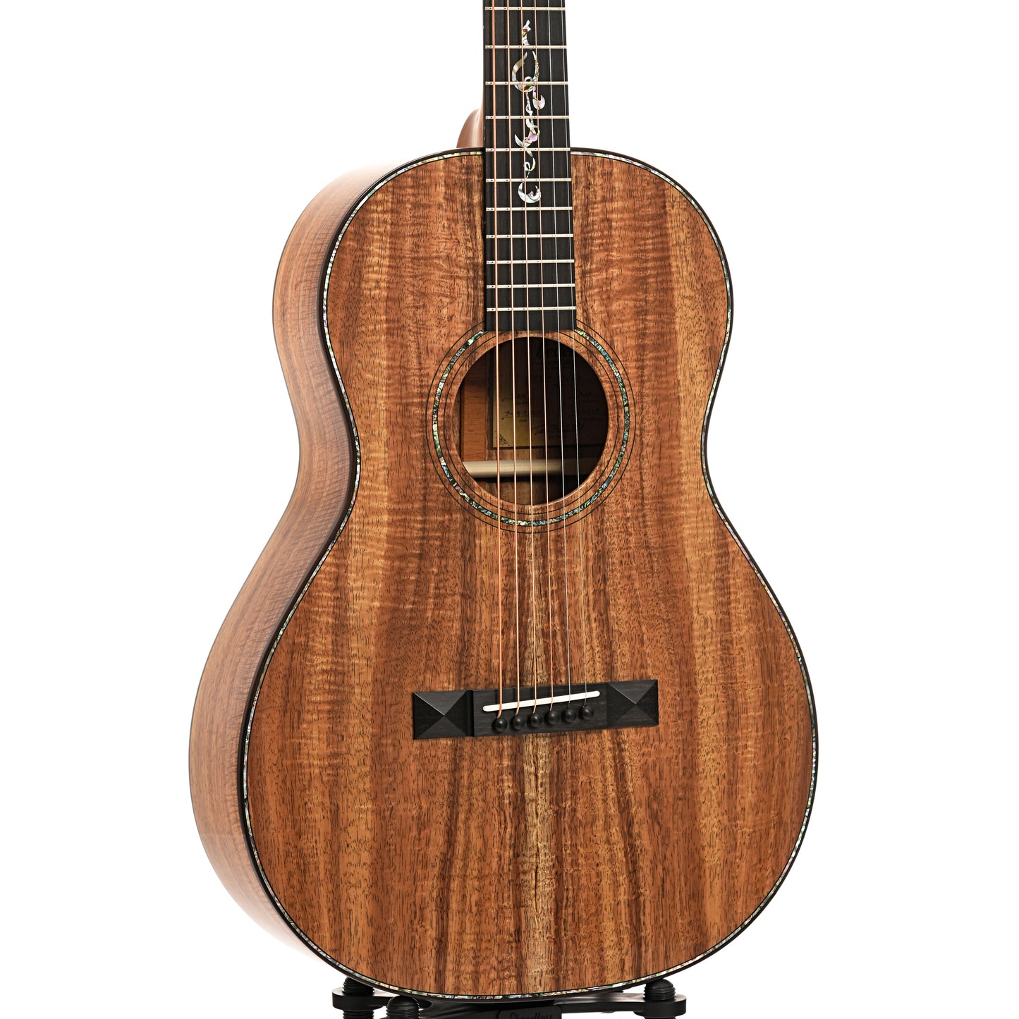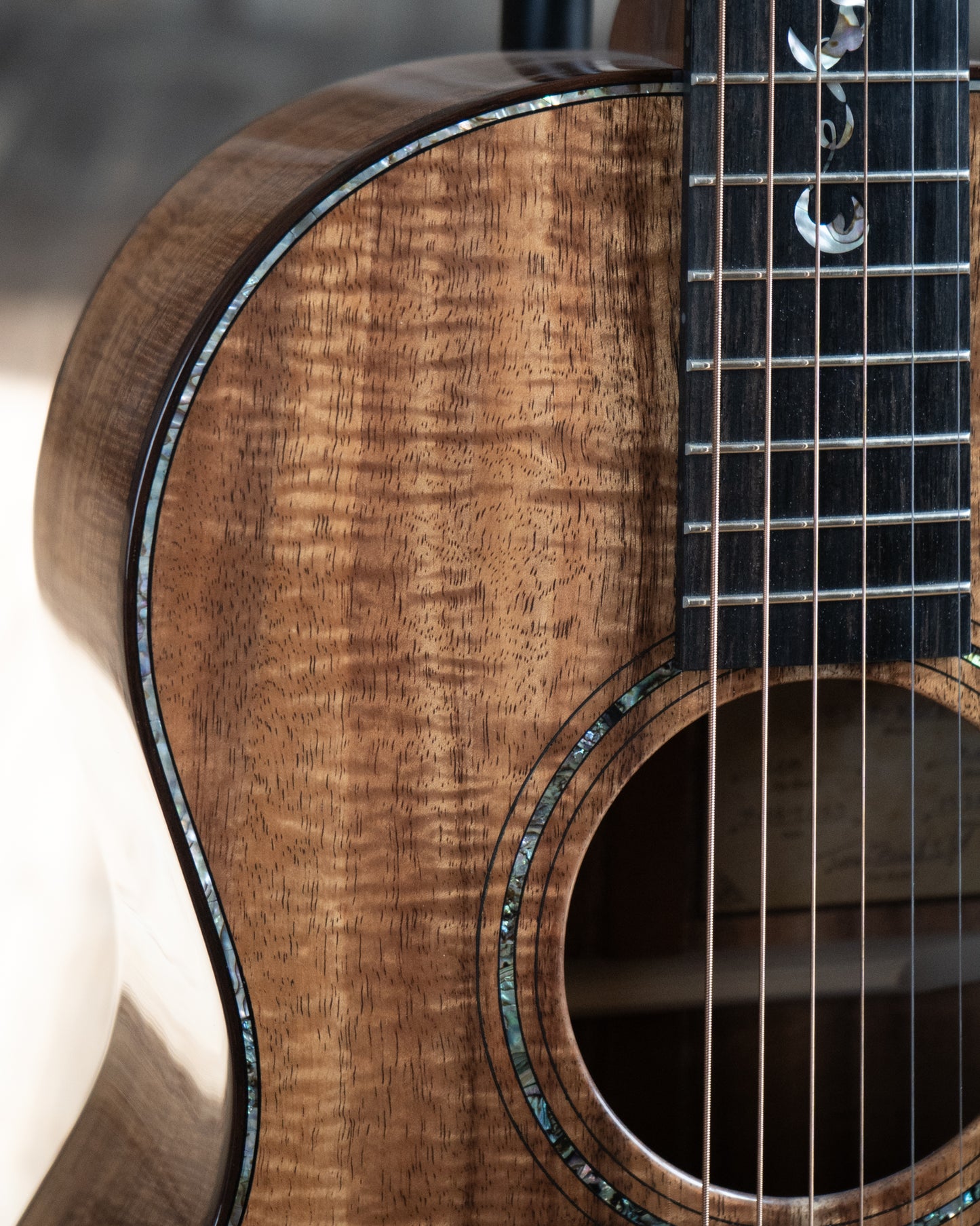 A Stunning guitar both visually and sonically and limited to only 10 pieces made. The Bedell Limited Edition Fireside Parlor features include all solid figured Koa top, back & sides, a Honduran mahogany neck with ebony fingerboard and a small vine abalone inlay. Robust, clear and sweet sound.