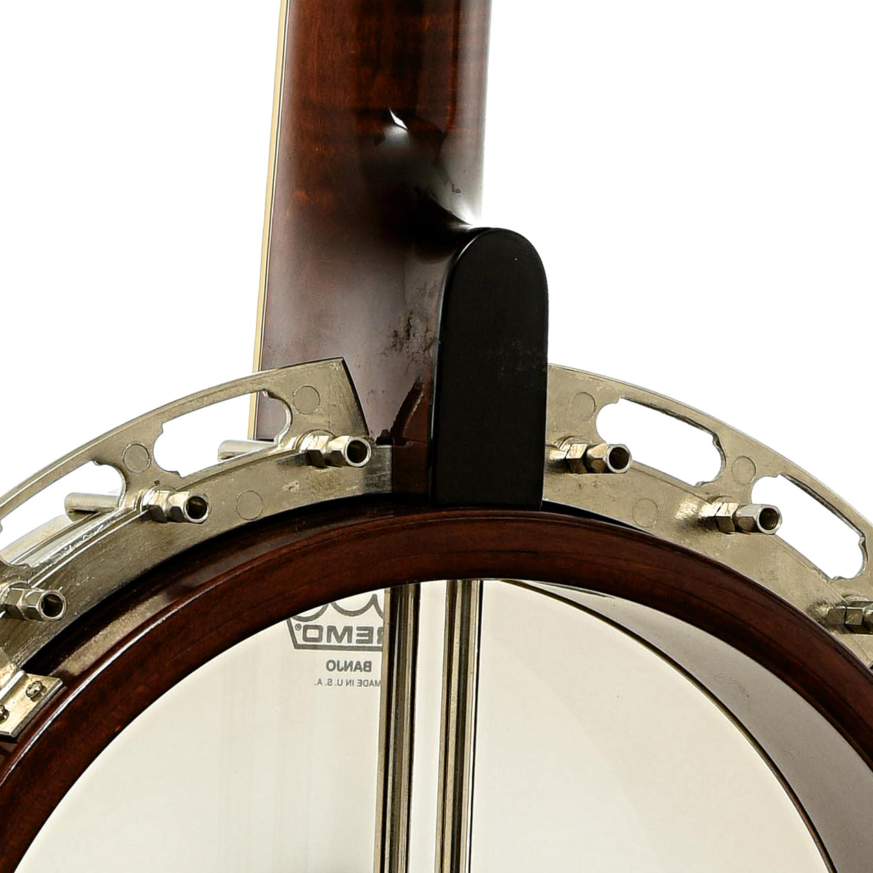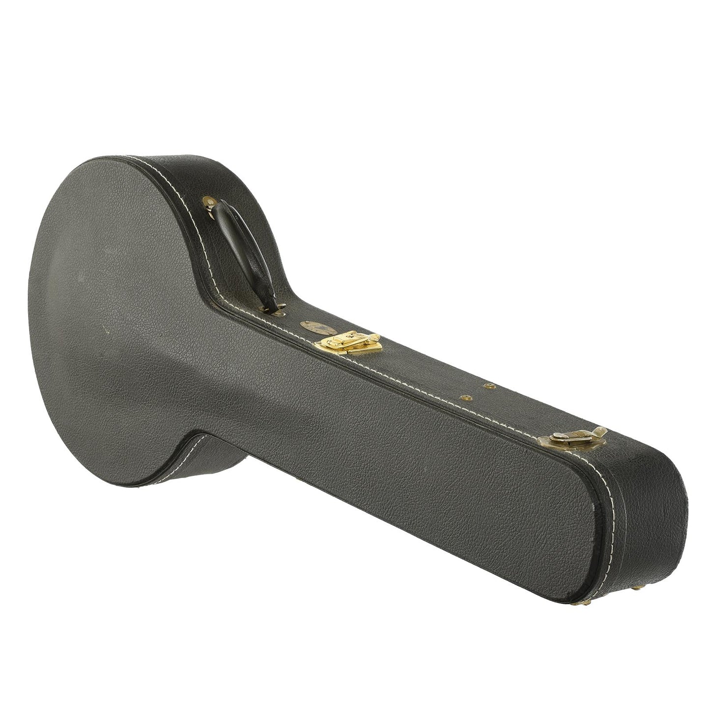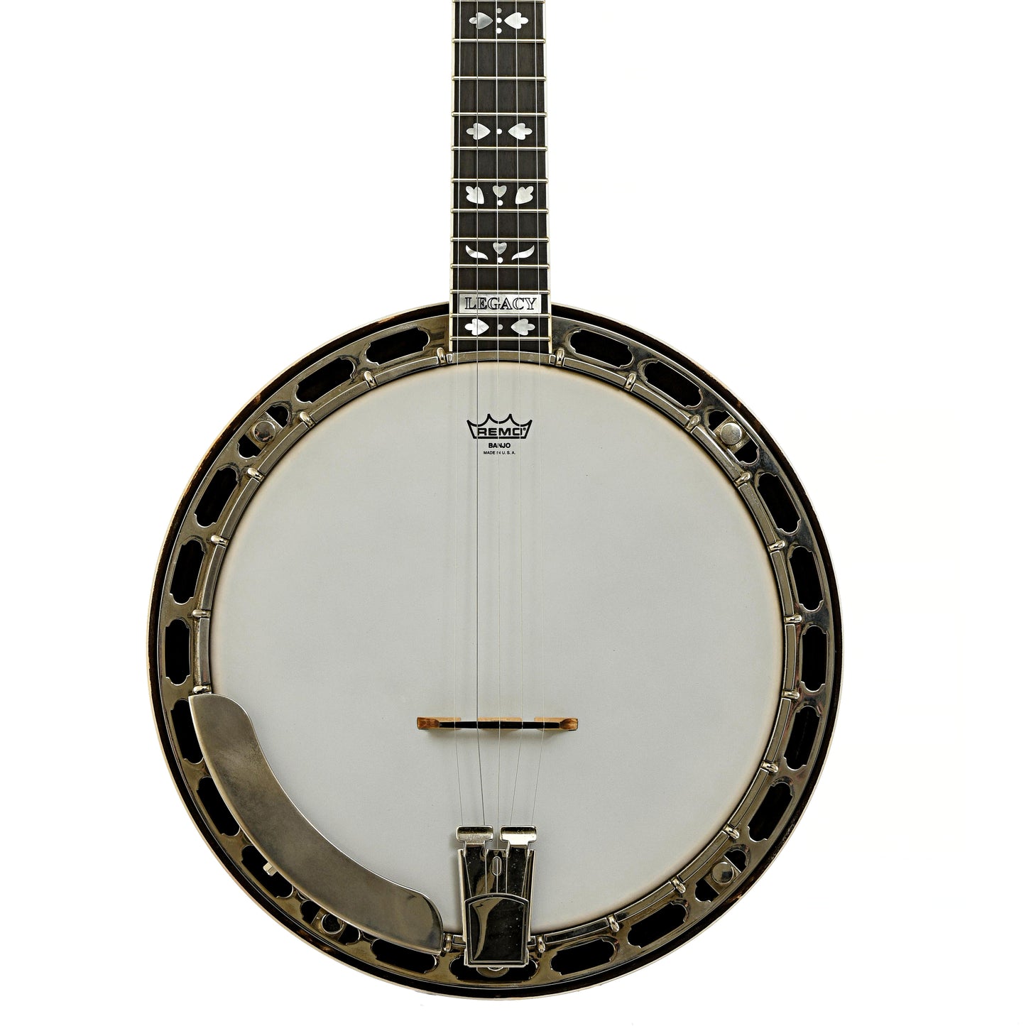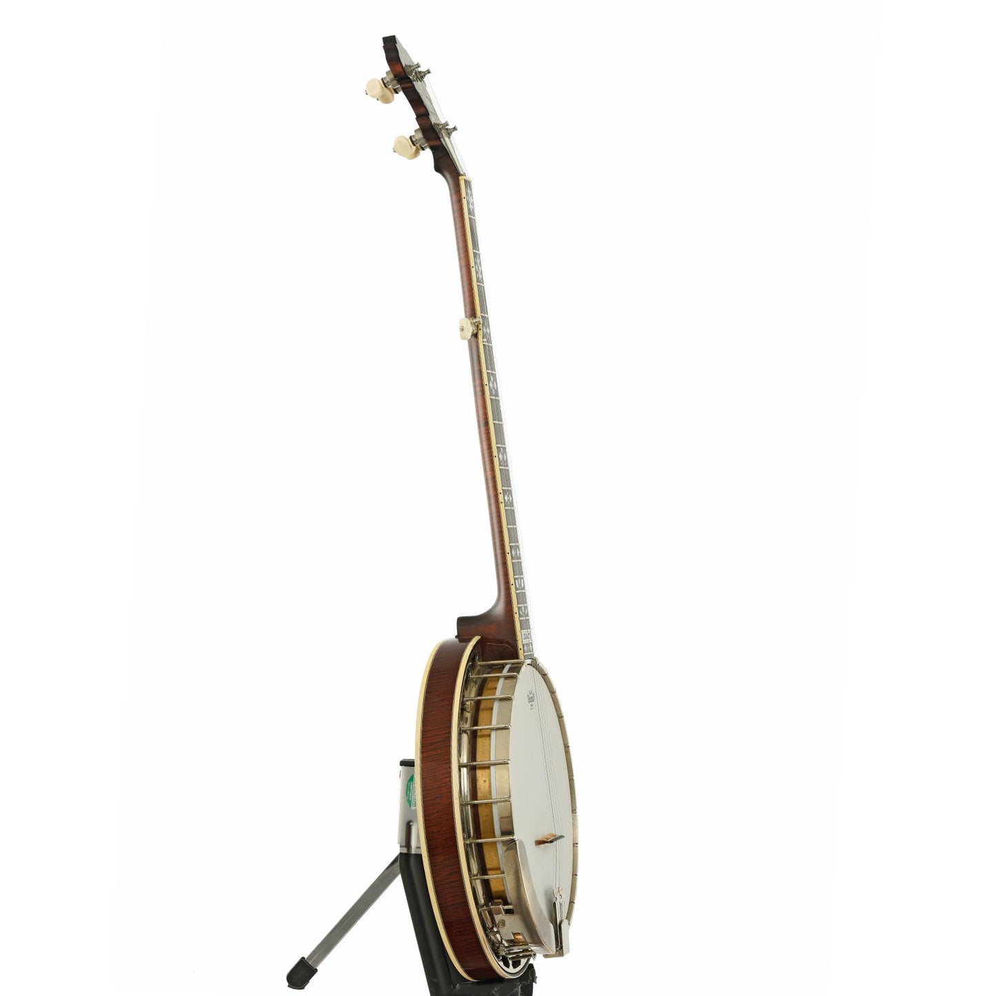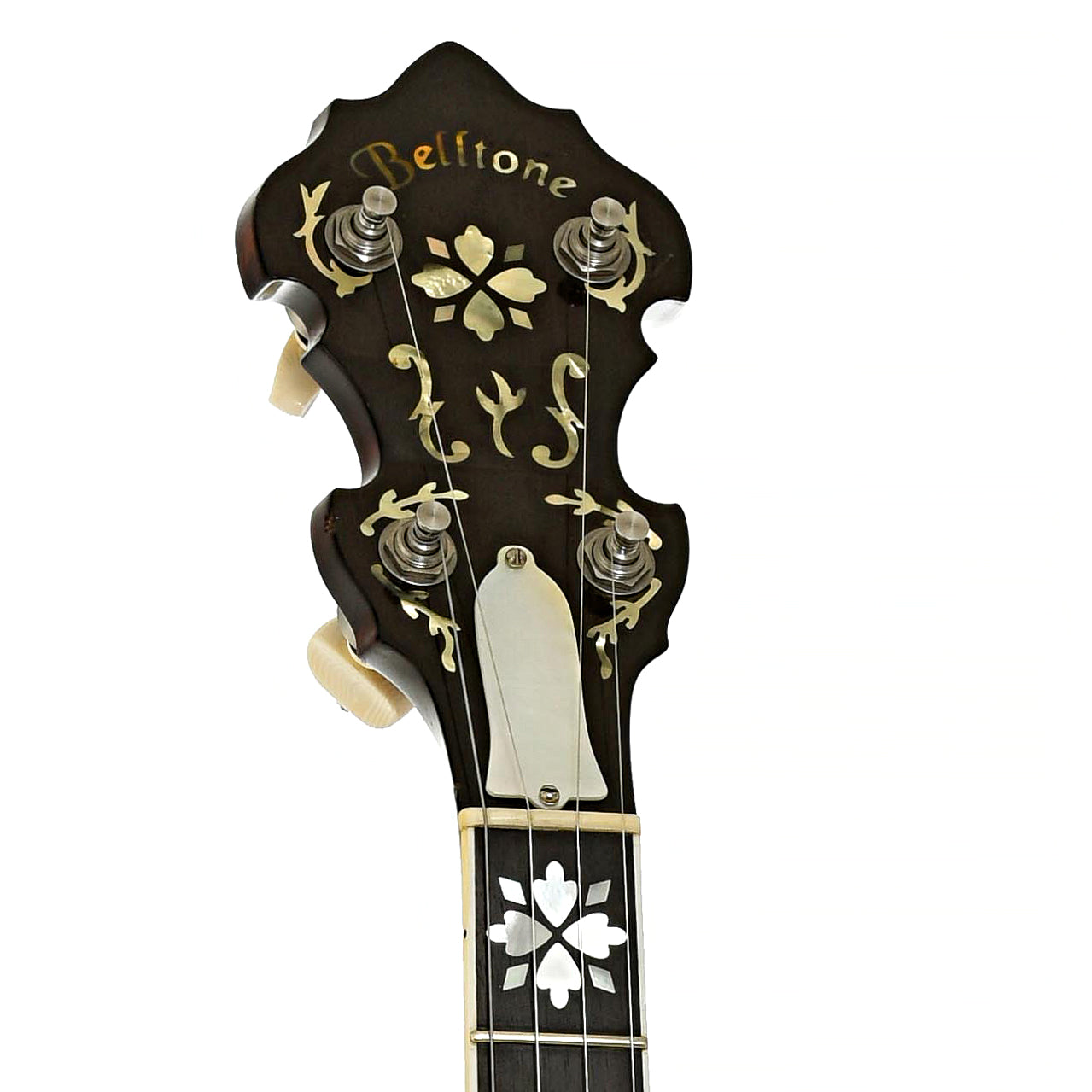 A rare find, this Belltone Legacy resonator has a loud tone, with its maple resonator and flamed neck, brass 20-hole flathead tone ring on 3-piece maple rim, Five Star planetary tuners, with a bound ebony fingerboard featuring hearts and flowers pearl inlay. AVS hard shell case. Handcrafted in the U.S.A. by Gene Elkins.
