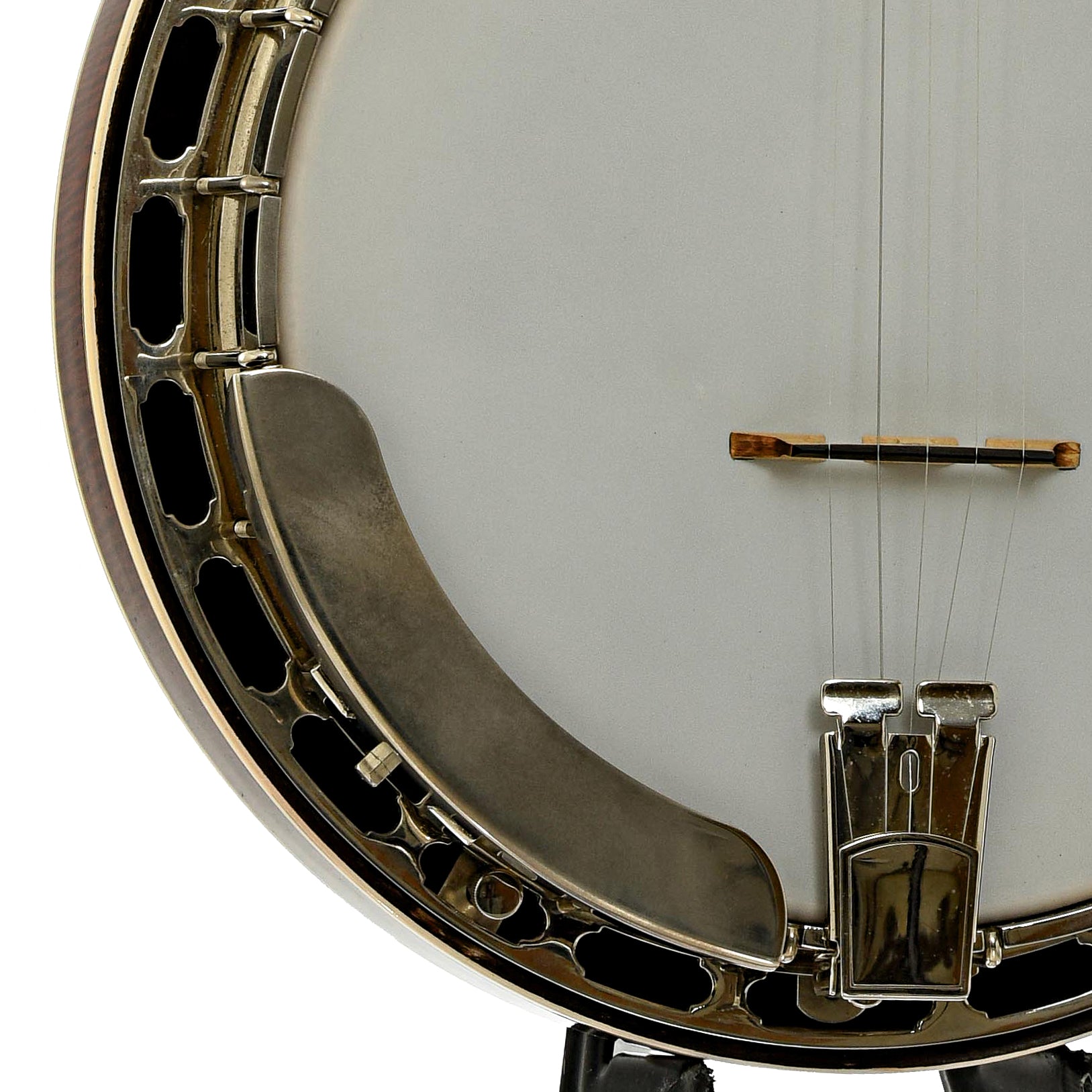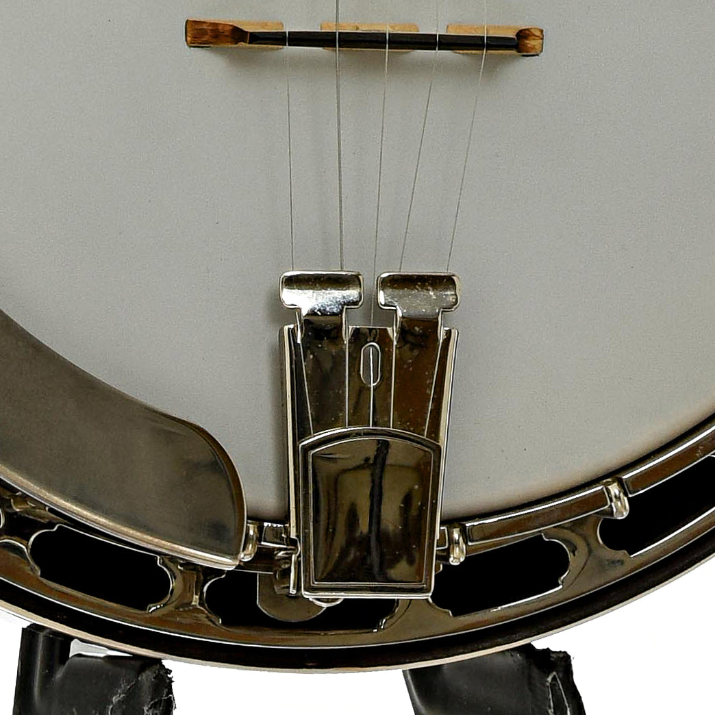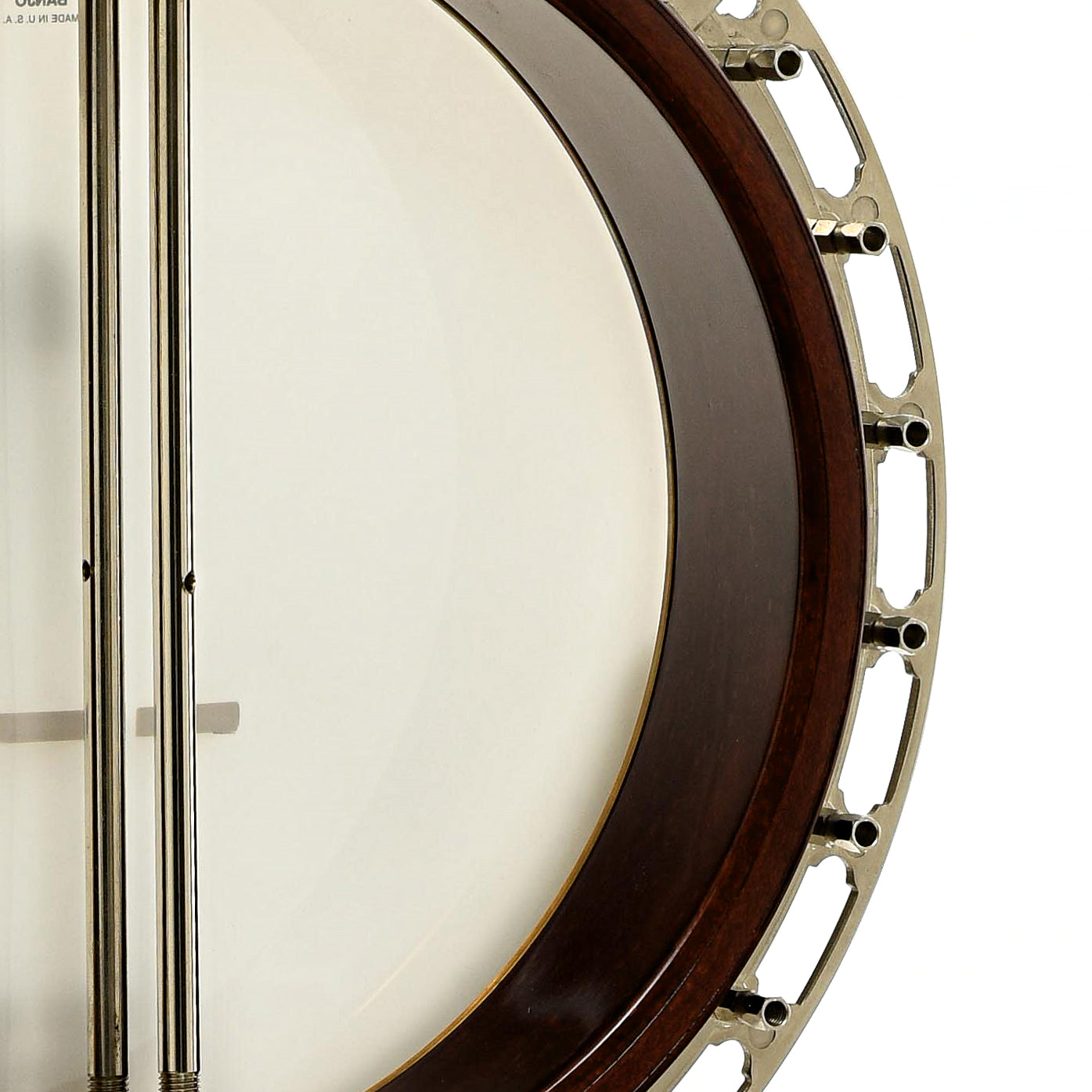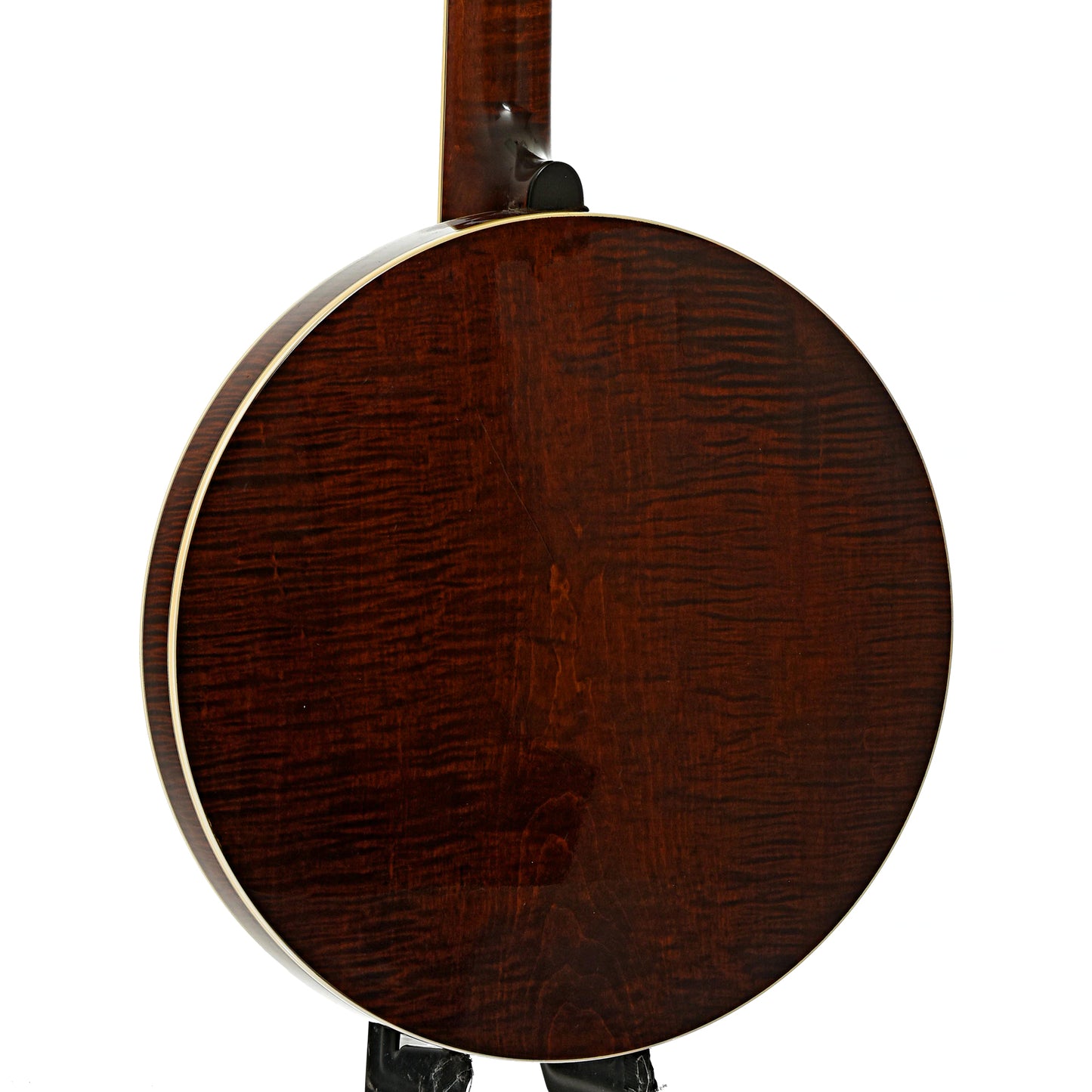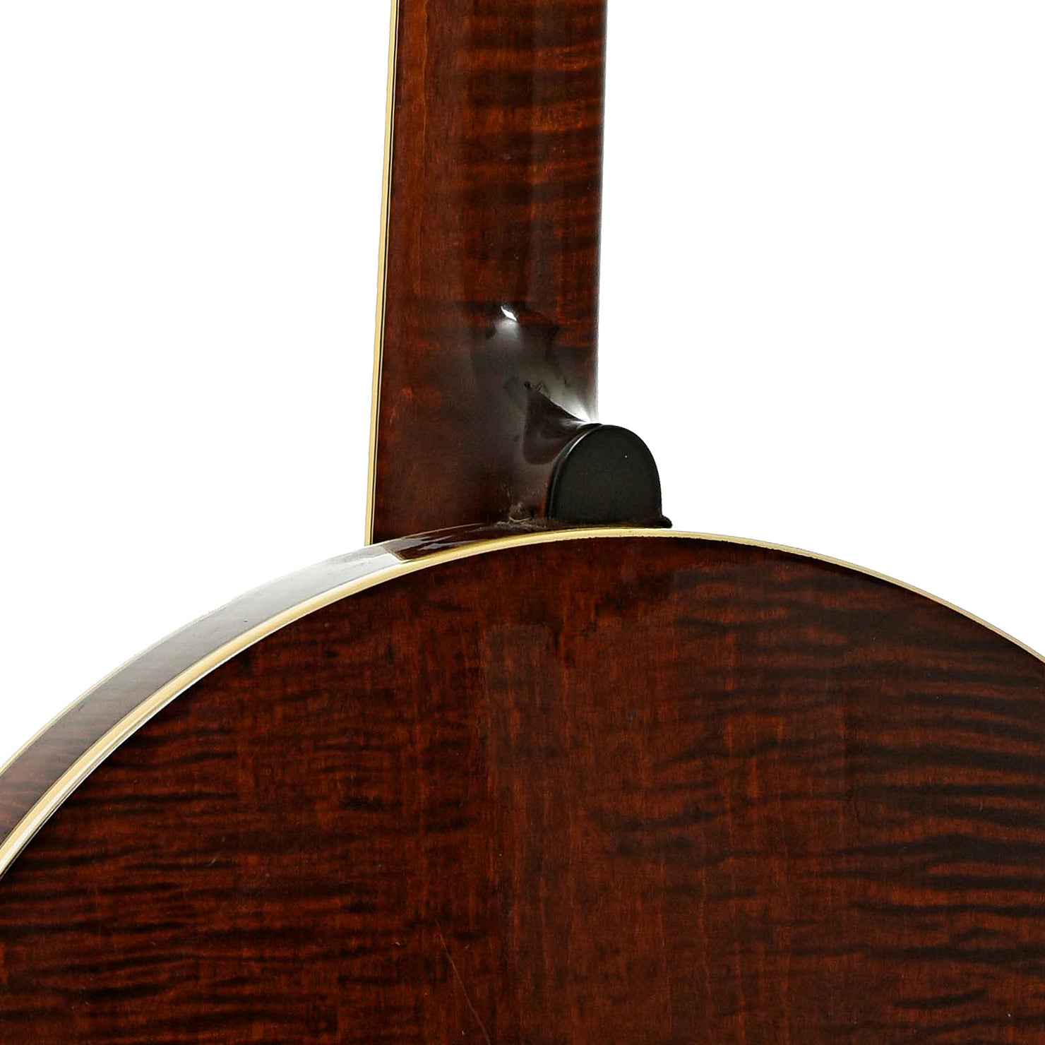 A rare find, this Belltone Legacy resonator has a loud tone, with its maple resonator and flamed neck, brass 20-hole flathead tone ring on 3-piece maple rim, Five Star planetary tuners, with a bound ebony fingerboard featuring hearts and flowers pearl inlay. AVS hard shell case. Handcrafted in the U.S.A. by Gene Elkins.