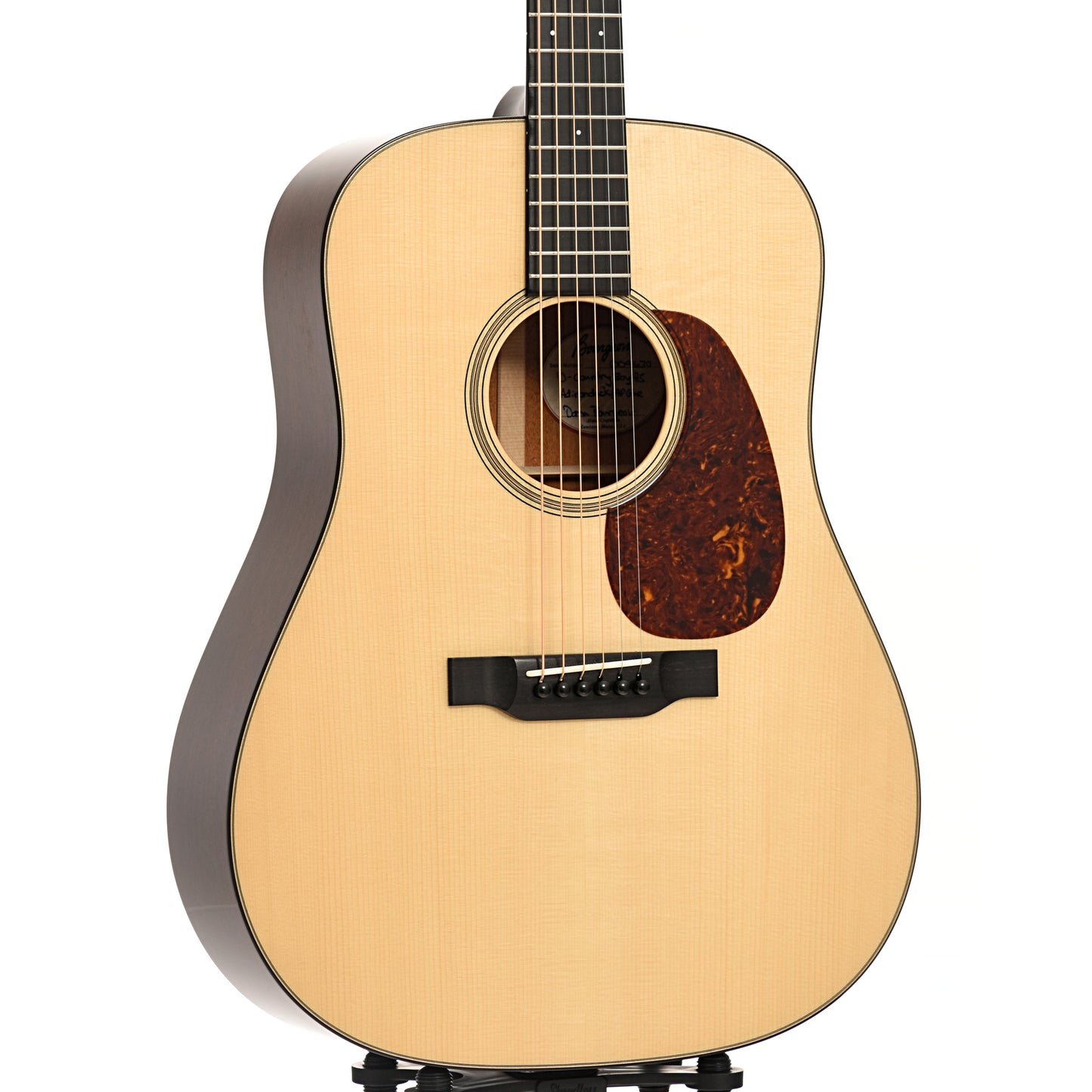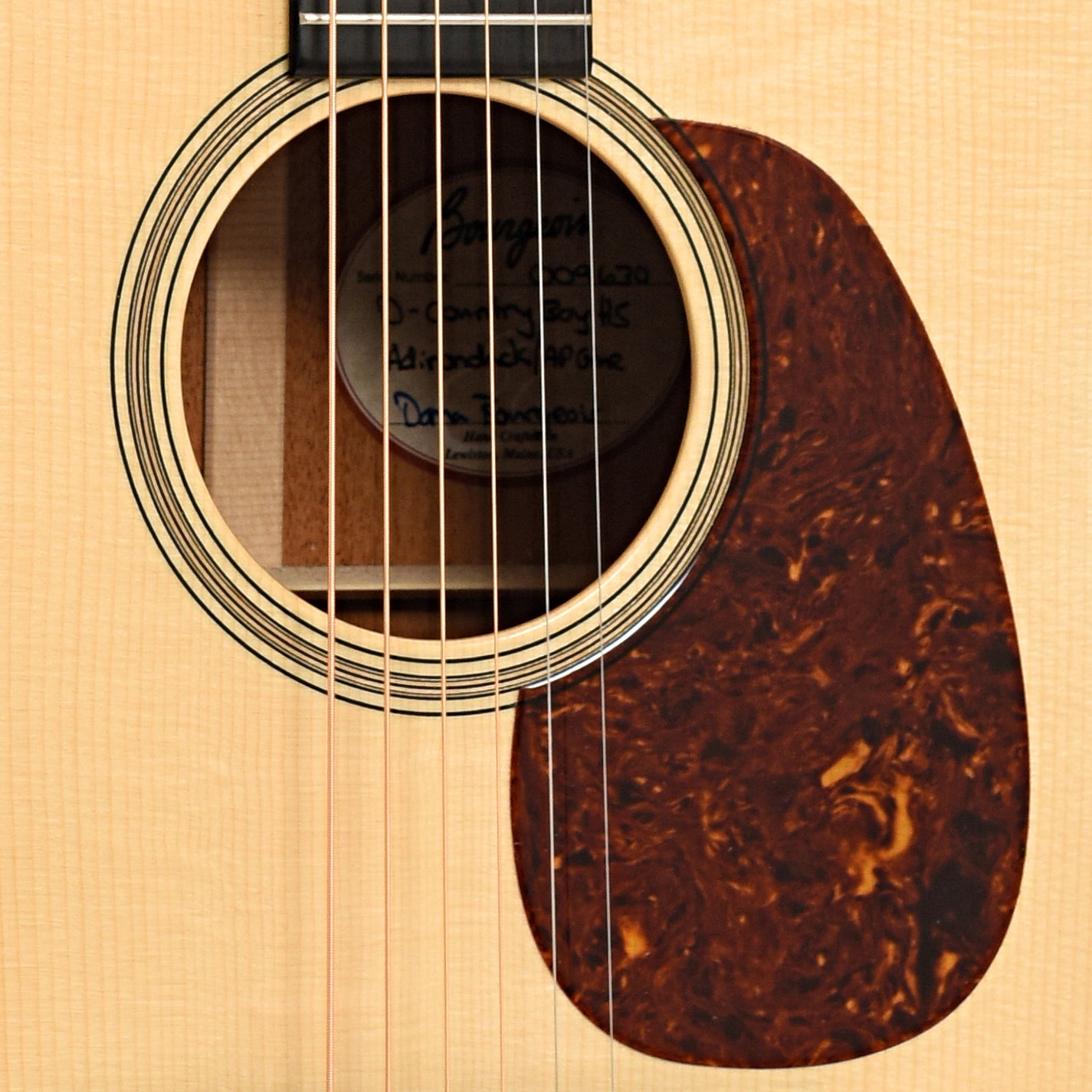 This gleaming dreadnought by Bourgeois features an Adirondack spruce top, animal protein glue, mahogany back and sides, ebony fingerboard and bridge, 30's style appointments of rosette, top purfling and celluloid tortoise pickguard. This beauty is hard to put down! Original hard shell case. Made in USA.