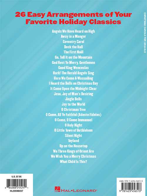 Take your uke along while dashing to your holiday gatherings this year and don't forget to bring this essential collection of 26 holiday classics: "Away in a Manger," "Deck the Hall," "God Rest Ye Merry, Gentlemen," "Good King Wenceslas," "Hark! the Herald Angels Sing," "Jingle Bells," "Joy to the World," "O Christmas Tree," "Up on the Housetop," "What Child Is This?" more. Melody and lyrics with chord diagrams. 43 pp.