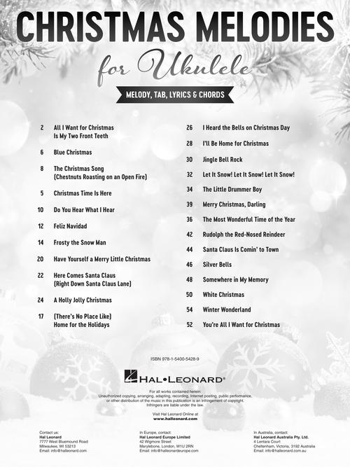 25 top tunes for the holidays in standard G-C-E-A tuning for ukulele: Blue Christmas, Christmas Time Is Here, Frosty the Snow Man, Have Yourself a Merry Little Christmas, I'll Be Home for Christmas, The Little Drummer Boy, The Most Wonderful Time of the Year, Rudolph the Red-Nosed Reindeer, Silver Bells, White Christmas, more. Melody, tab, lyrics & chords. 56 pp.