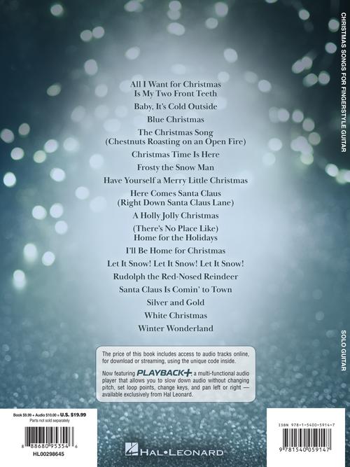 Book with online audio. 17 Christmas classics in playable arrangements for fingerstyle guitar: Blue Christmas, Christmas Time Is Here, Frosty the Snow Man, Have Yourself a Merry Little Christmas, A Holly Jolly Christmas, I'll Be Home for Christmas, Let It Snow! Let It Snow! Let It Snow!, Rudolph the Red-Nosed Reindeer, Santa Claus Is Comin' to Town, White Christmas, Winter Wonderland, more. Note/tab. 53 pp.