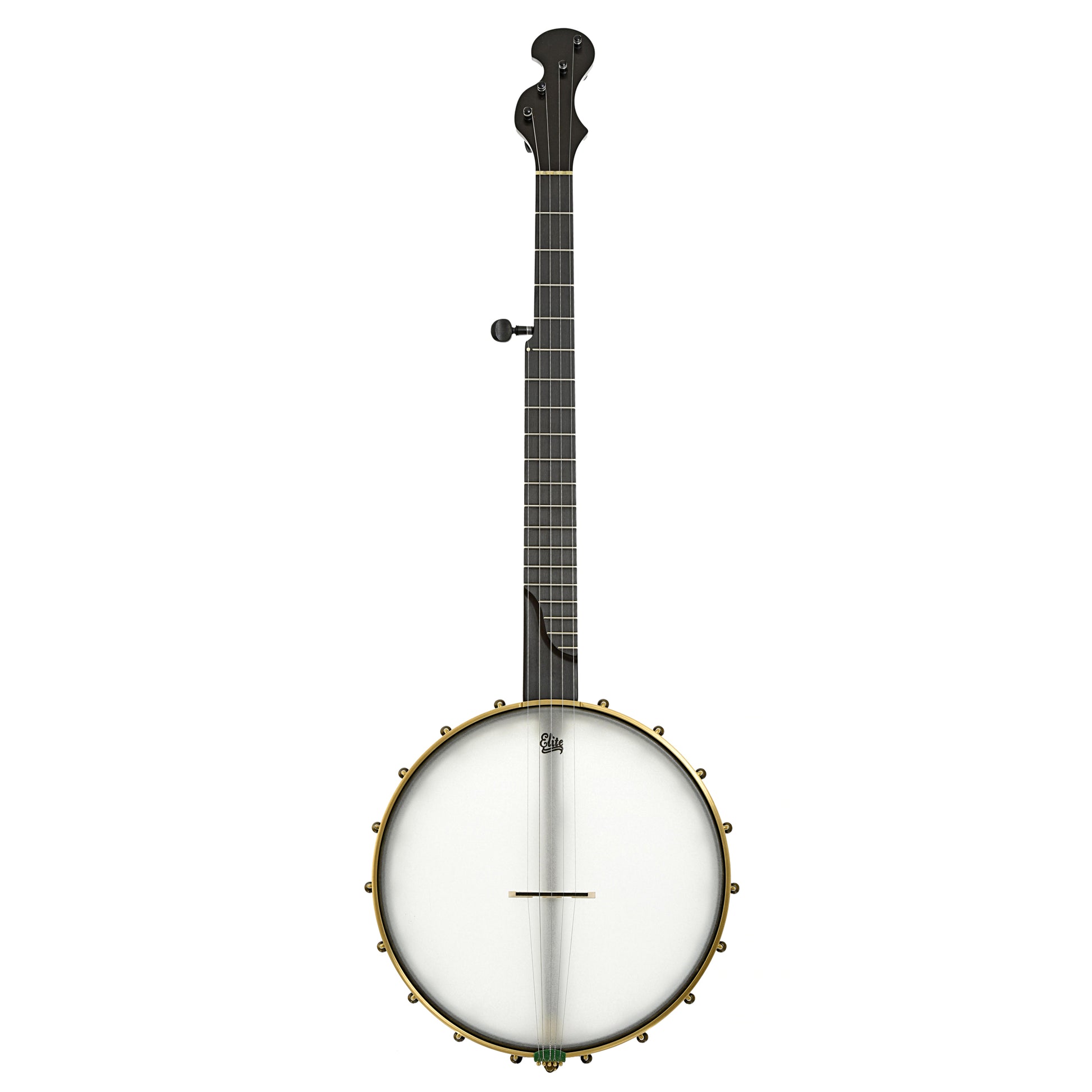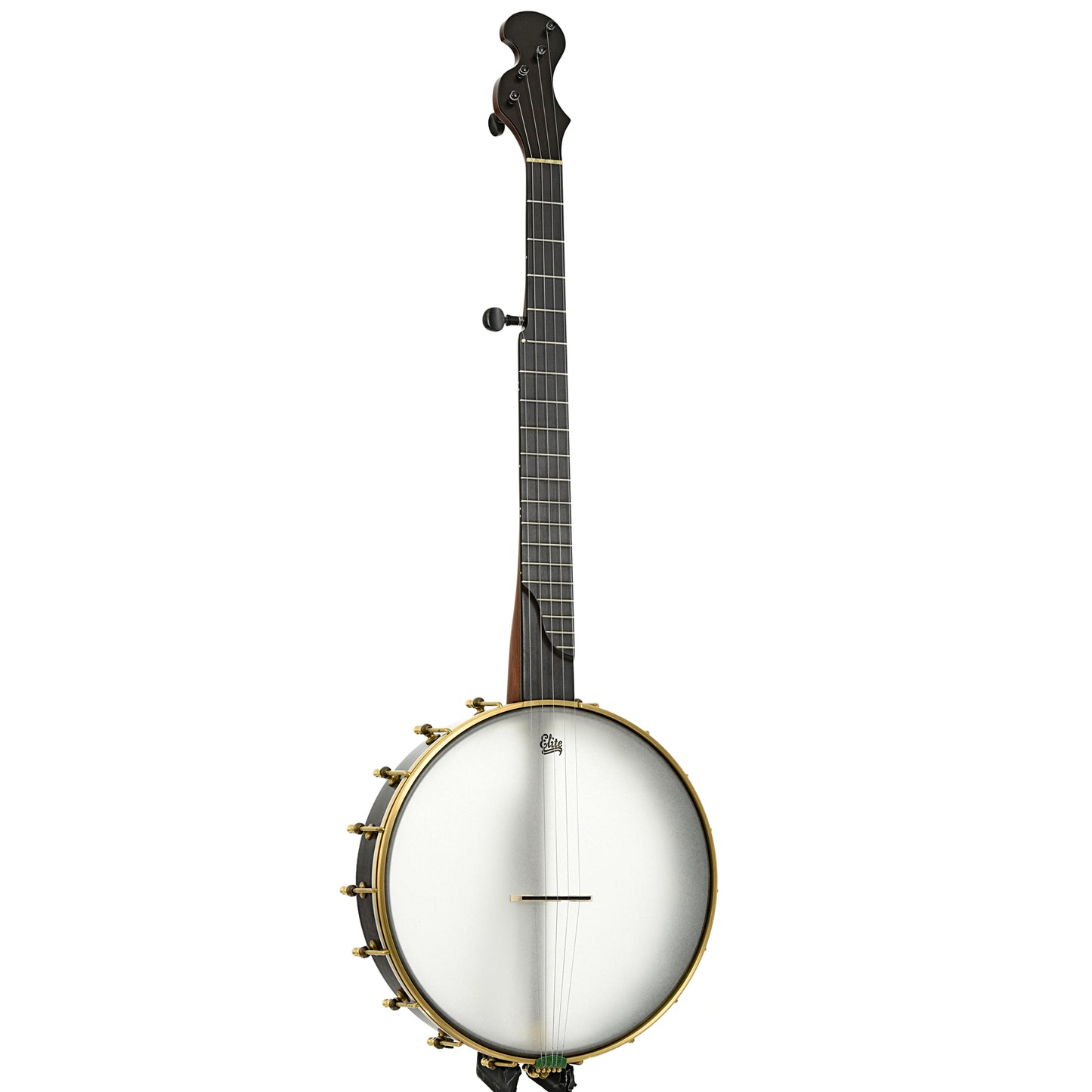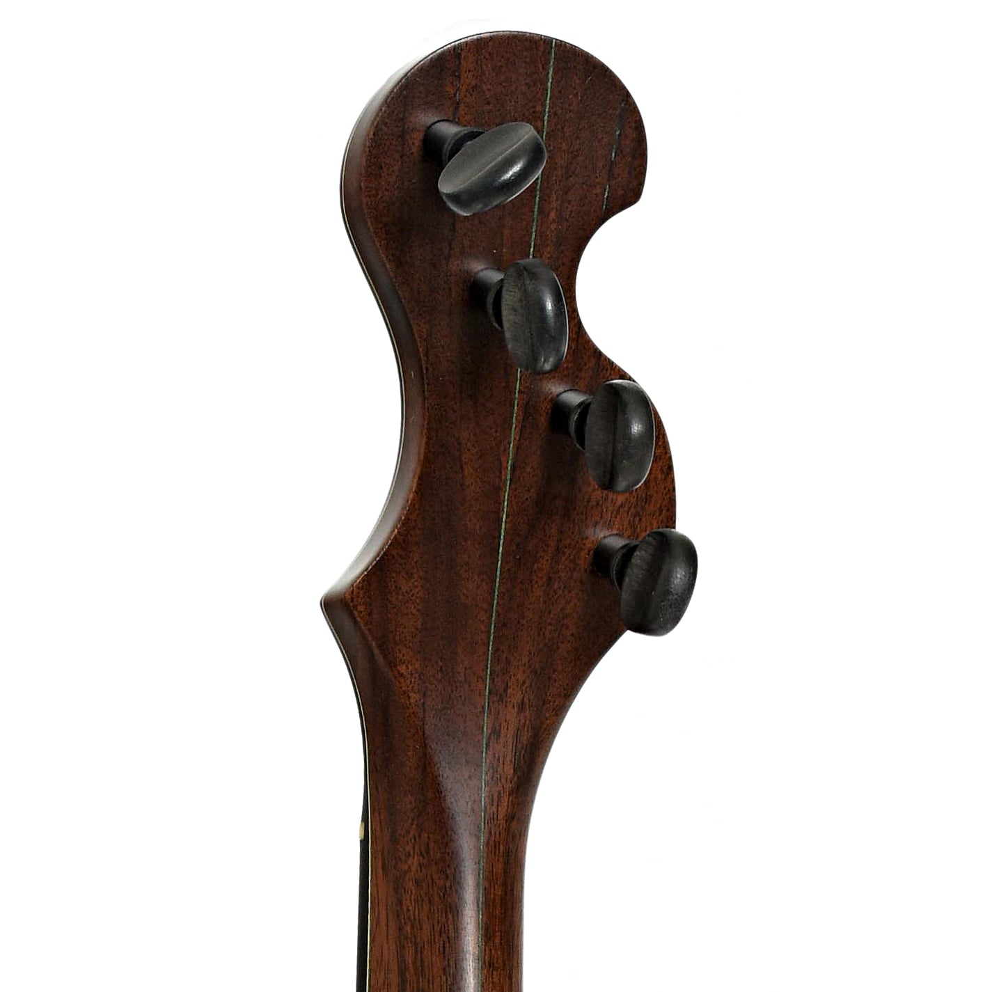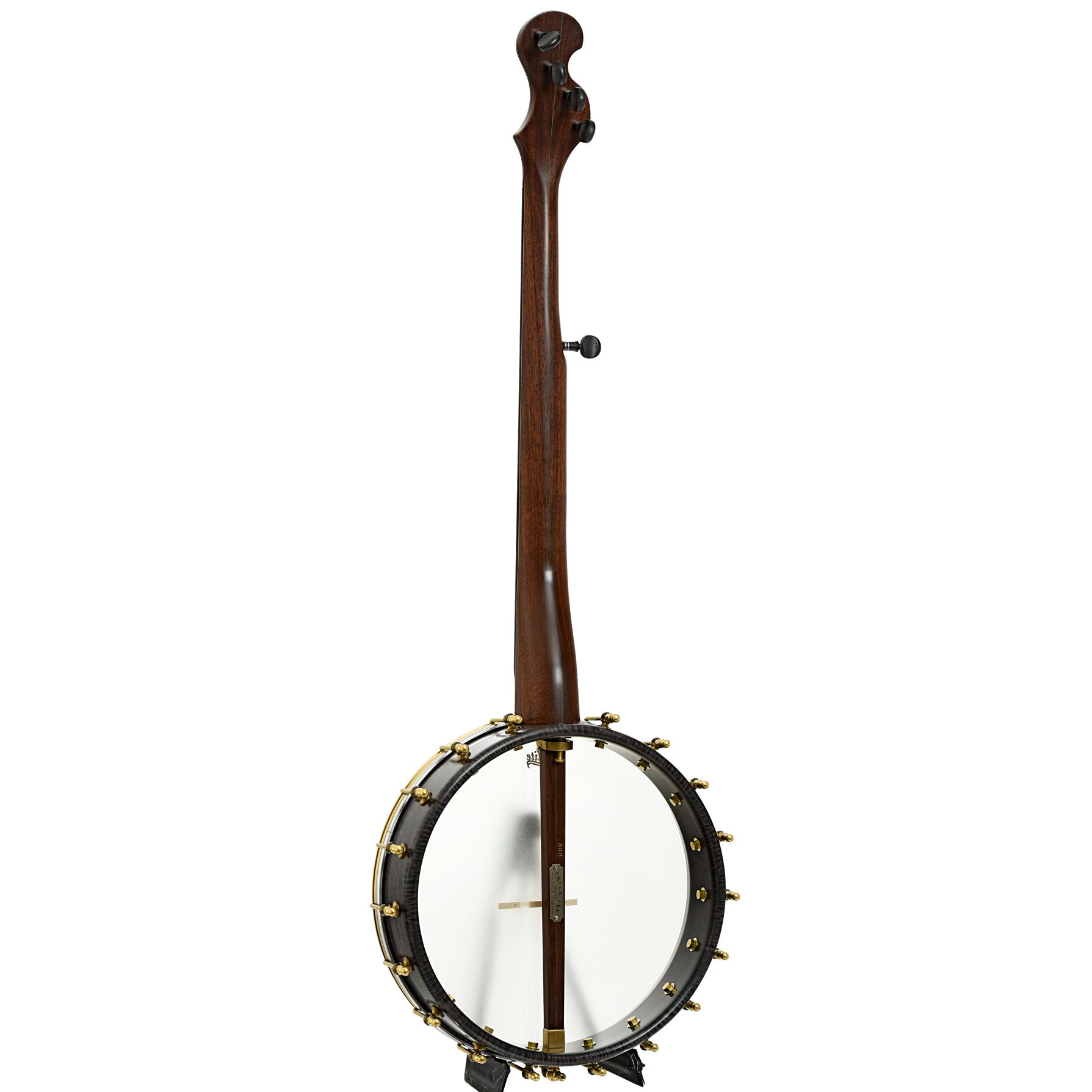 A fine example of Chuck Lee's musical artistry, Lone Star Deluxe Custom #865 features a natural walnut neck made from a tree cut down 100 years ago. To emphasize the walnut's age, Chuck has taken the perfectly sound neck blank and added forest green grain lines on the peghead top and back, trying to give the look and feel of the ancient art of Japanese Kintsugi (a mending technique for pottery). The 12” maple rim is stained black and is tapered to form the tone ring. The Hawkins Spring style S-shaped peghead has Pegheds tuners - they look like violin pegs, but are geared inside. Signature Chuck Lee tone! Handmade in Texas.