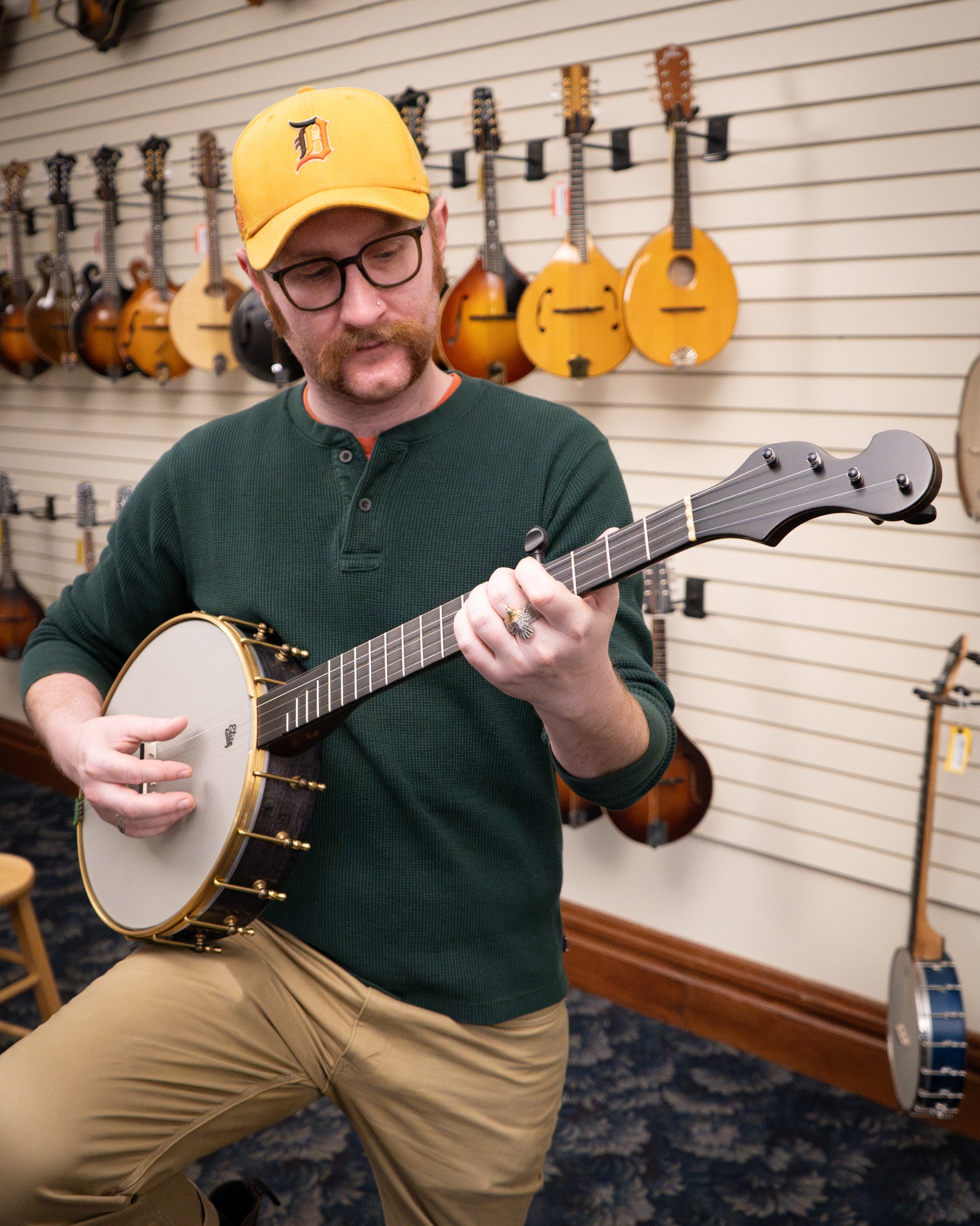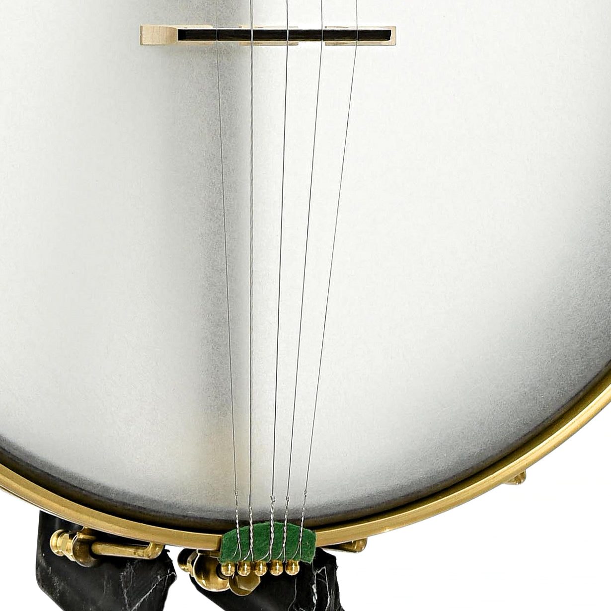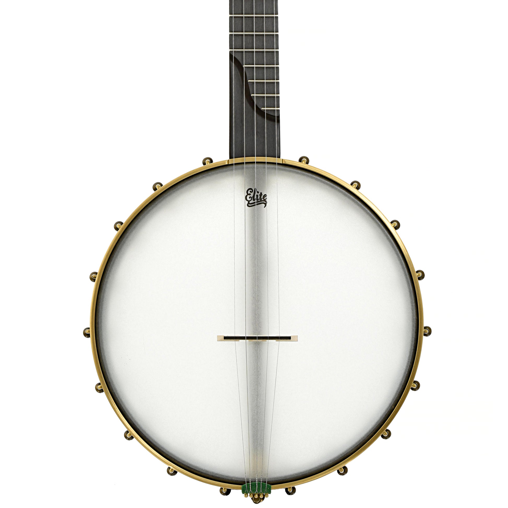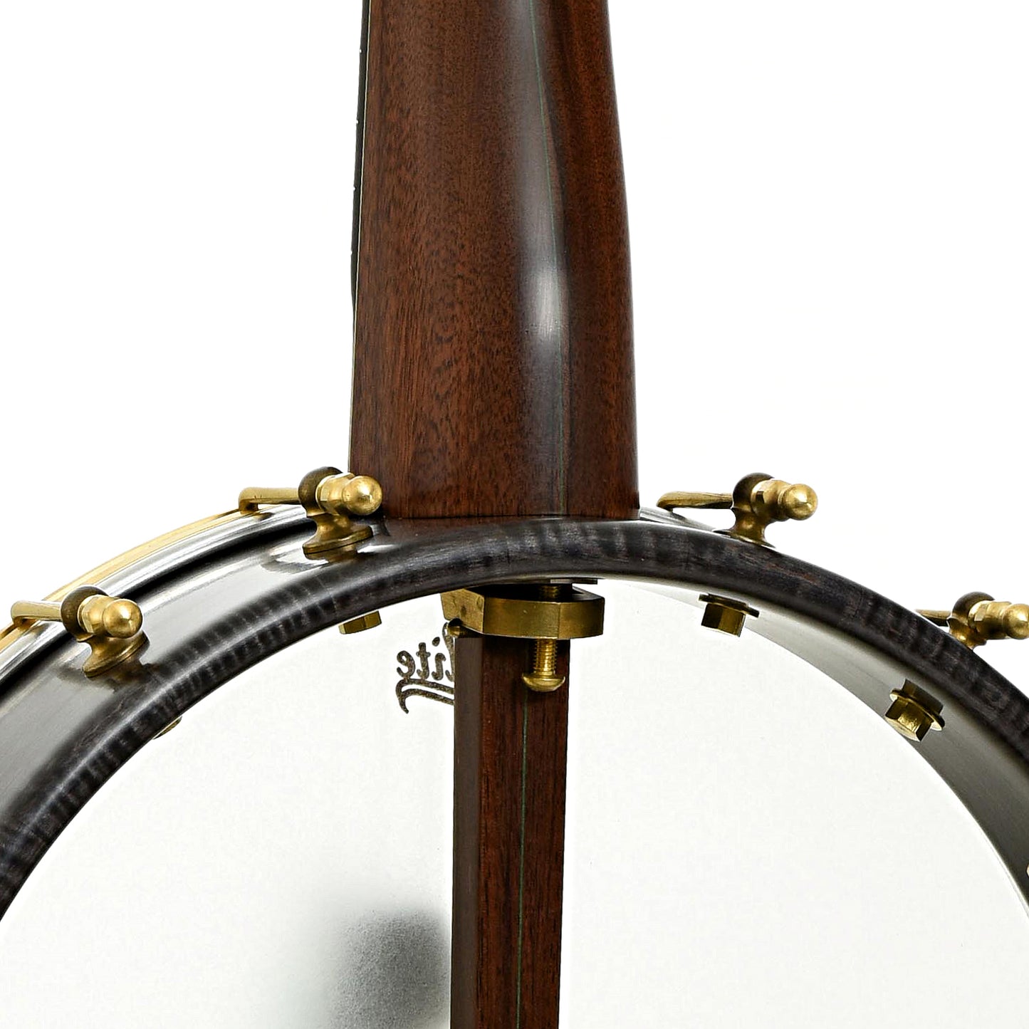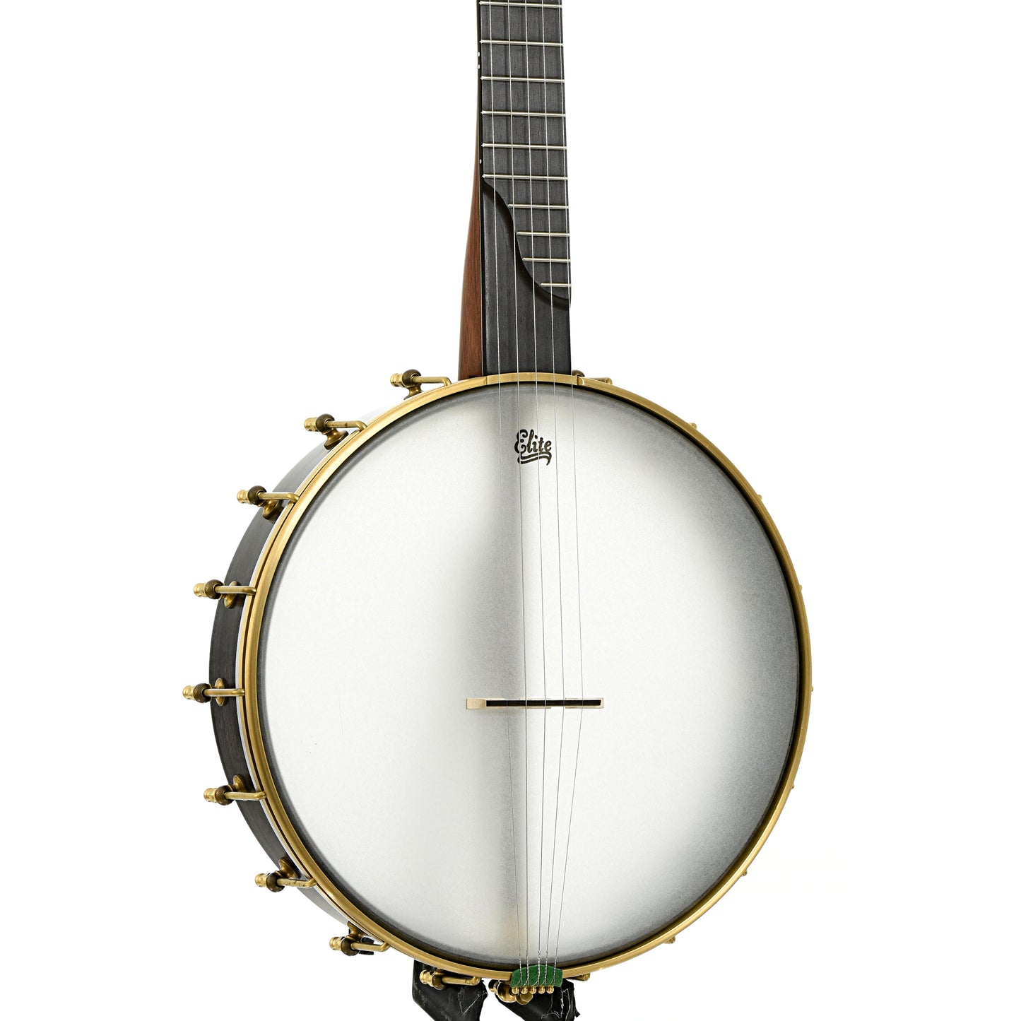 A fine example of Chuck Lee's musical artistry, Lone Star Deluxe Custom #865 features a natural walnut neck made from a tree cut down 100 years ago. To emphasize the walnut's age, Chuck has taken the perfectly sound neck blank and added forest green grain lines on the peghead top and back, trying to give the look and feel of the ancient art of Japanese Kintsugi (a mending technique for pottery). The 12” maple rim is stained black and is tapered to form the tone ring. The Hawkins Spring style S-shaped peghead has Pegheds tuners - they look like violin pegs, but are geared inside. Signature Chuck Lee tone! Handmade in Texas.