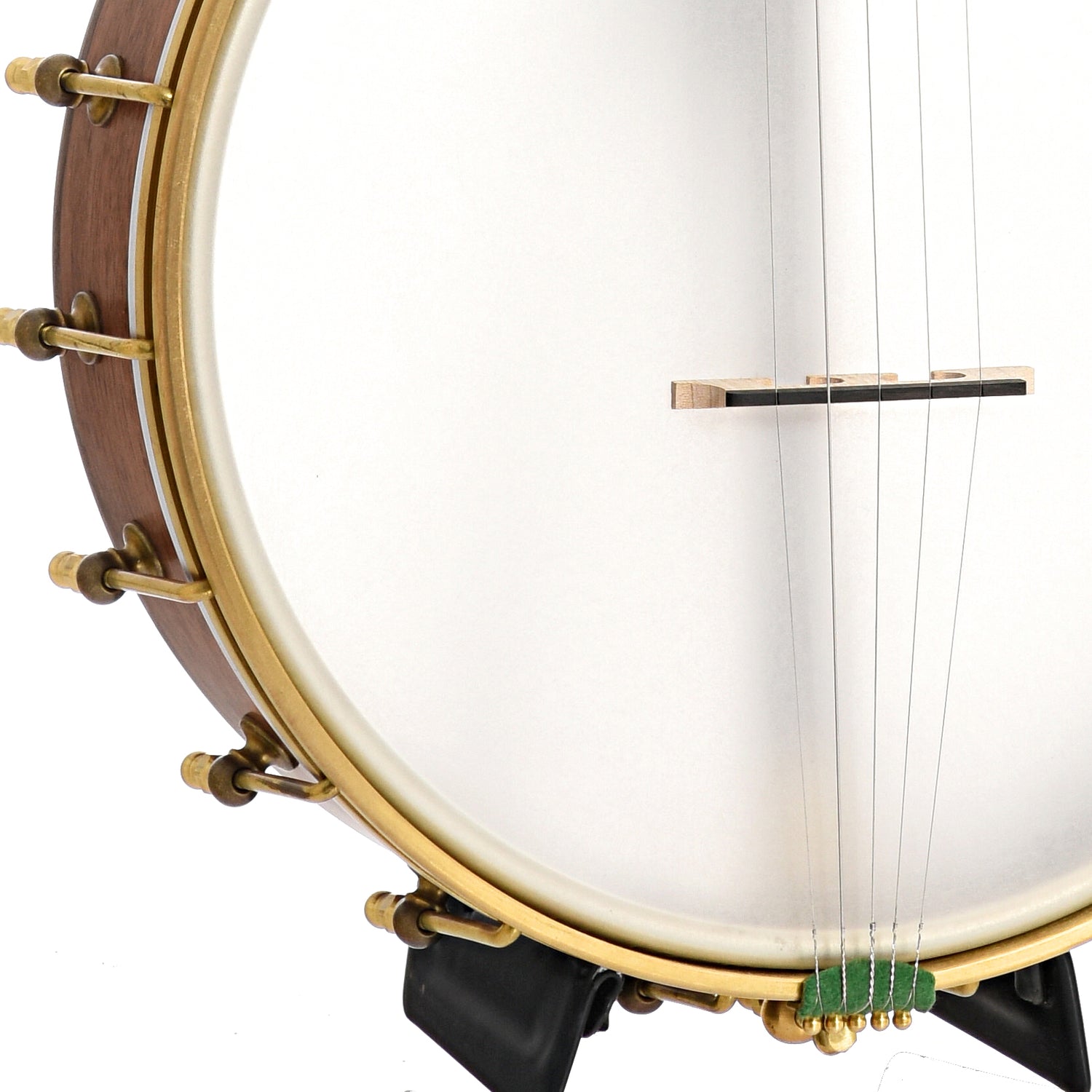 Chuck Lee has an eye for woods and an ear for tone. This all-walnut banjo's understated look puts emphasis on the beauty of burled grain. The Electric (Whyte Laydie) tone ring provides dynamic and punchy tone. Raw brass hardware includes a side-grooved tension hoop (no hooks on top), for playing comfort without armrest, Peghed tuning gears look like violin pegs, but are geared inside.