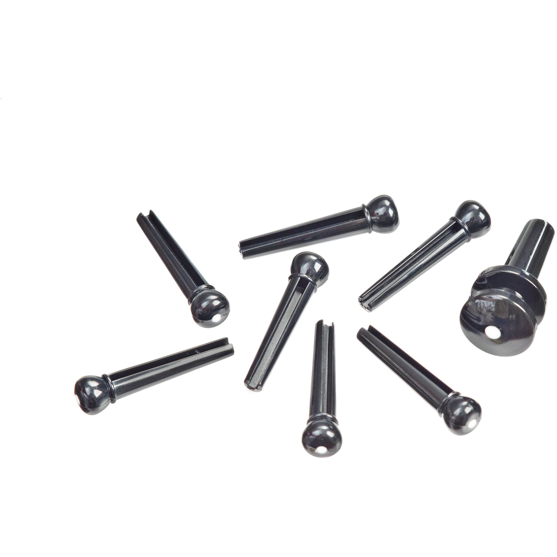 7 slotted plastic bridge pins and 1 plastic end pin; black with ivory dot.