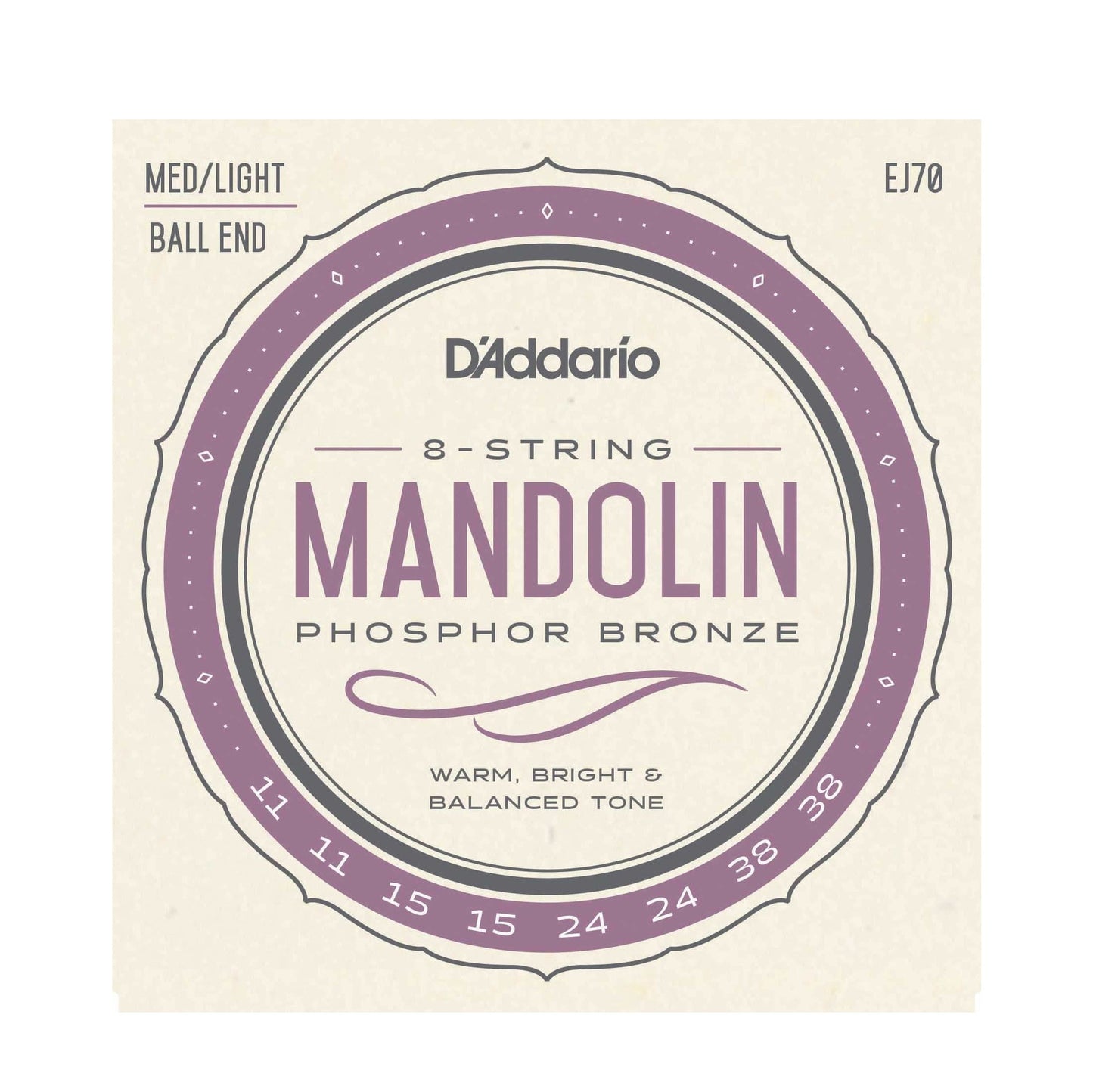 D'Addario's EJ70 is designed for mandolins requiring ball ends. EJ70's contain the E and A strings from a medium gauge mandolin set with the slightly lighter D and G strings from a light gauge set. Phosphor bronze construction provides an ideal balance of warmth, brightness, and overall balanced tone.