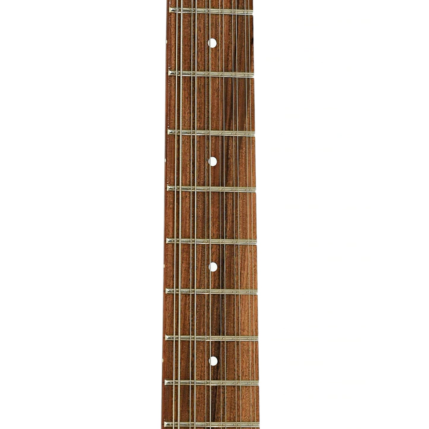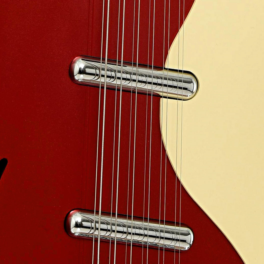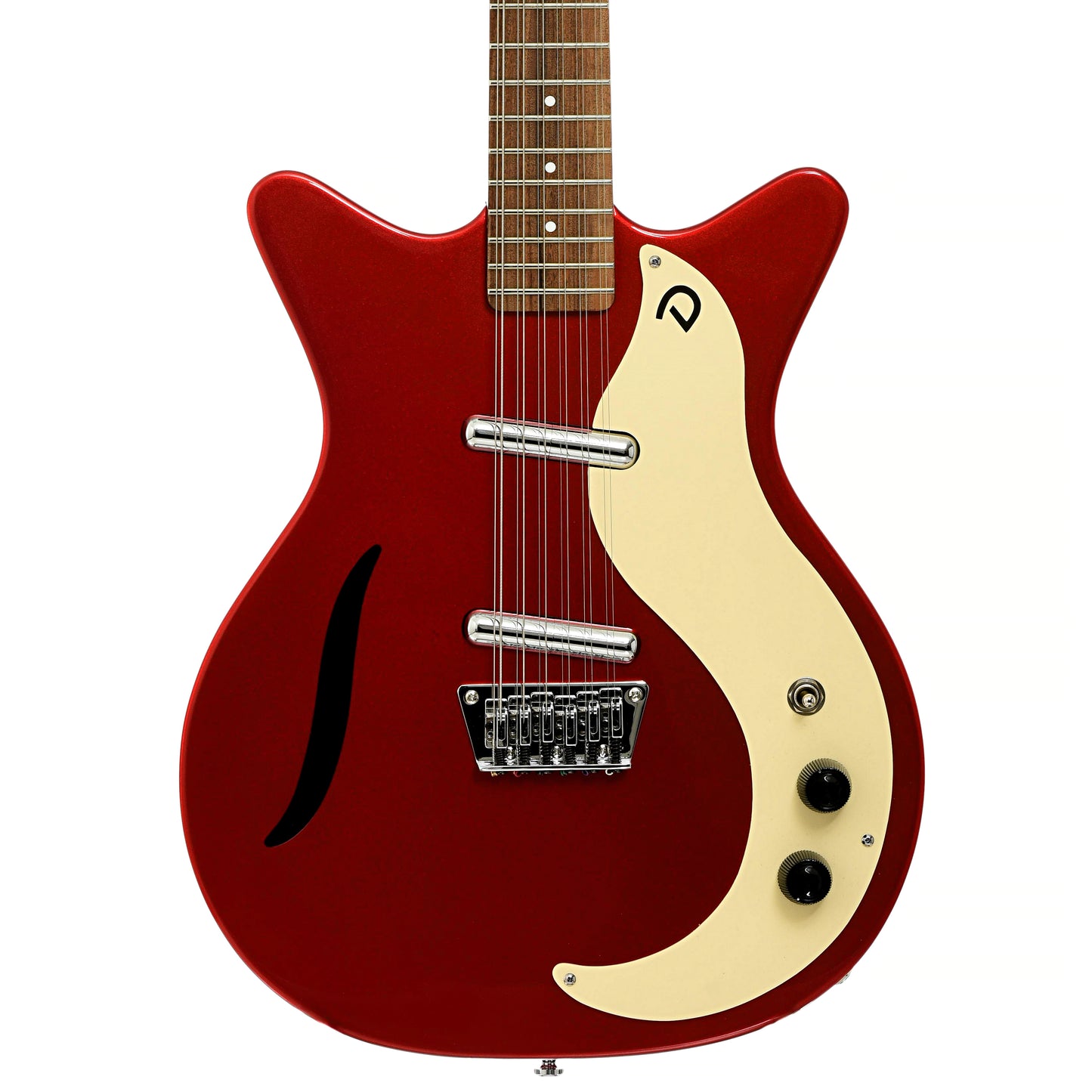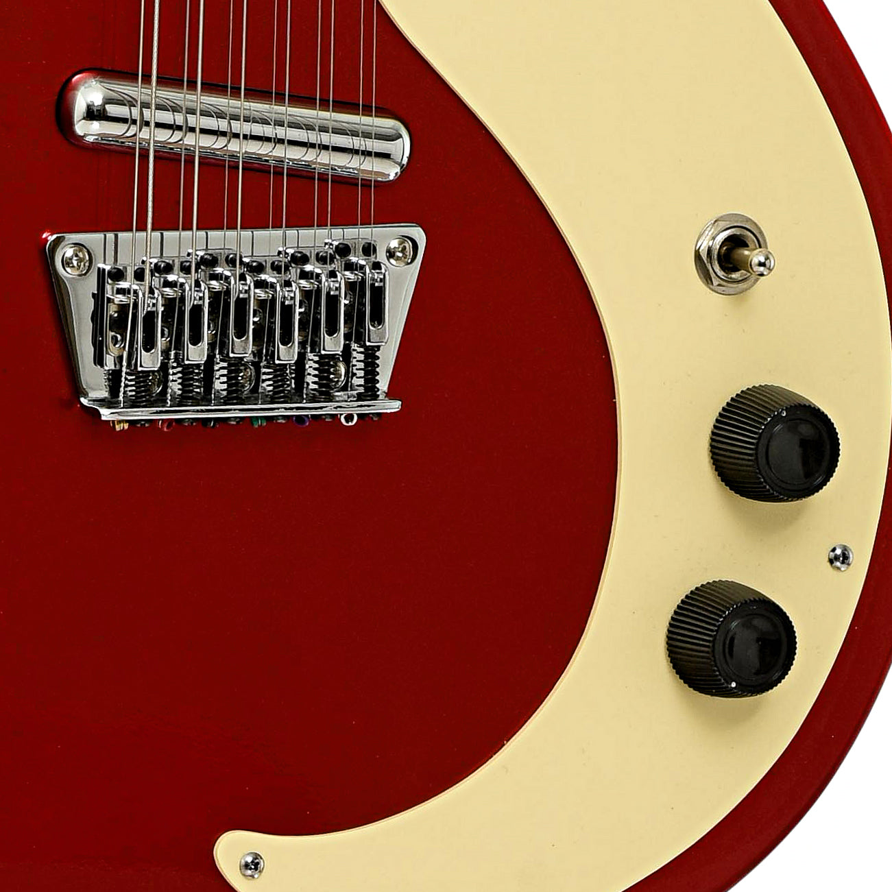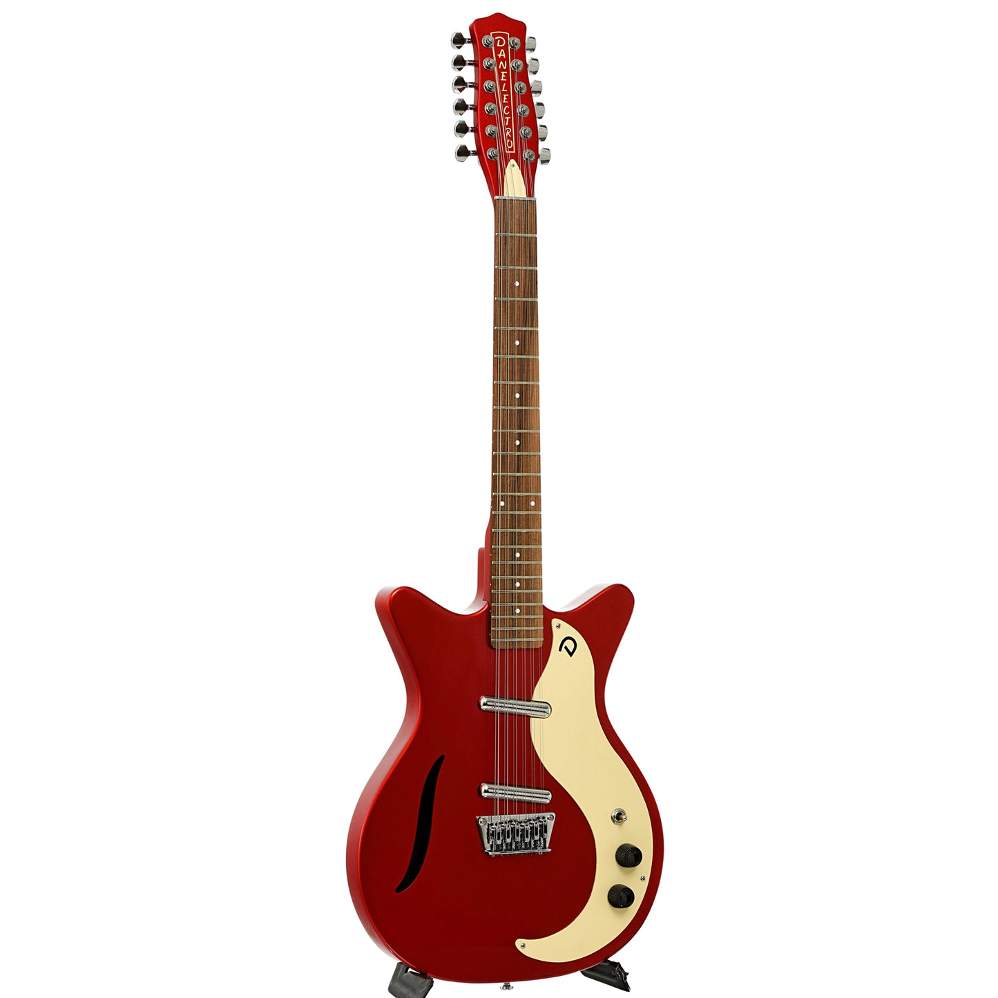 This 12-string Danelectro looks cool with its Red Metallic finish on a spruce and hardboard body. It sounds nice and jangly, thanks to dual single-coil "lipstick" pickups. Features include a bolt-on maple neck, Pau Ferro fingerboard, adjustable 2-point bridge, and individual diecast tuners. Comes with a Line 6 gigbag. Import.
