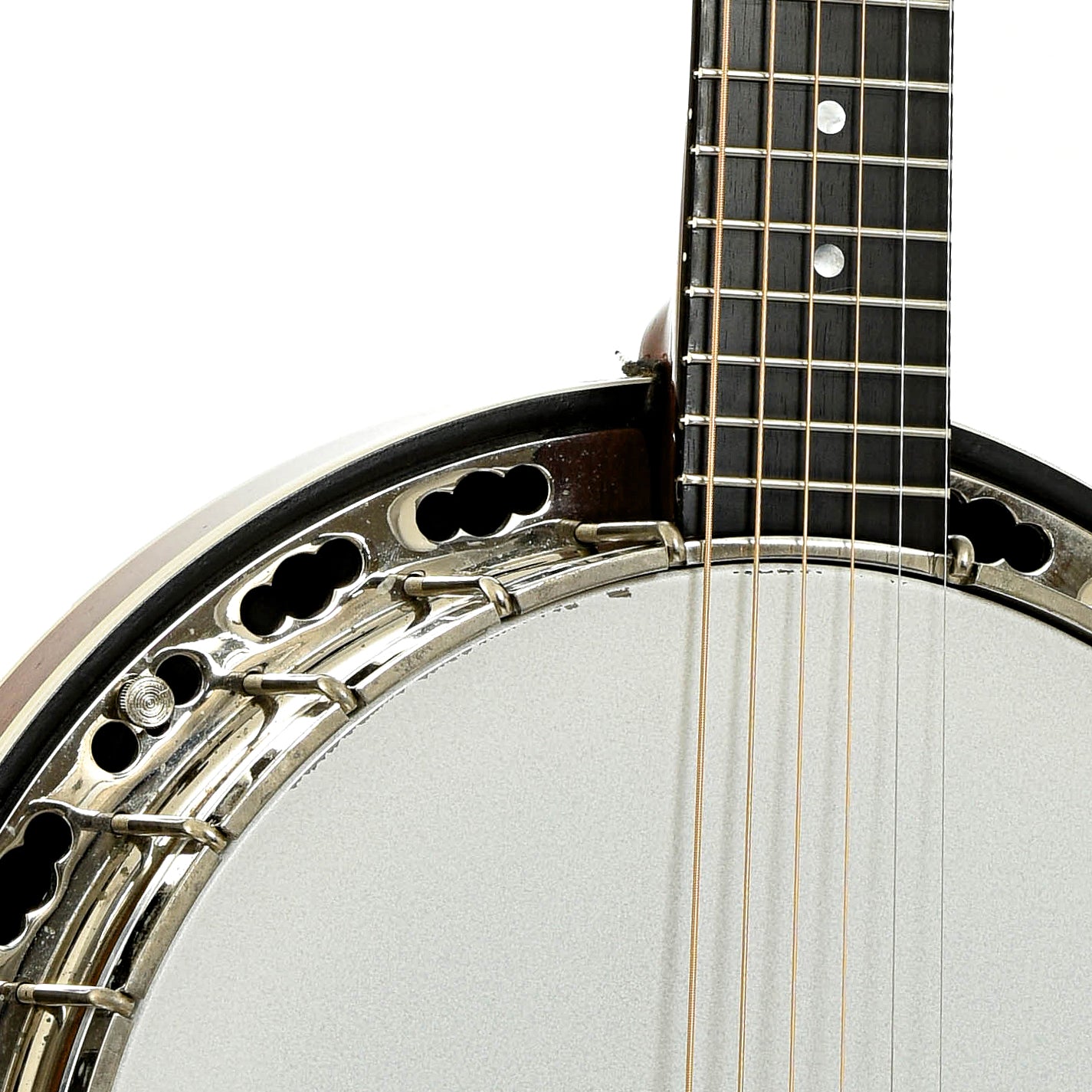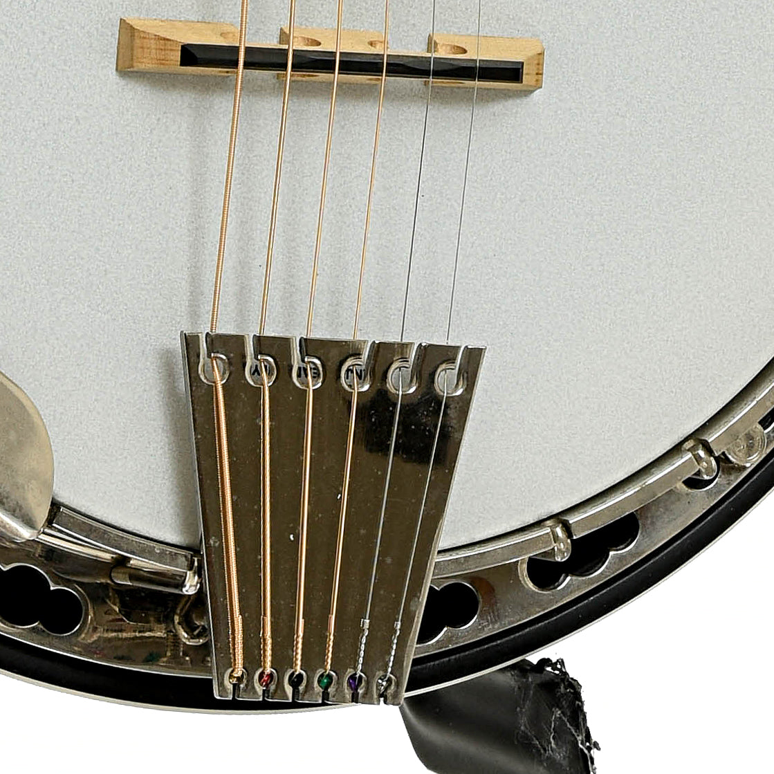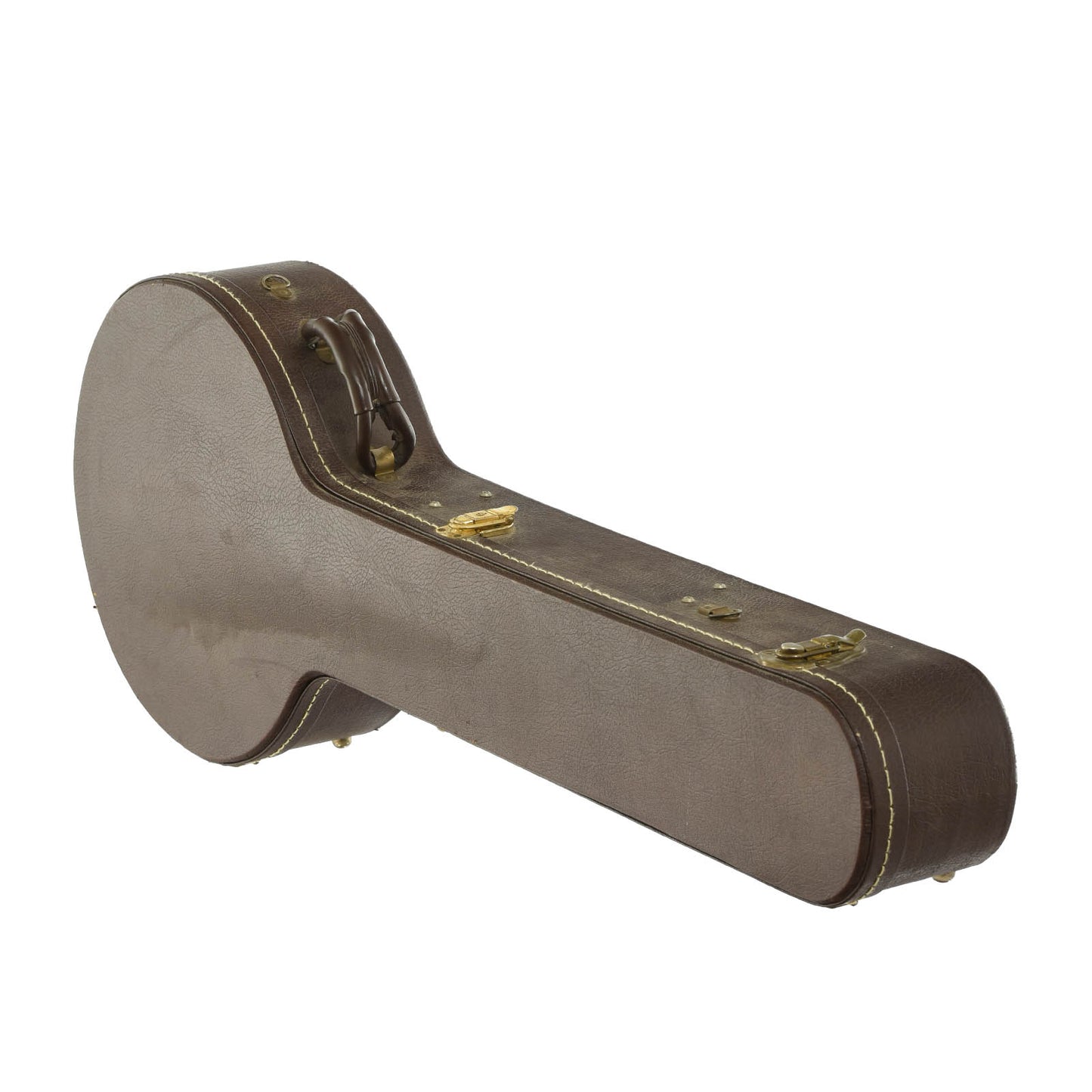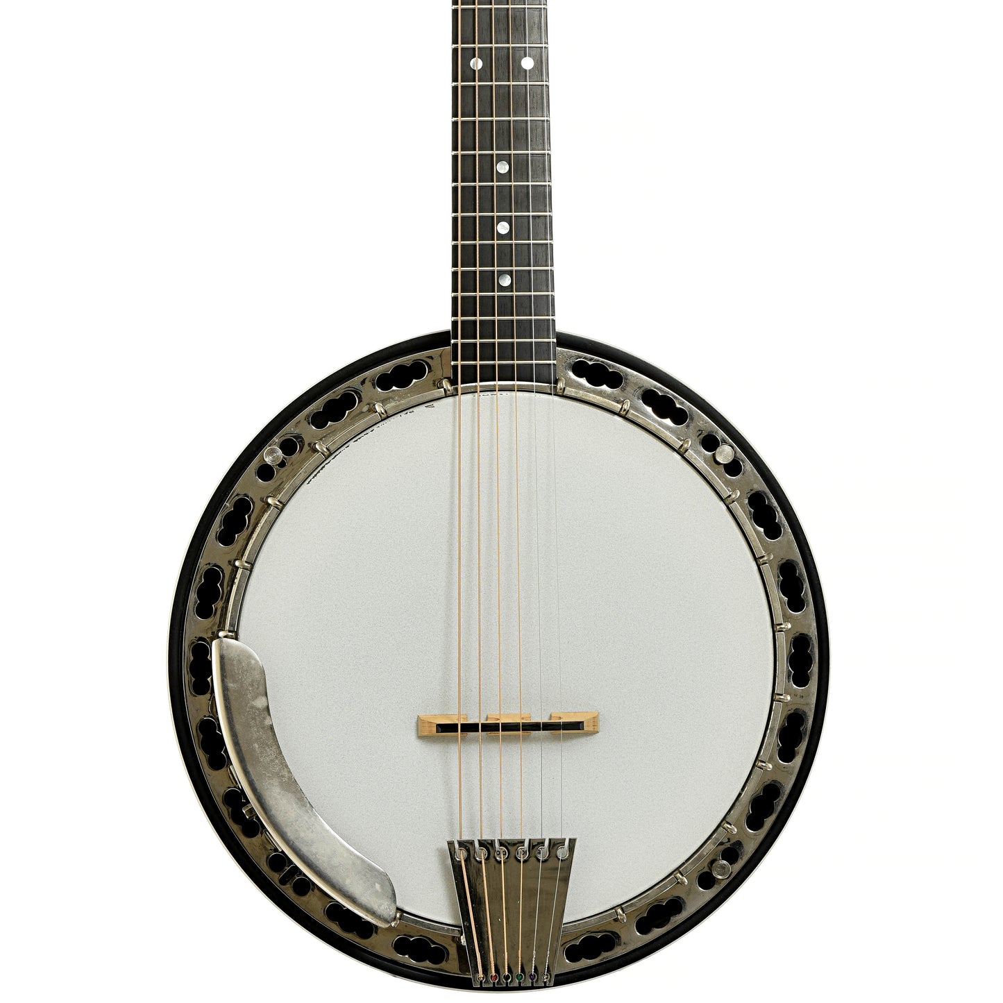 Guitarists, your banjo has arrived! This hybrid instrument gives guitarists that classic banjo sound but in the familiar guitar tuning. Features on this D-6 Deluxe include a mahogany neck and resonator, no-hole flathead tone ring on maple rim, 24 brackets, 11" frosted head, Kershner-style tailpiece, Grover tuners and a radiused ebony fingerboard with inlay. Made in USA. On consignment.