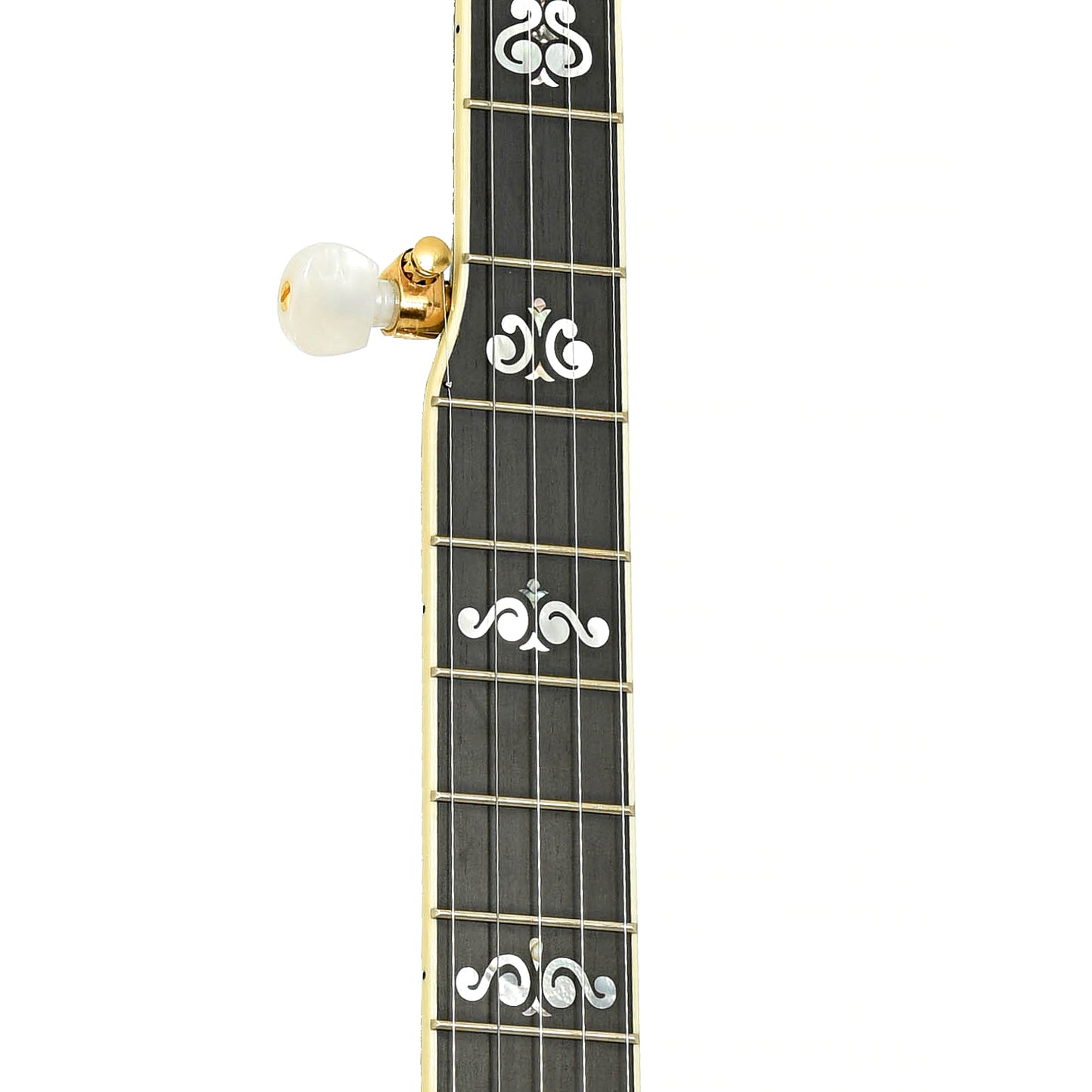 - Bound and purfled ebony peghead overlay features fancy pearl and abalone logo inlay