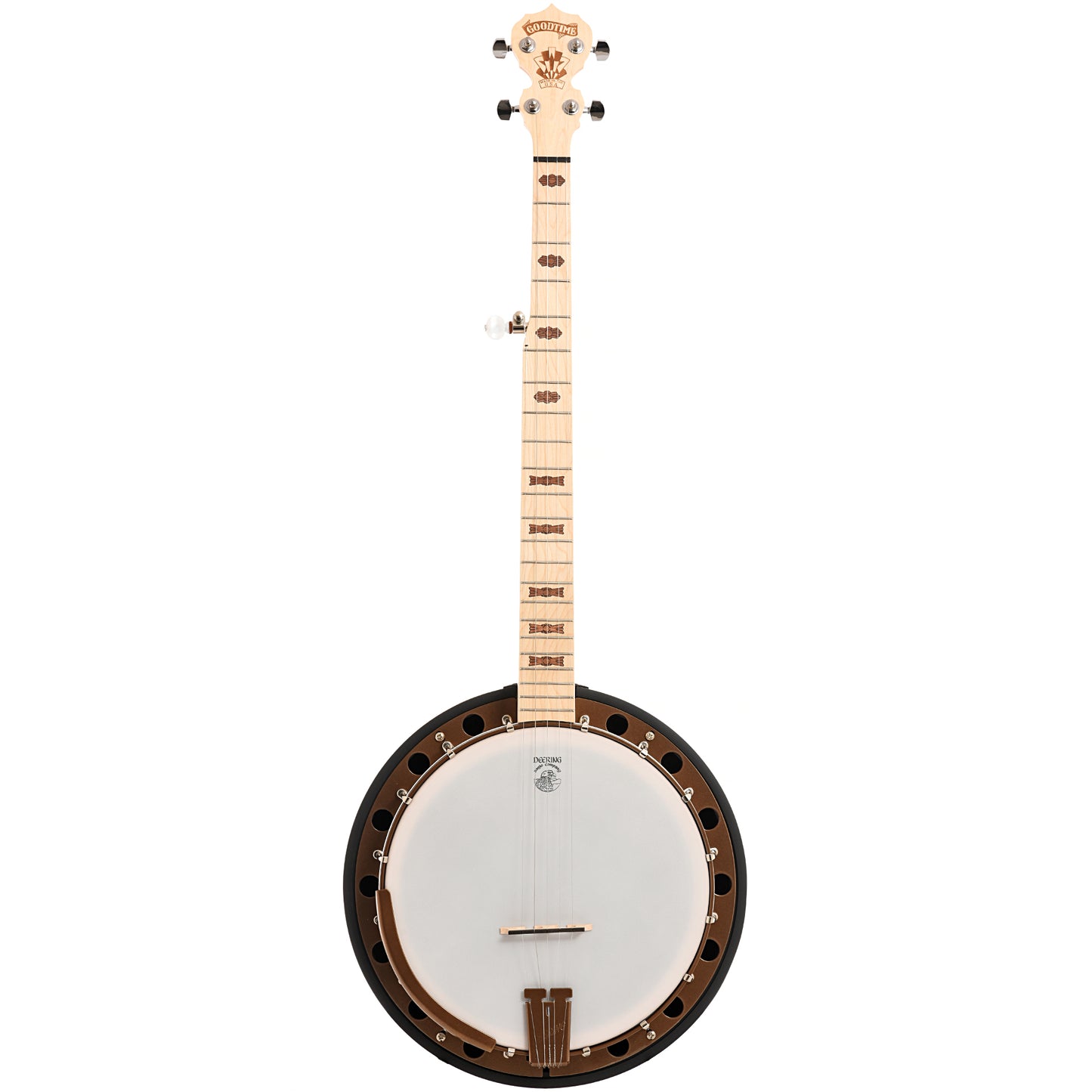 The Deering Goodtime Two is an excellent entry level resonator banjo. With its vibrant tone and extra-good good looks, it is ideal for a student interested in bluegrass-style playing. Hardware is bronze-colored with nickel hooks & nuts. Art Deco style inlays. Made in USA.