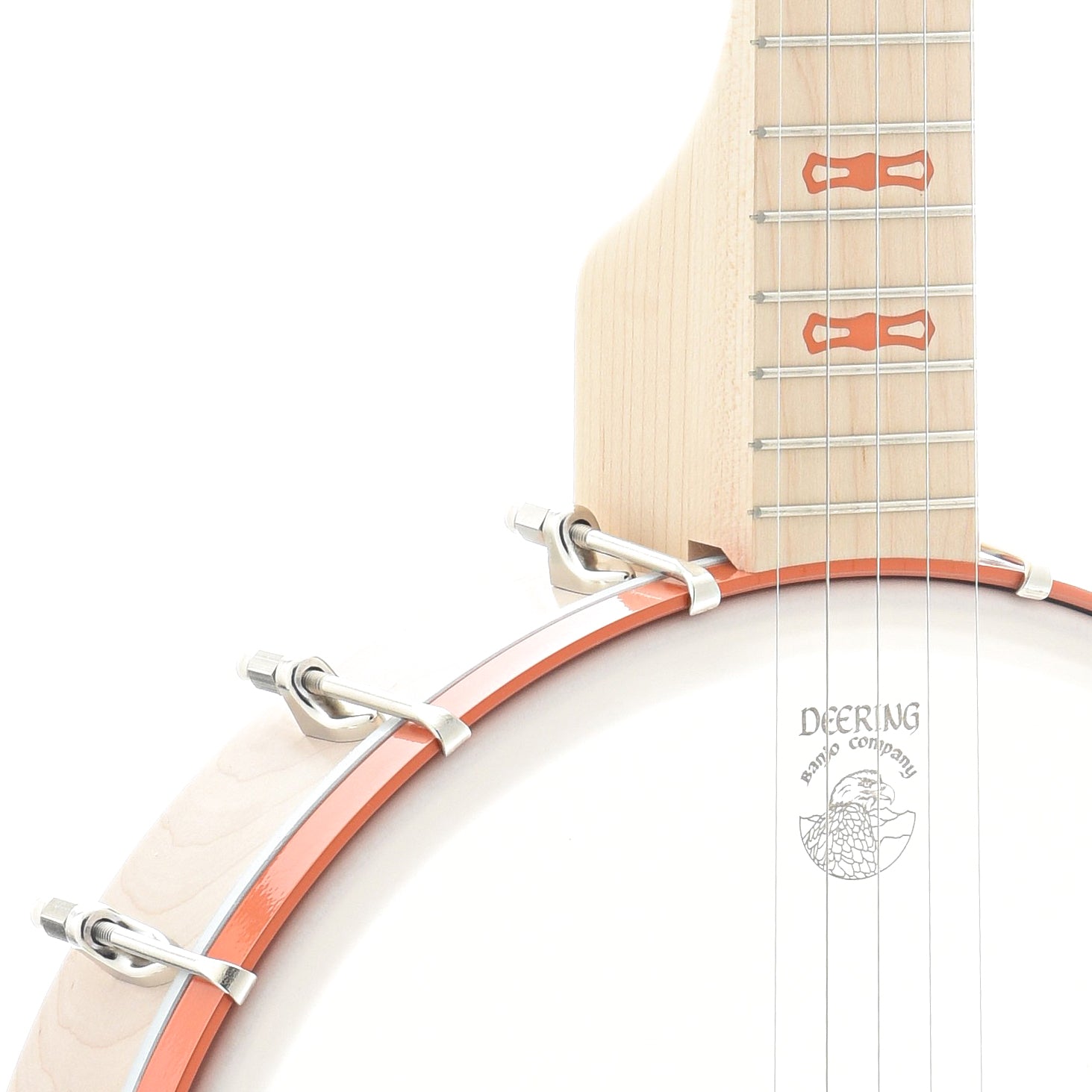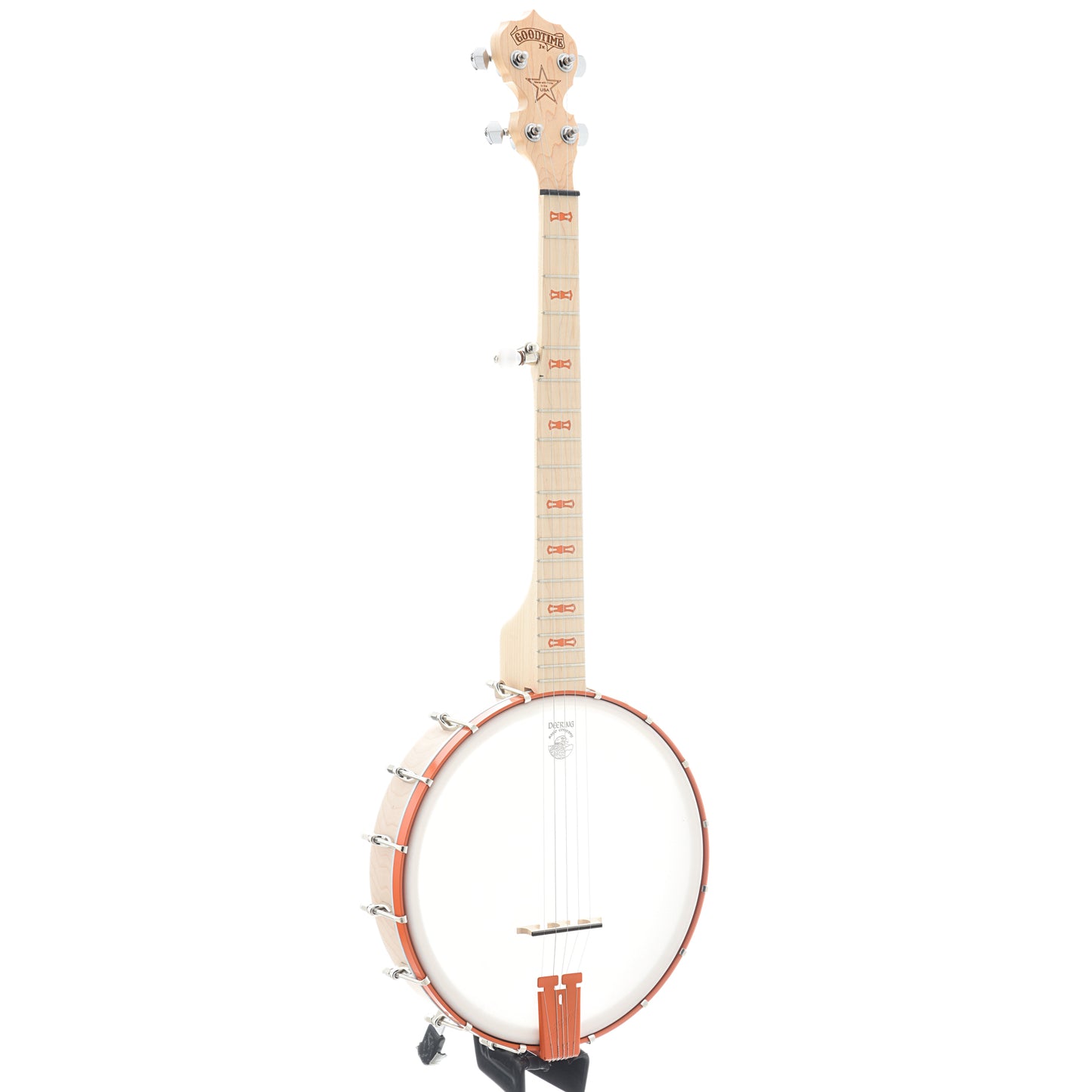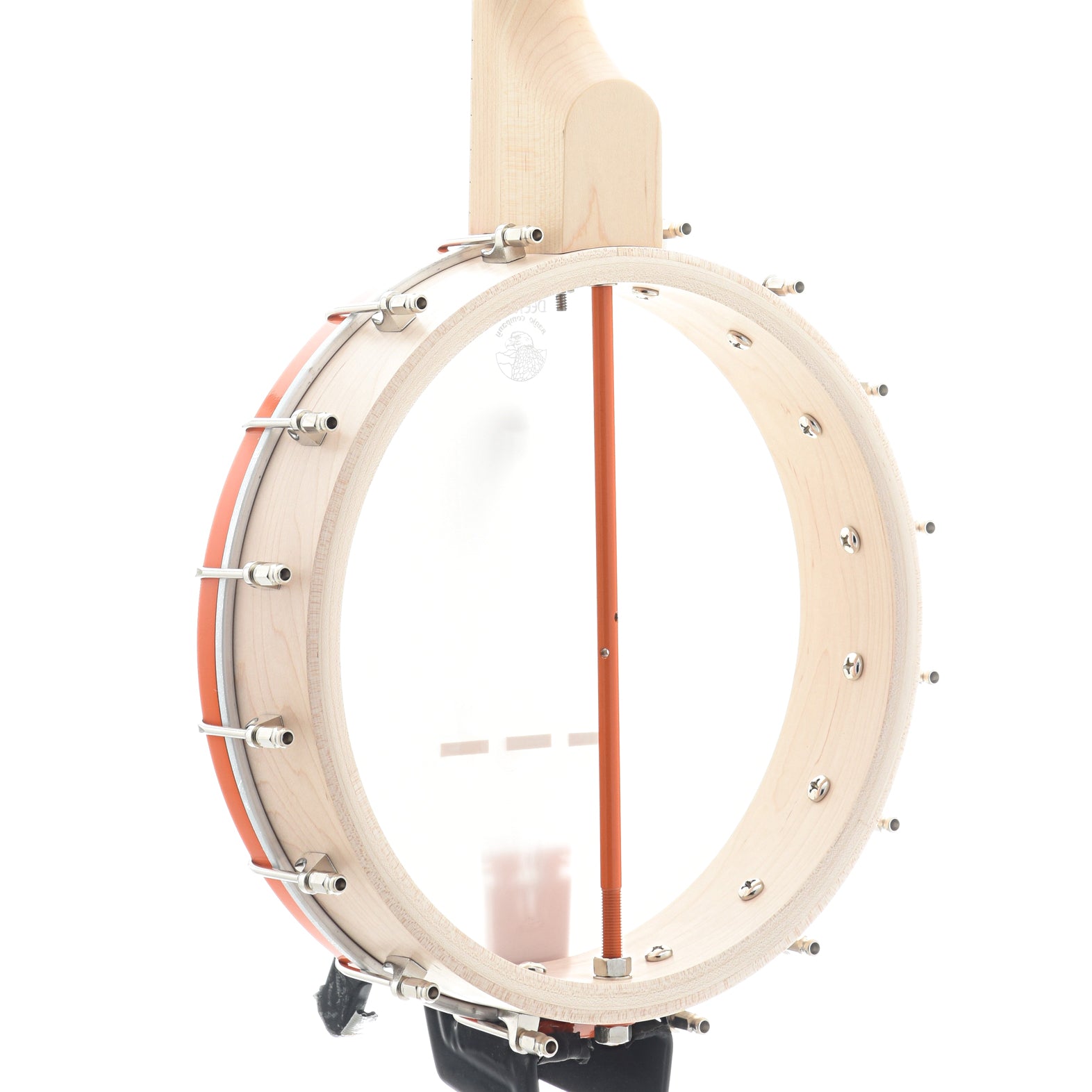 The Goodtime Junior is an updated version of Deering's popular Parlor Goodtime. It's just 33-1/2" long with a 23-1/8" scale, and it tunes to standard G tuning, making it a great choice for children, travelers, or anyone who’s looking for a smaller instrument. It features an 11” 3-ply Deering's quality rim and a slender maple neck. This model is outfitted with Chevy Orange hardware and matching inlays.
