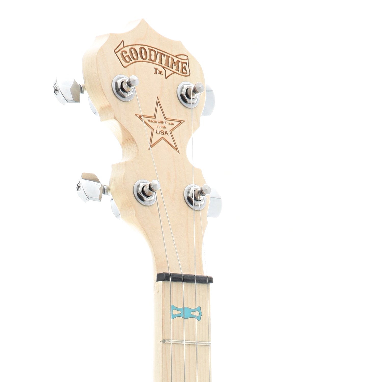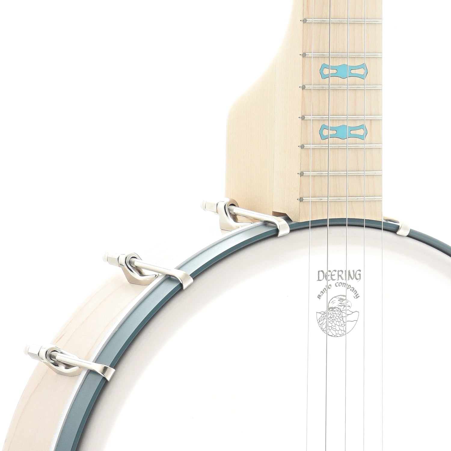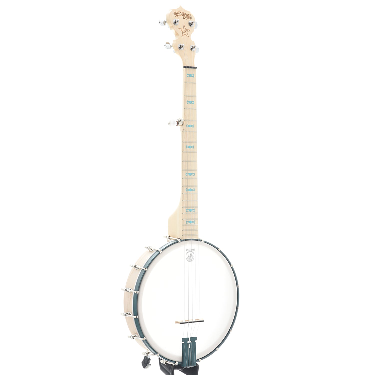 The Goodtime Junior is an updated version of Deering's popular Parlor Goodtime. It's just 33-1/2" long with a 23-1/8" scale, and it tunes to standard G tuning, making it a great choice for children, travelers, or anyone who’s looking for a smaller instrument. It features an 11” 3-ply Deering's quality rim and a slender maple neck. This model is outfitted with Seawater Teal hardware and matching inlays.
