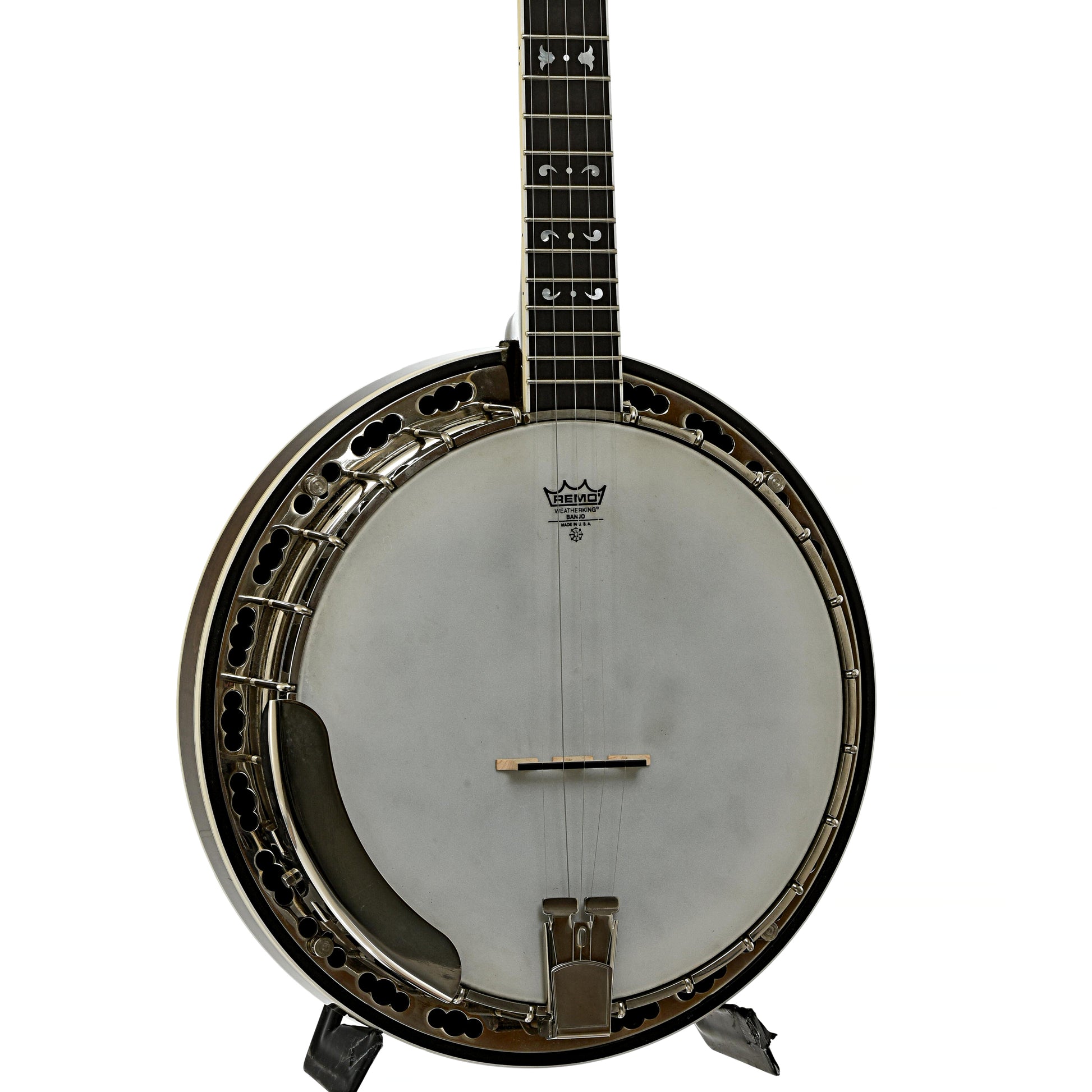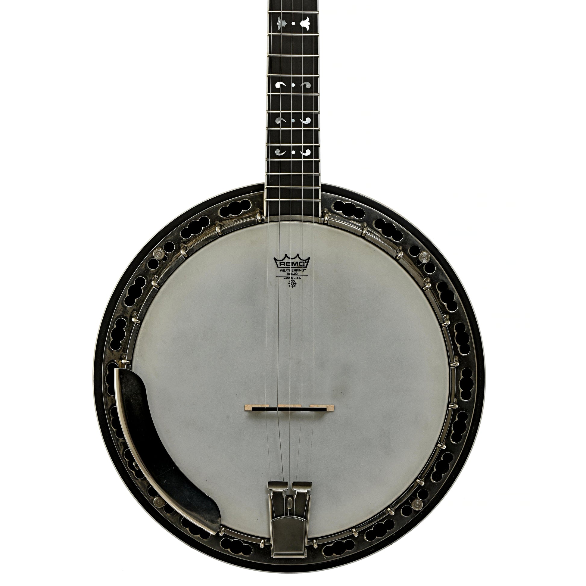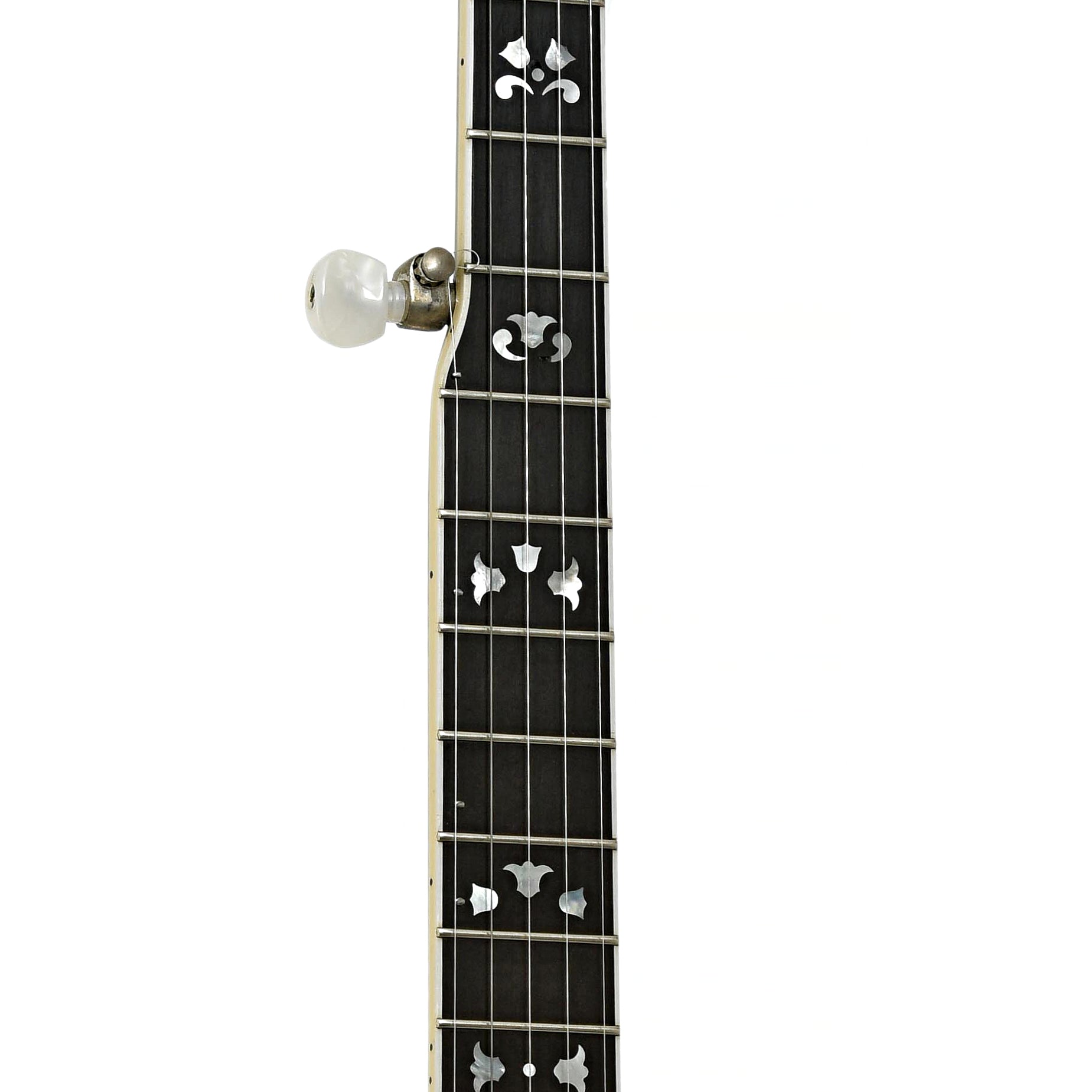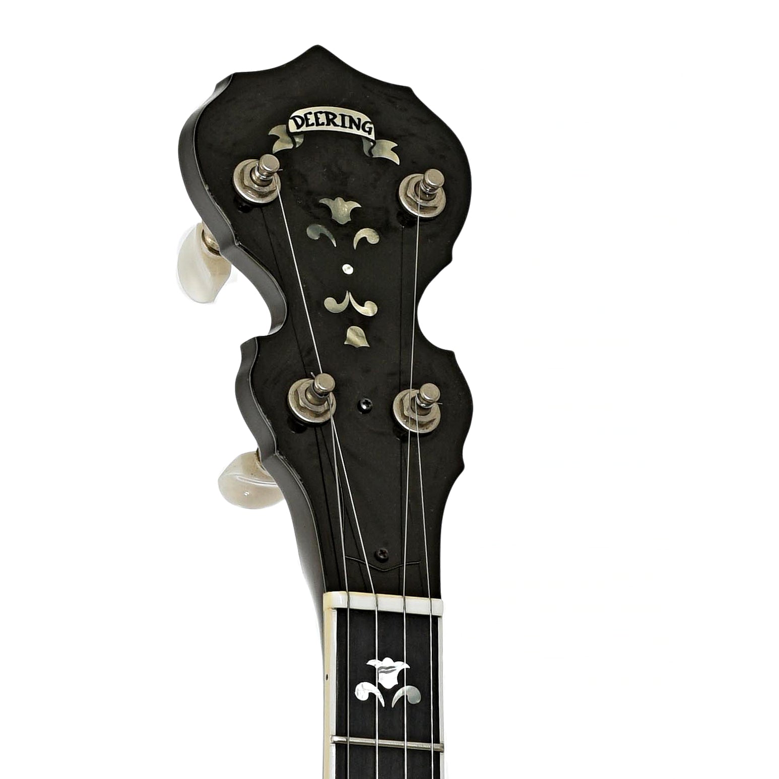 - Black peghead overlay features pearl logo and floral inlays