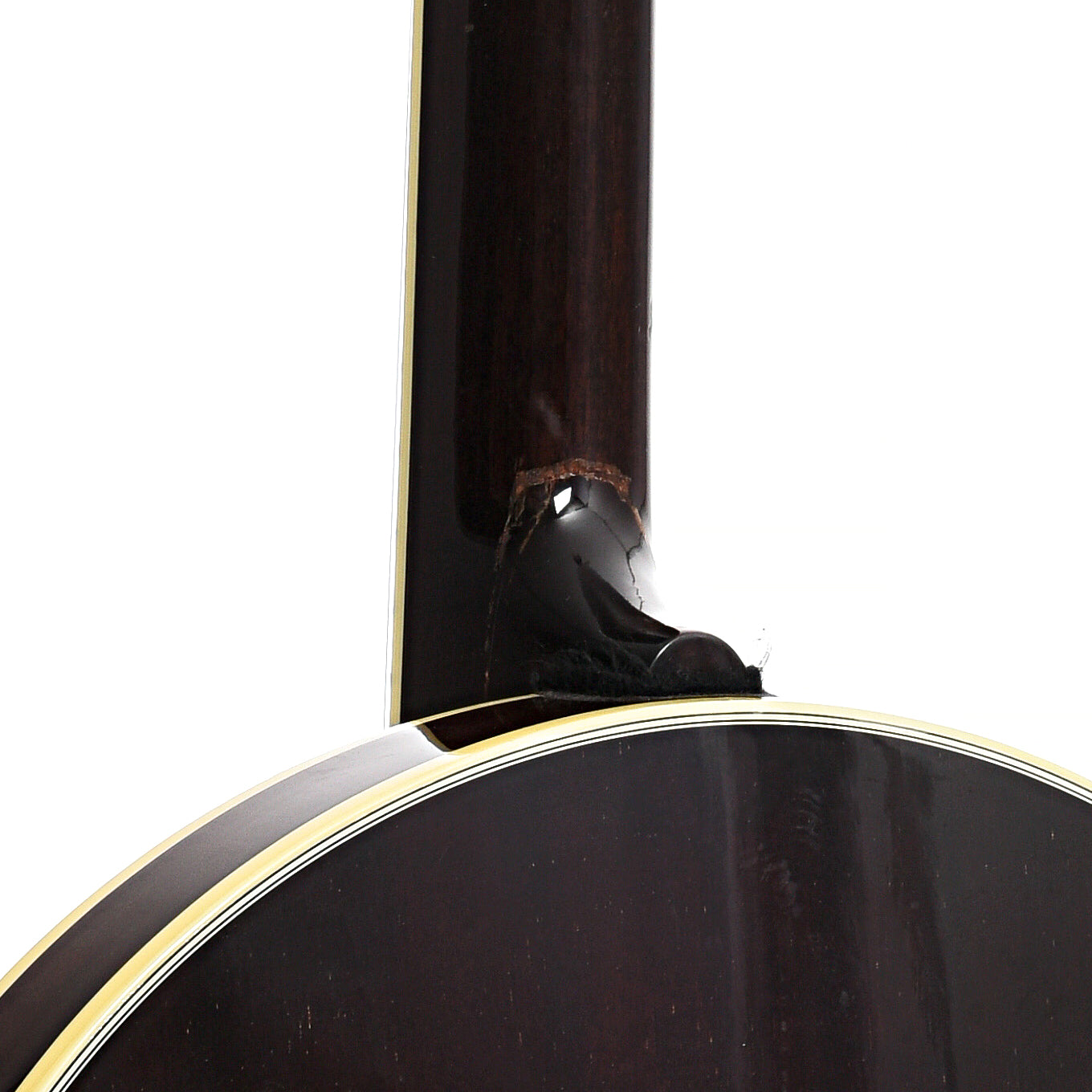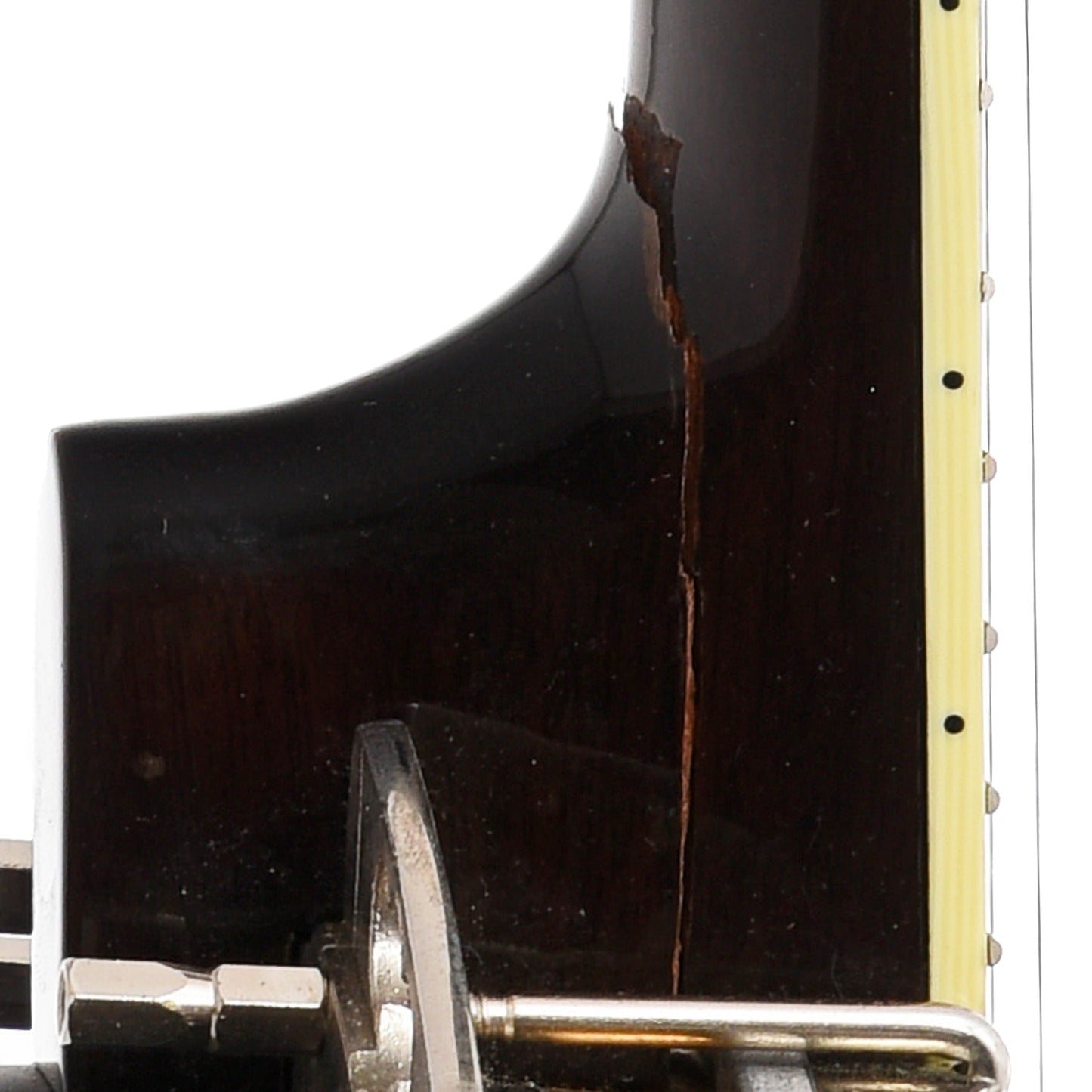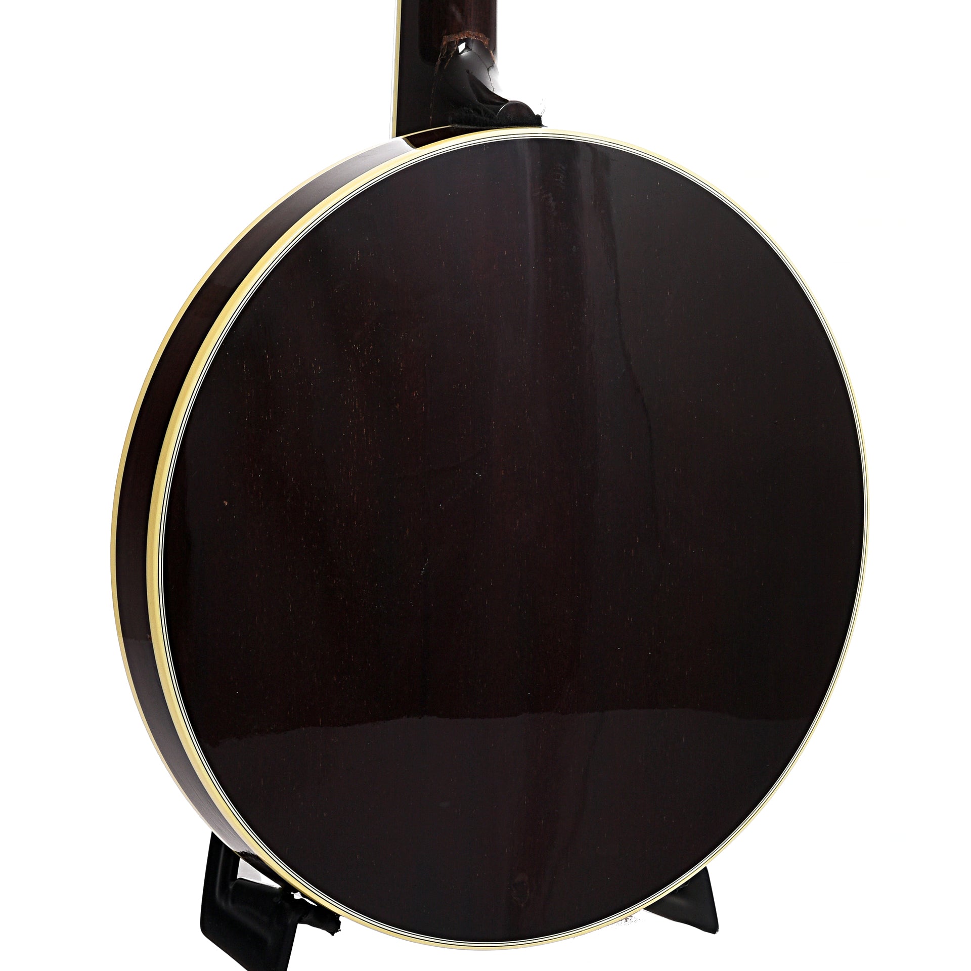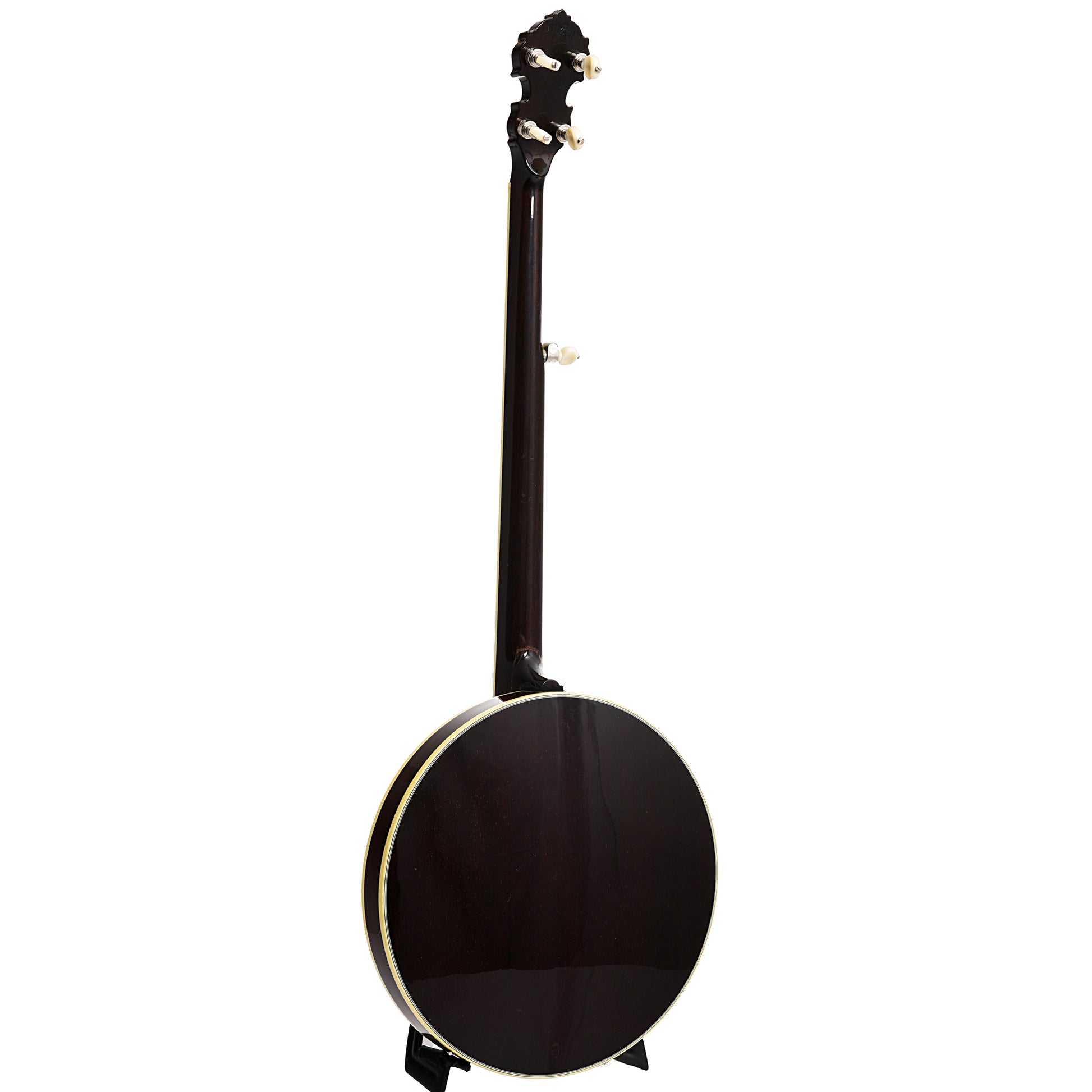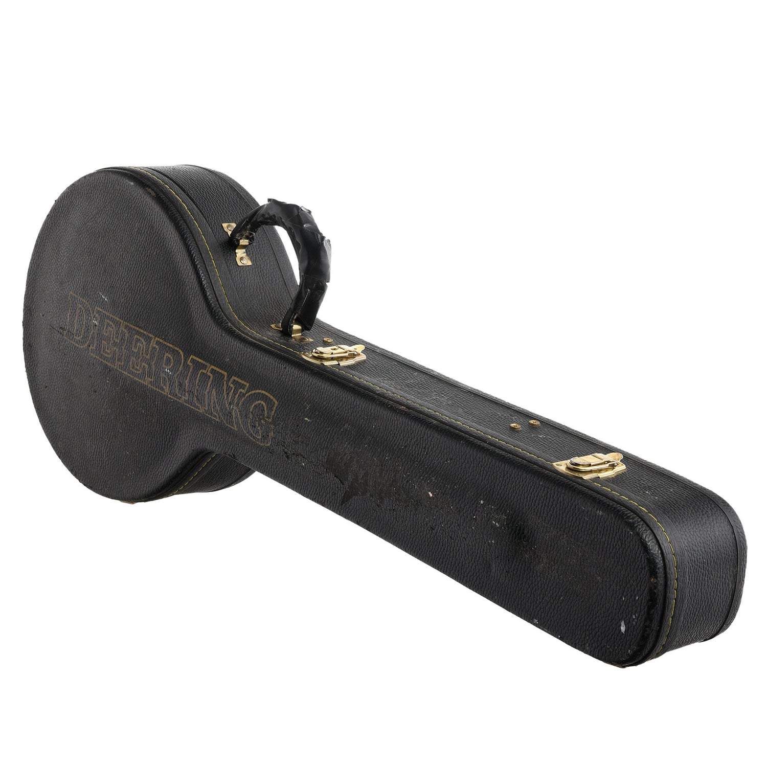 Features include an deep red-stained 5/8” maple rim and double bound mahogany resonator, un-plated -06- Deering flathead-style tone ring, 22 frets on bound ebony fingerboard, fancy pearl inlay pattern, Deering planetary style tuners and geared 5th string tuner (needs heel crack repaired, cleaning, fret level, set-up, etc. - sold AS-IS). Original case included. This instrument is in very good to excellent condition.