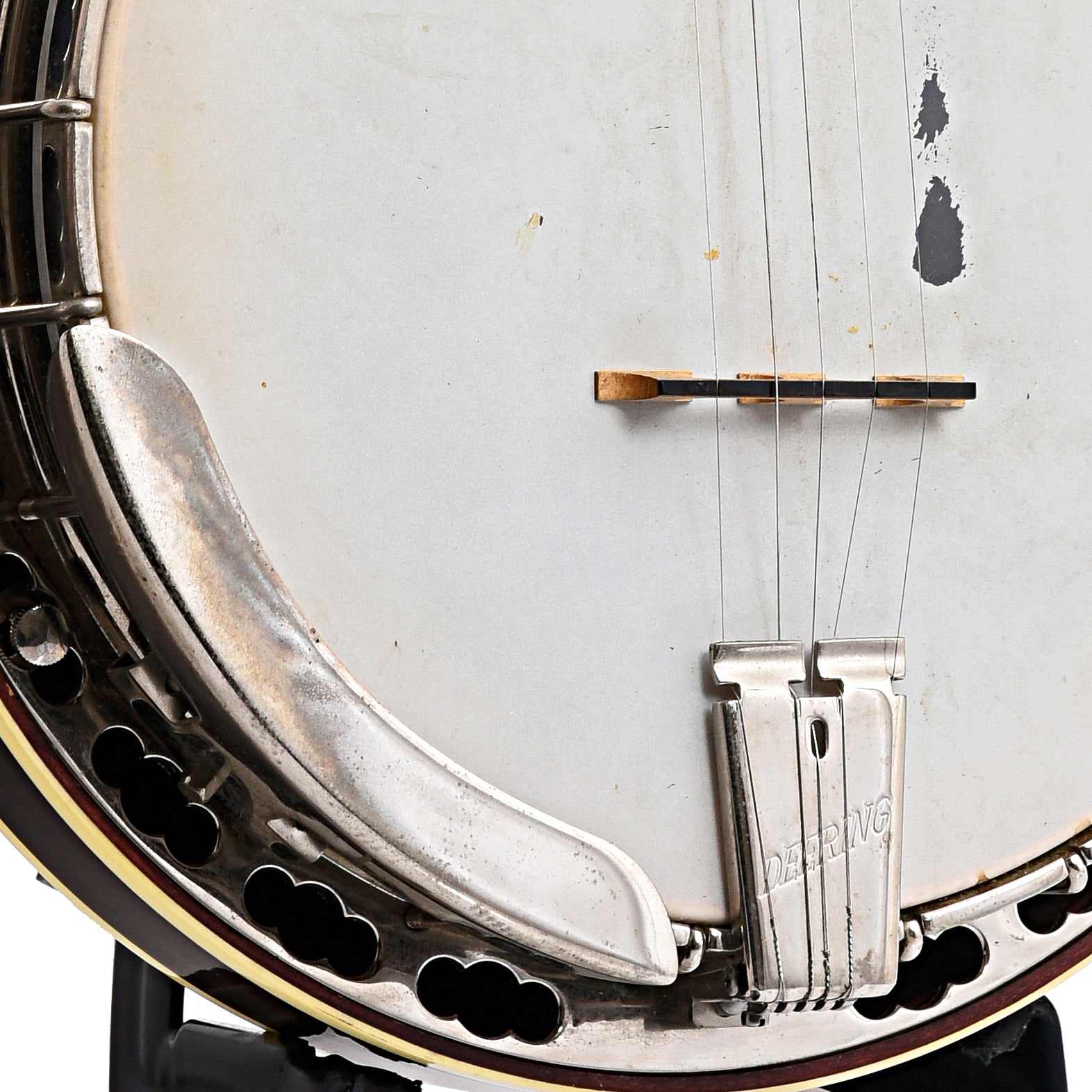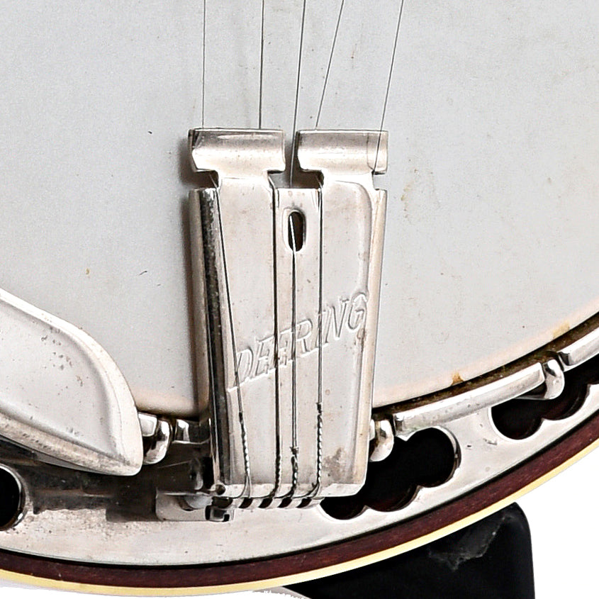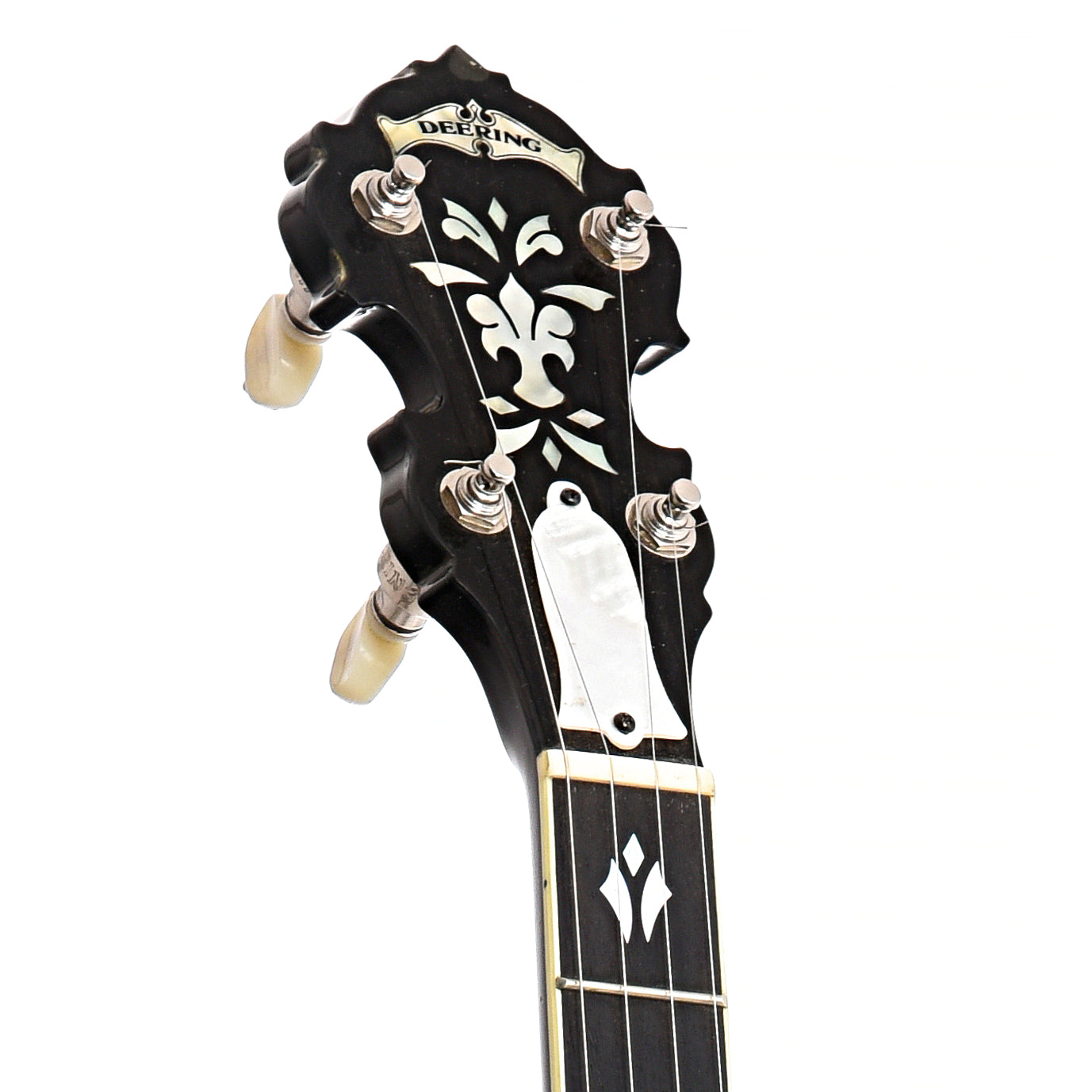 - Ebony peghead overlay features "DEERING" logo and fancy inlays