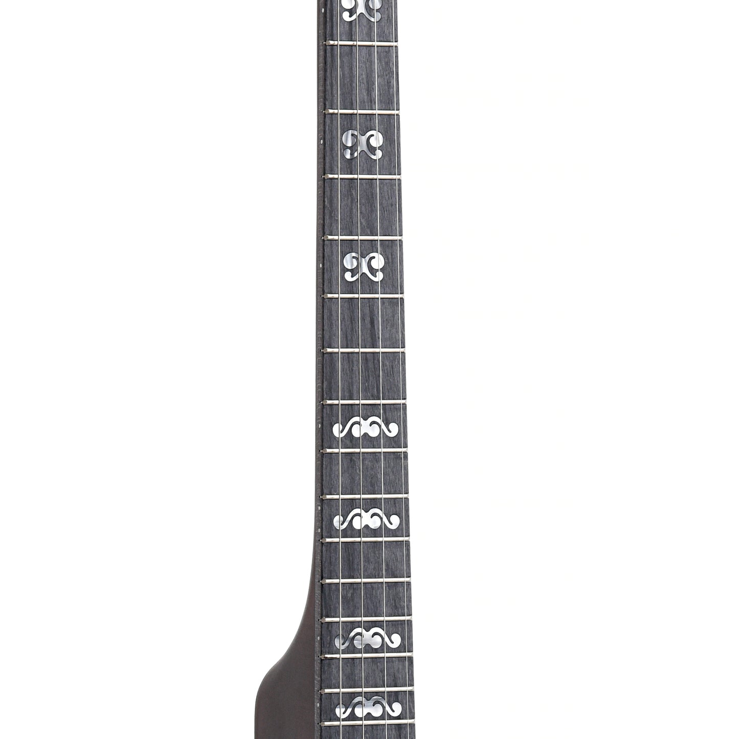 Artisan 19-fret tenor features a "Midnight Maple" fingerboard with fancy inlaid position markers, a laser-cut logo on the peghead, and planetary tuning gears. Like all Goodtimes, it is made in the USA.
