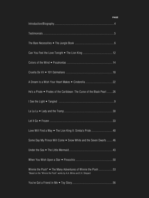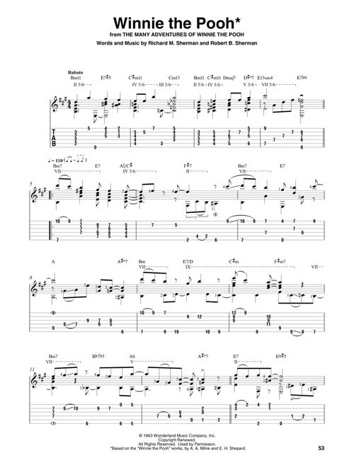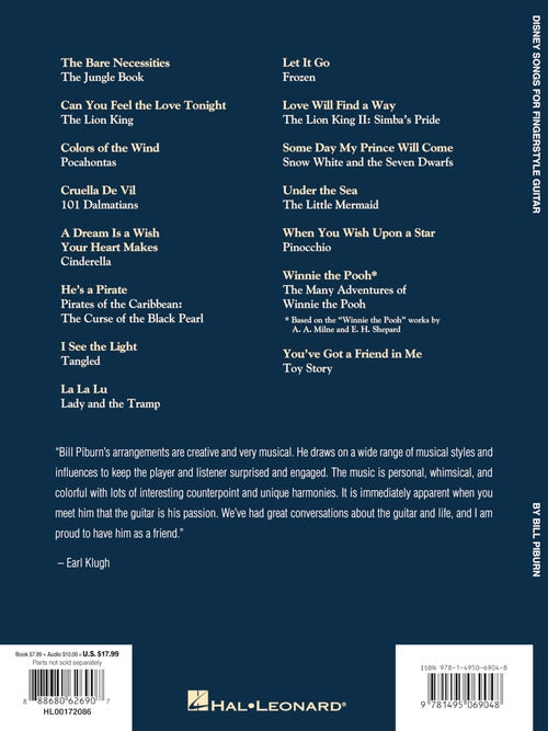 Book with online audio. Bill Piburn has arranged 15 Disney classics into playable fingerstyle guitar arrangements: The Bare Necessities, Can You Feel the Love Tonight, Colors of the Wind, He's a Pirate, I See the Light, La La Lu, Let It Go, Love Will Find a Way, Under the Sea, When You Wish upon a Star, Winnie the Pooh, You've Got a Friend in Me, more. Note/tab. 59 pp.