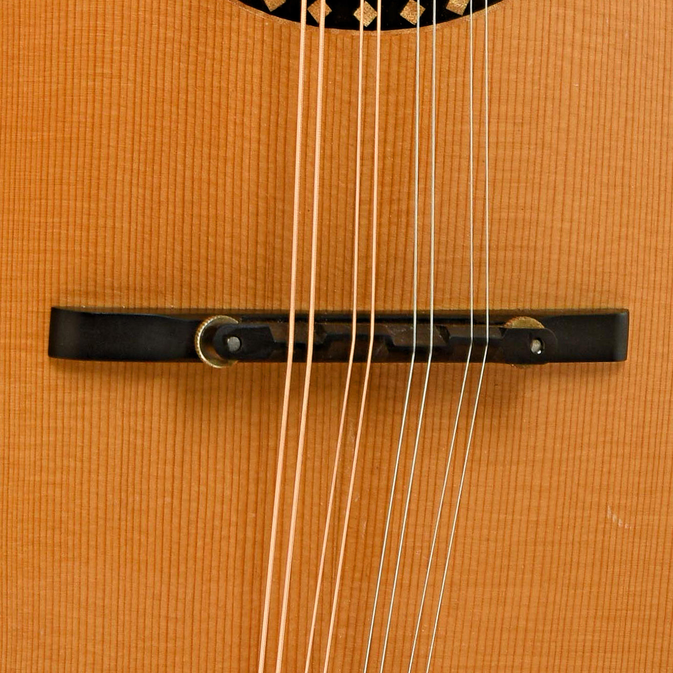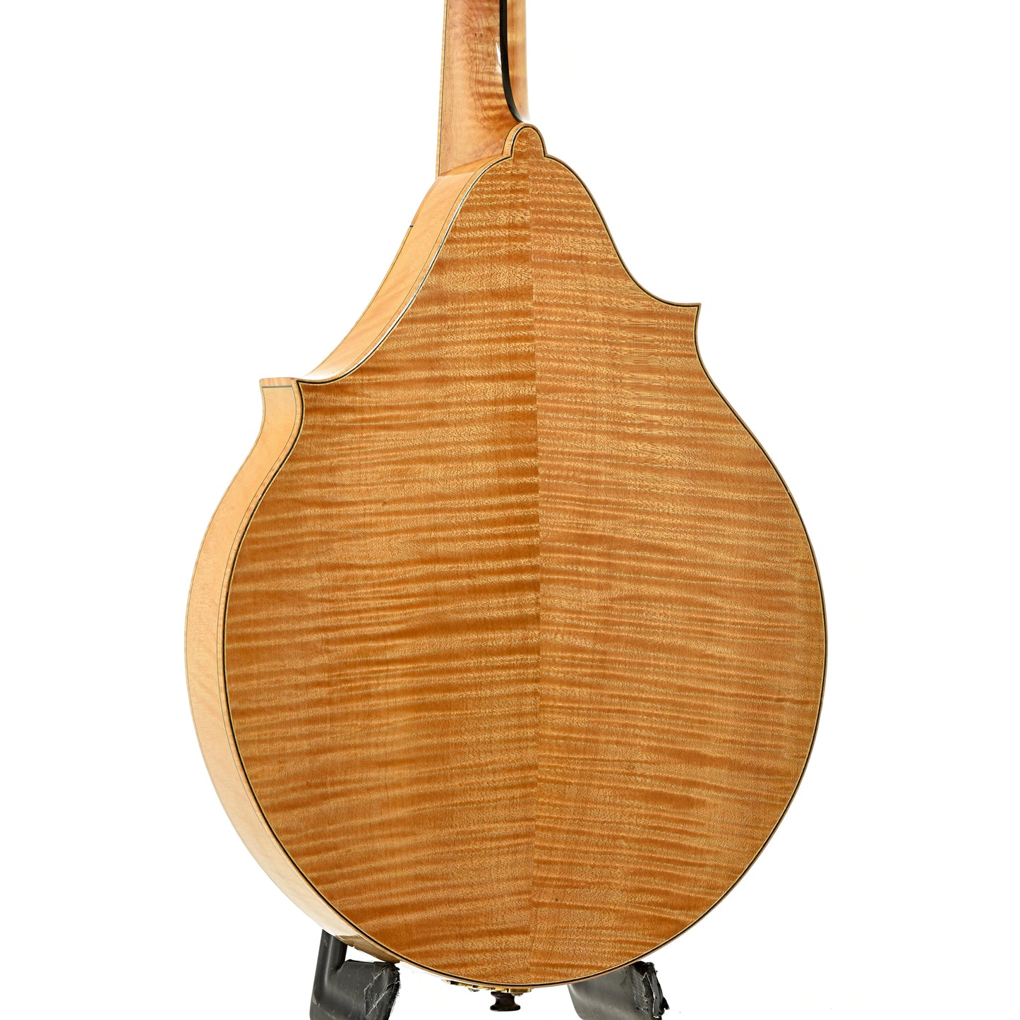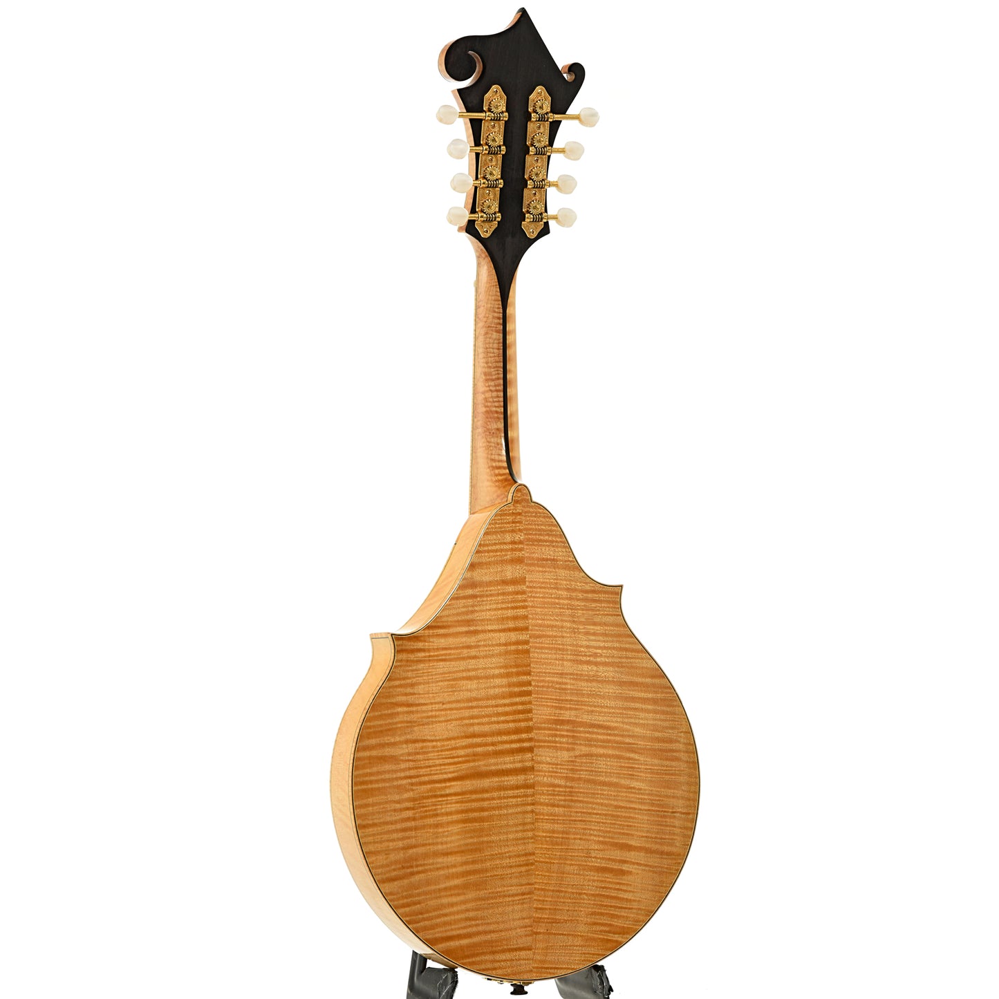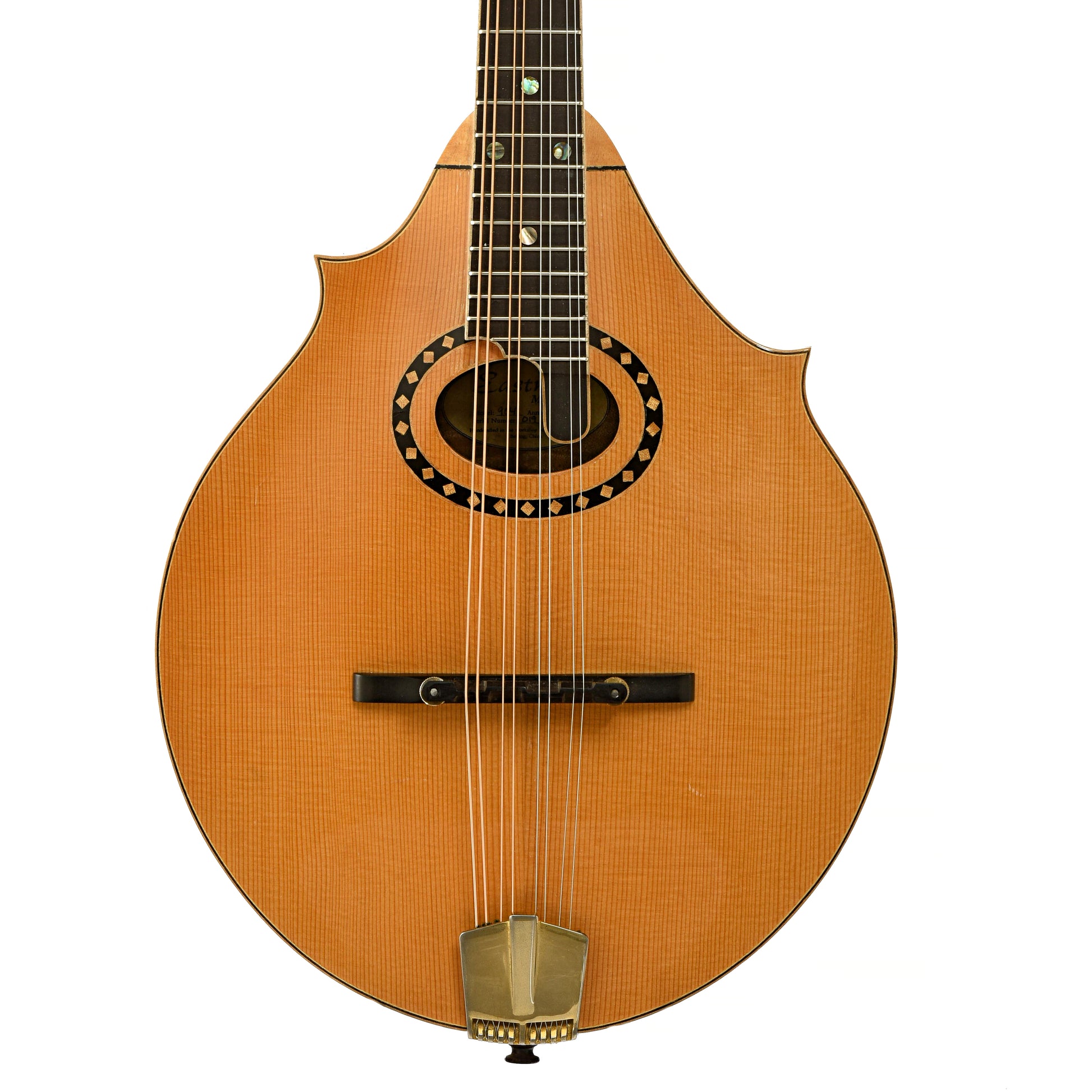 This Eastman 904D features a distinctive 2-point body with an arched spruce top and oval soundhole, paired with flame maple back and sides. It has a 2-piece maple neck with a dark center strip, an ebony fingerboard, an adjustable bridge, 4-on-a-plate Schaller tuners, and a cast tailpiece. Includes a violin-style case. Import.