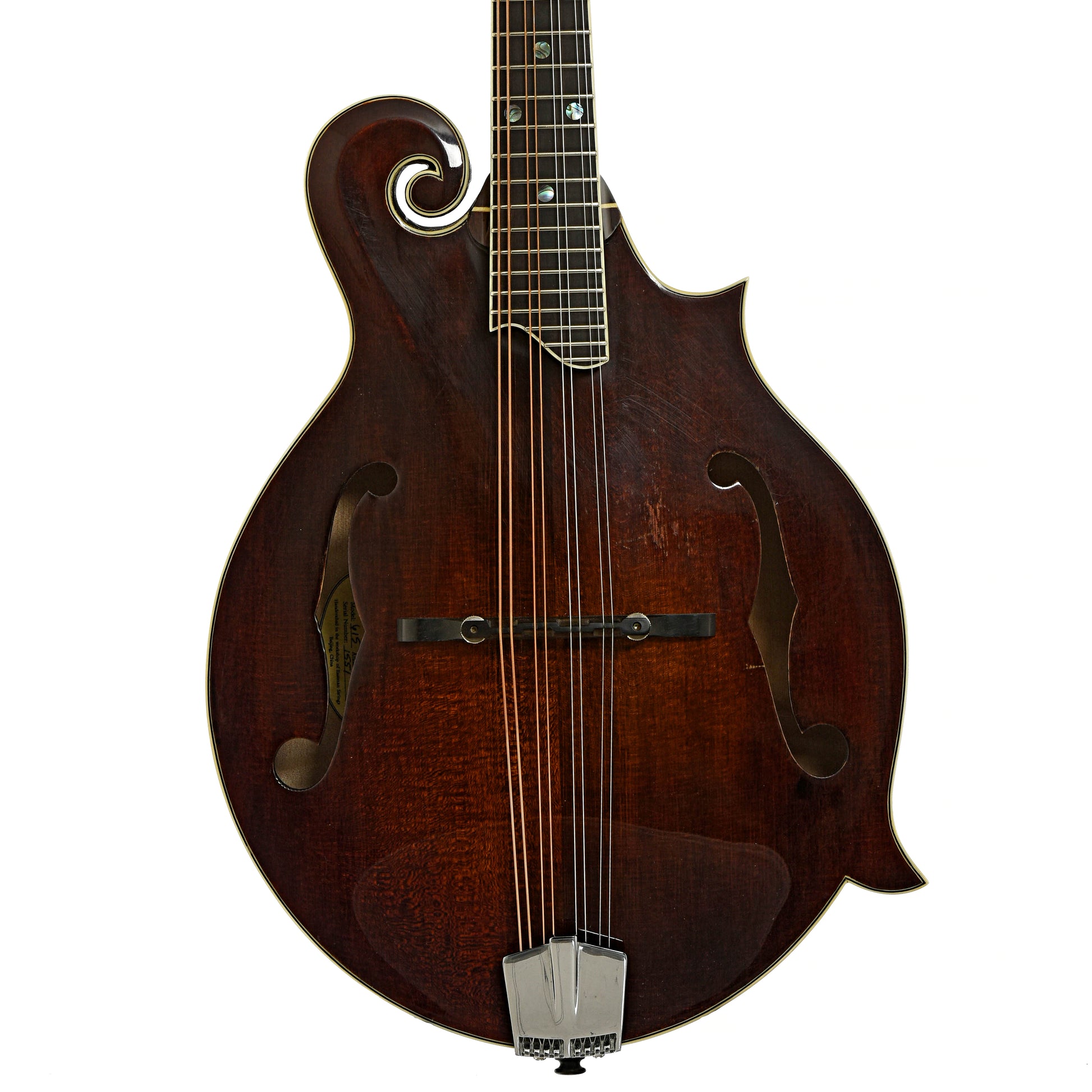 An early version of the MD615, this Eastman mandolin has a solid wood F-style body of spruce top, and maple back and sides, all in a classic red stain. Features include ebony fingerboard and adjustable bridge, and abalone dot markers. Plays nice! Original hard shell case. Import.