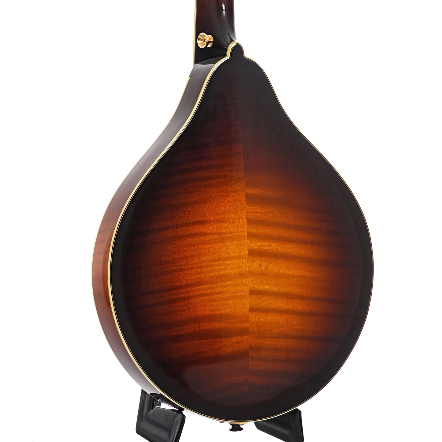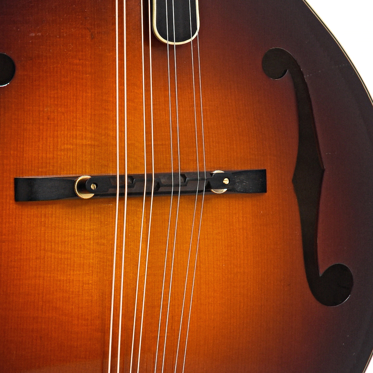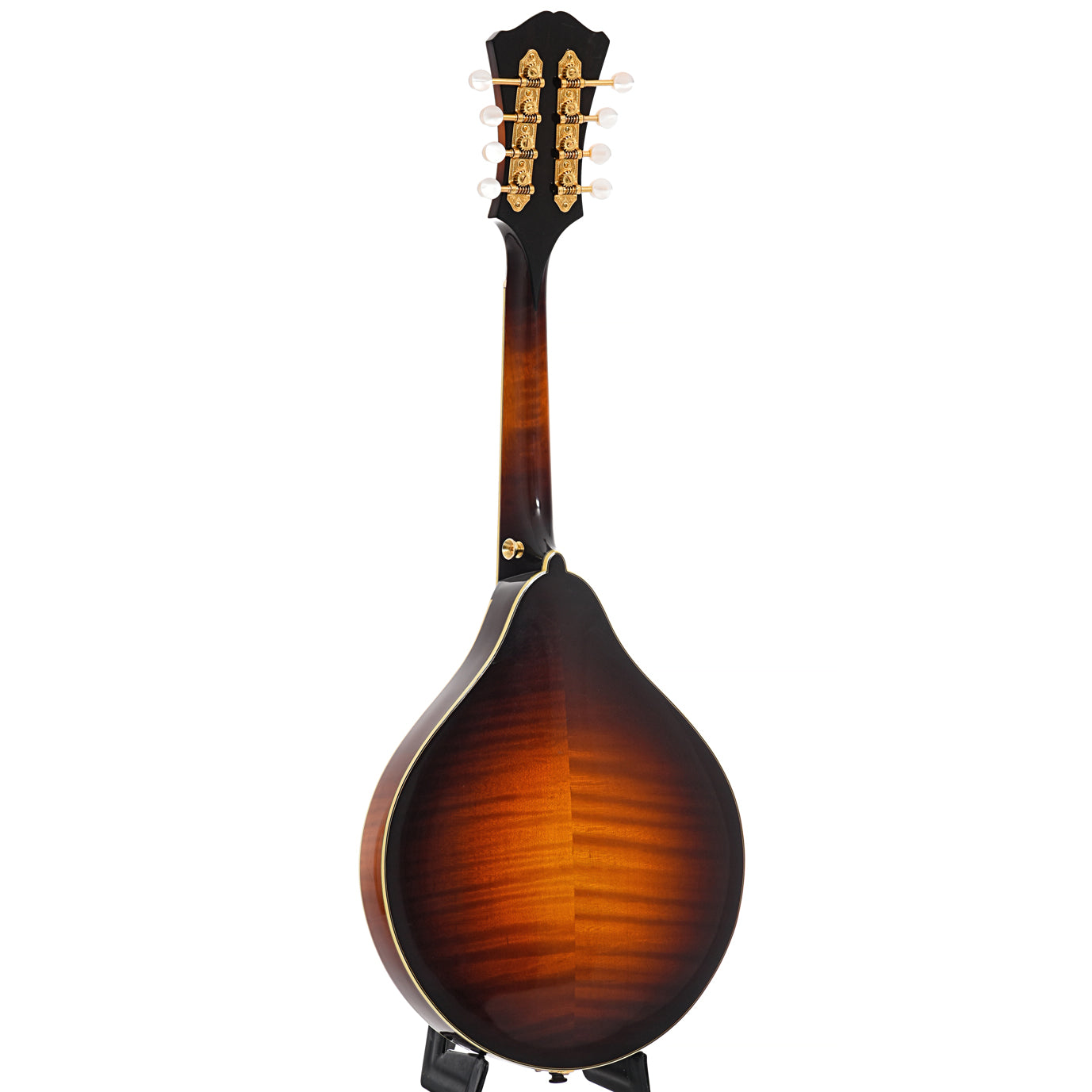 Early version of the MD805, this attractive and bright sounding A-style mandolin features a gloss sunburst finish on carved spruce top and flame maple back. Ebony fingerboard and bridge. Appointments are gold hardware, abalone dot markers, maple peghead overlay and backstrap. Oblong hard foam case. Built in China.