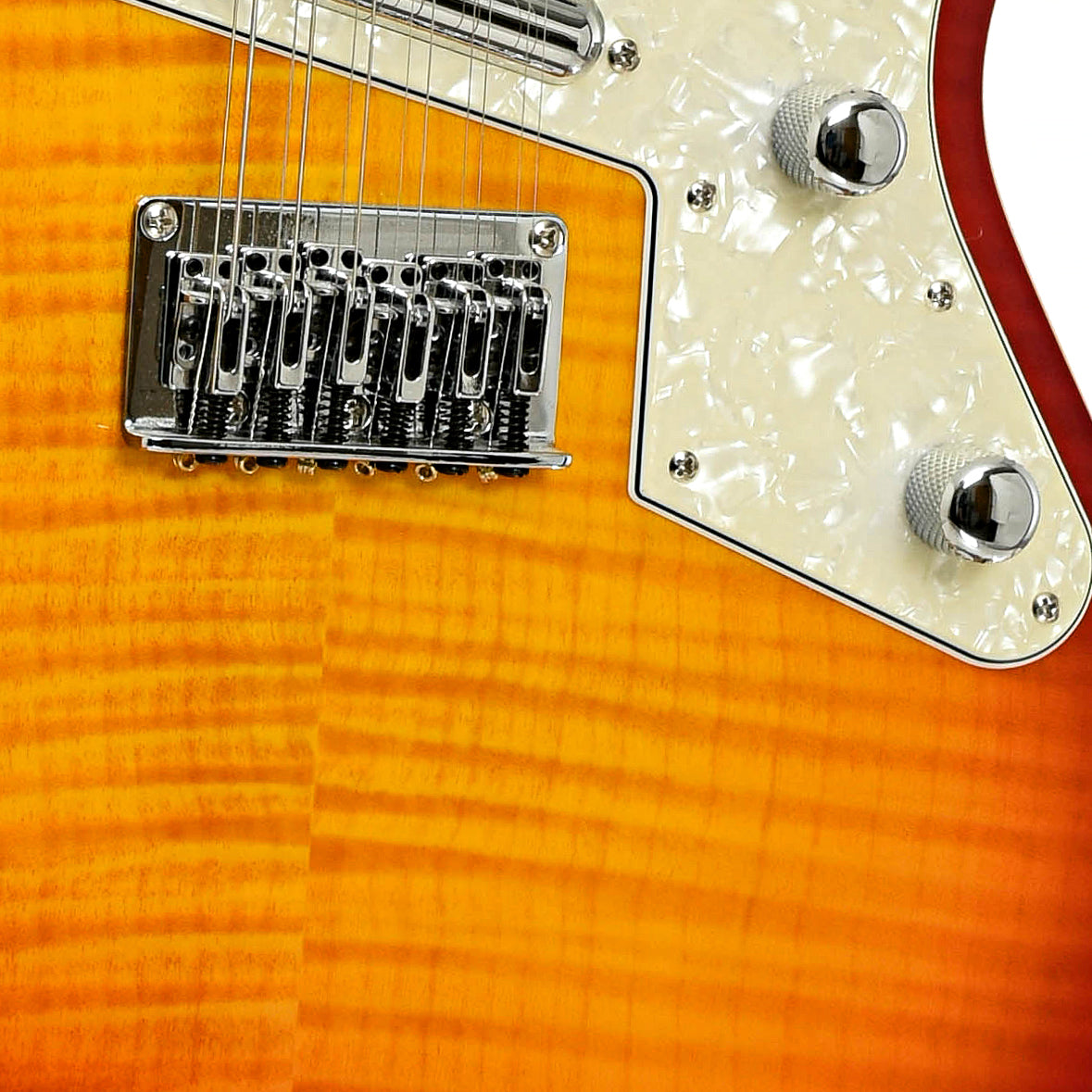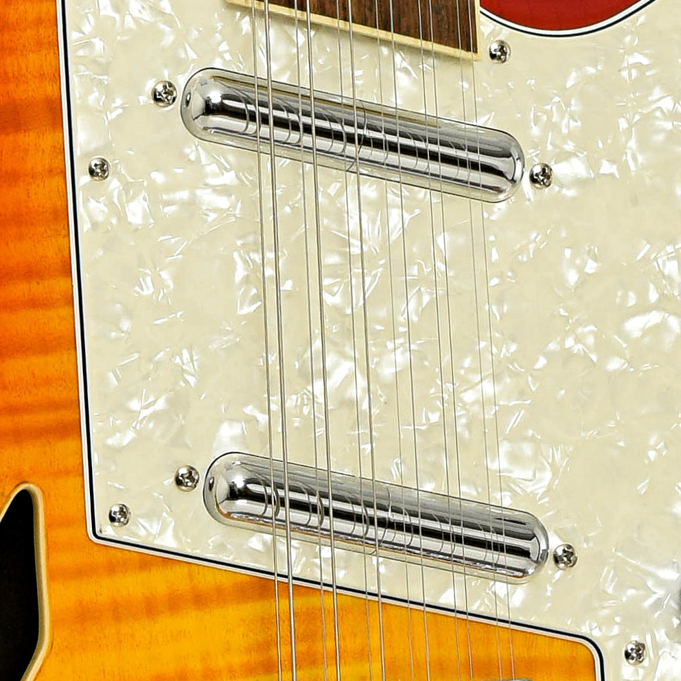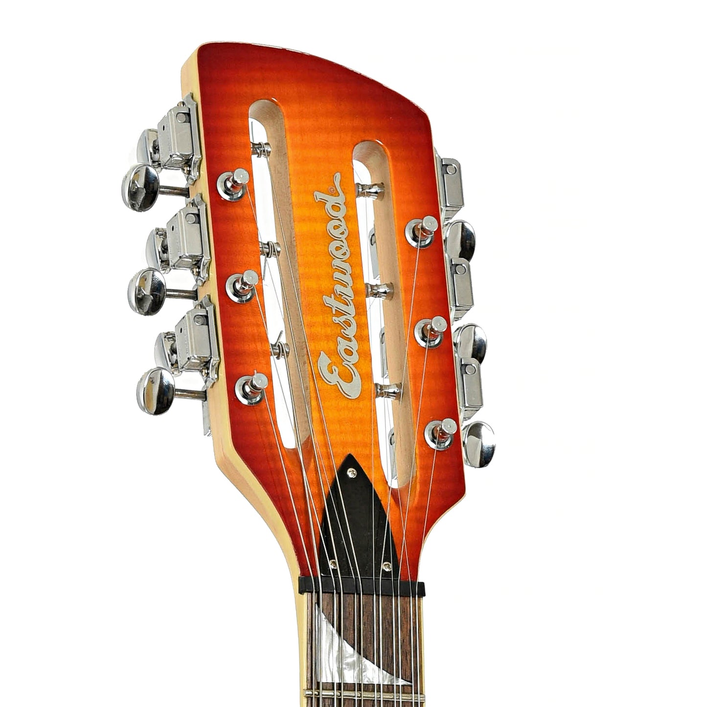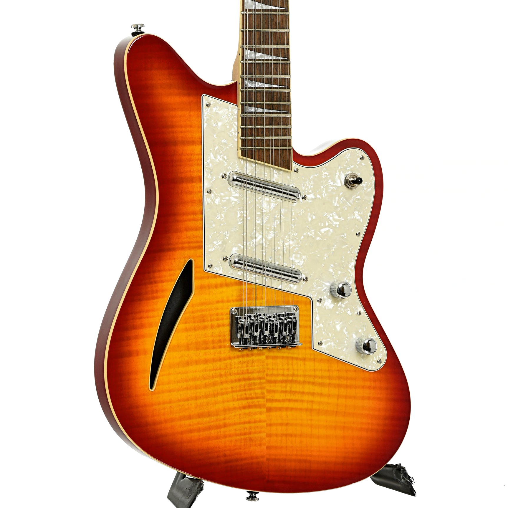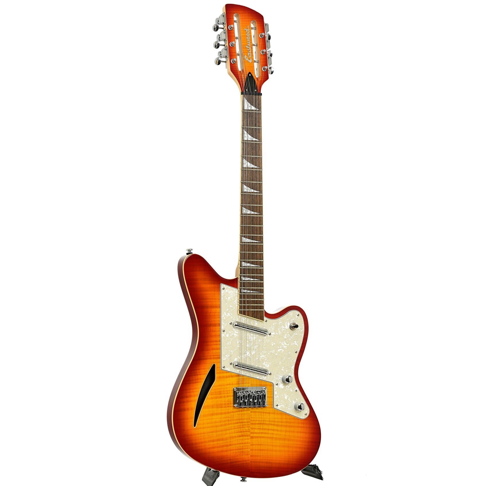 Jangle time with this cool Eastwood Surfcaster 12-string! Awesome features include a cherryburst finish on a bound and figured maple top, cats eye soundhole, chambered mahogany body, and a bound rosewood fingerboard with shark fin inlays. Equipped with dual lipstick single coil pickups. Padded gigbag. Import. On consignment.