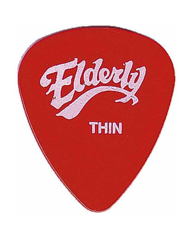 Light gauge .46, standard shape red delrin pick with Elderly Instruments logo.