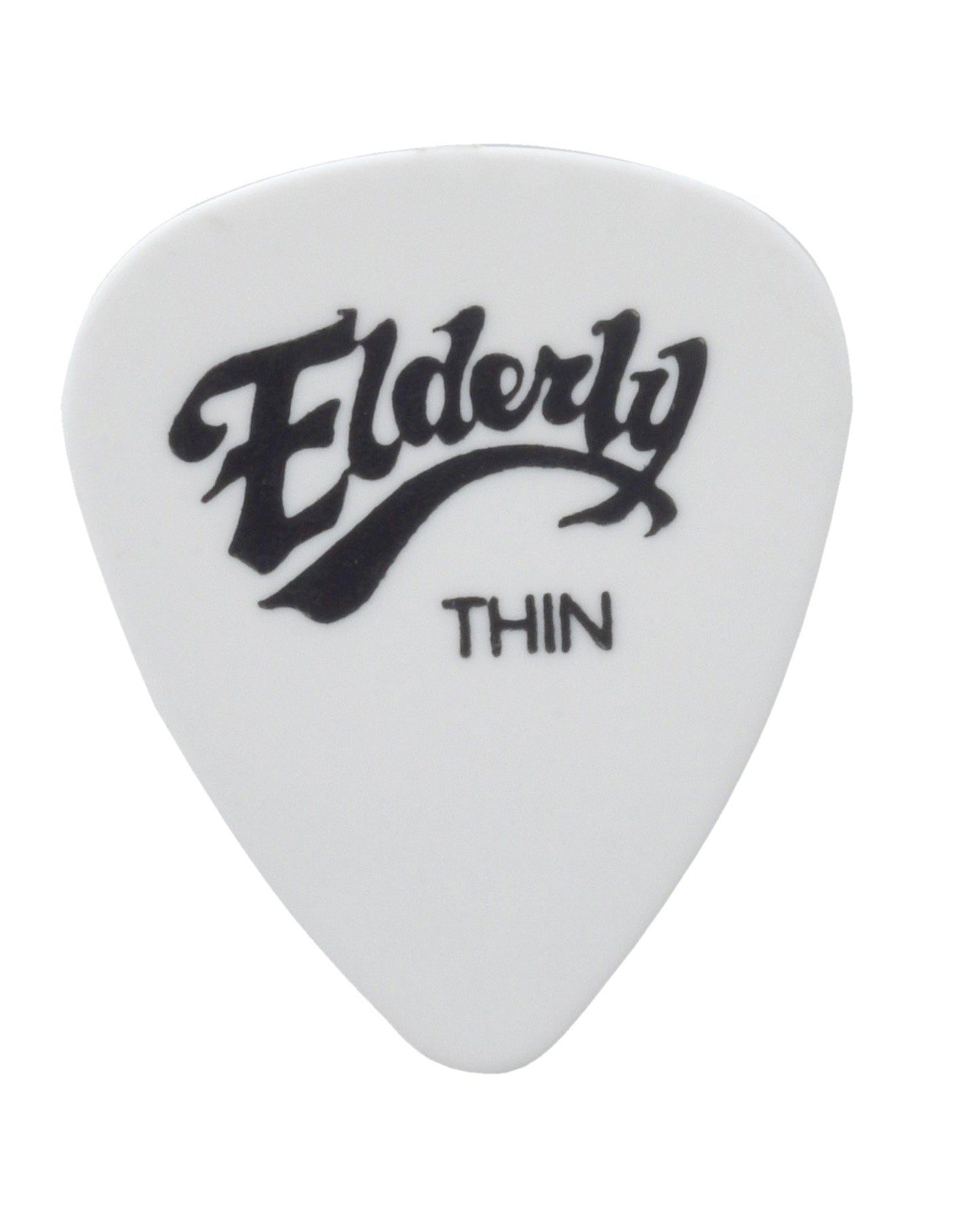Light gauge .46, standard shape white delrin pick with Elderly Instruments logo.