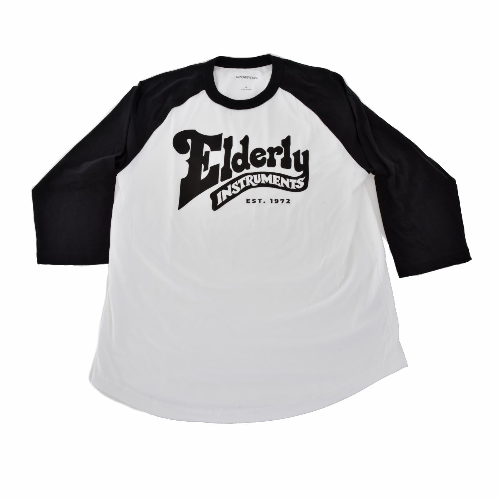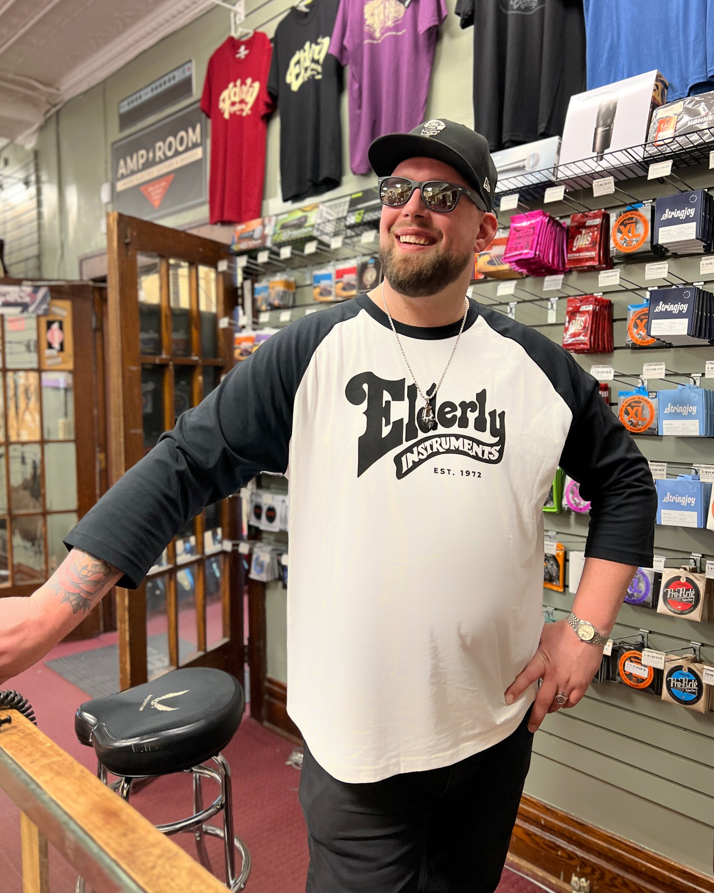 A classic baseball tee with a vintage-style Elderly Instruments logo. This 100% cotton, raglan 3/4 sleeve shirt brings comfort and nostalgia together. Perfect for game day—or just repping your favorite music store!