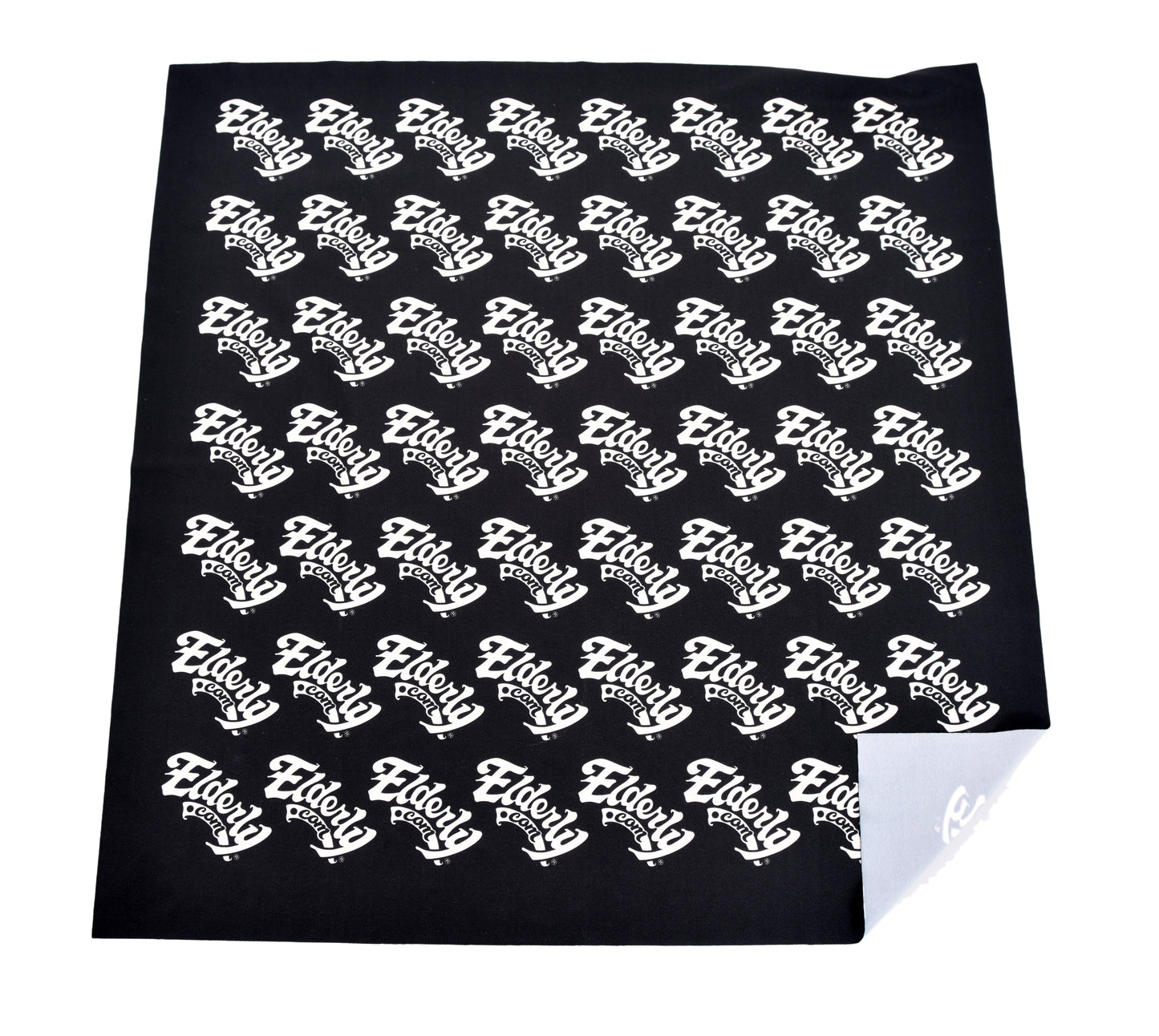 Black polyester 22" x 22" bandana featuring the Elderly Logo in cream.