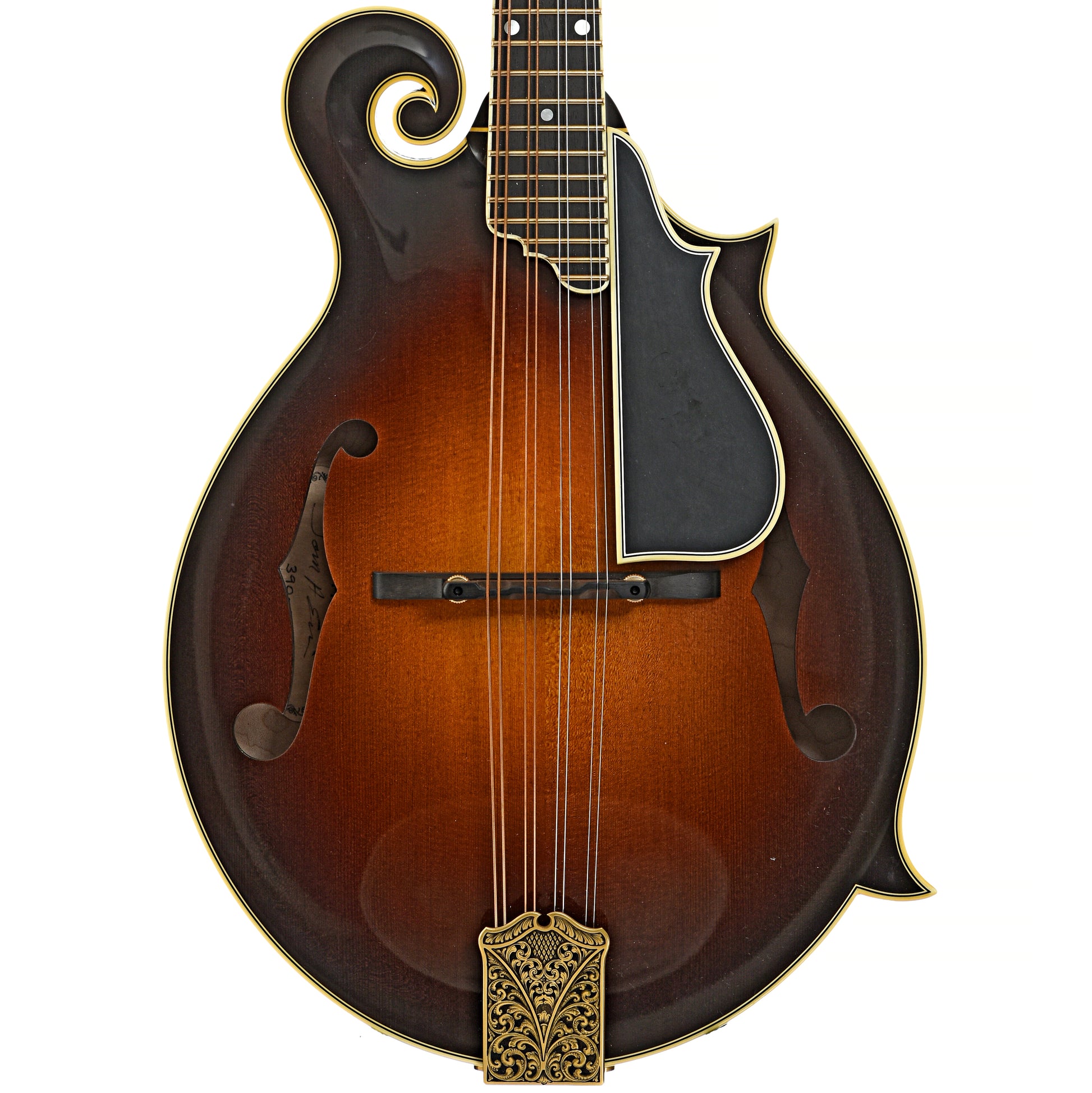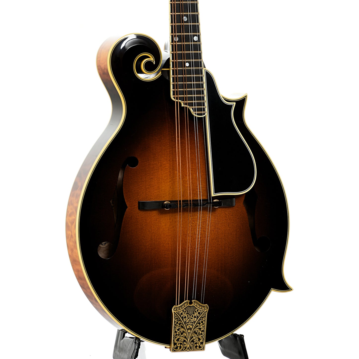 A masterfully crafted F-style mandolin, this 2016 Ellis F-5 Reserve is built with the finest materials and attention to detail. The private stock spruce top is paired with highly figured maple back, sides, and neck, all finished in a hand-applied varnish sunburst. The bound and purfled ebony peghead features Ellis’s intricate Torch and Wire inlay. Additional premium appointments include a bound and purfled ebony pickguard, adjustable ebony bridge, Waverly 4-on-a-plate tuners, and a gold-engraved tailpiece cover. A standout instrument, both visually and tonally. Includes Collings hard shell case (green lining). Made in USA. On consignment.