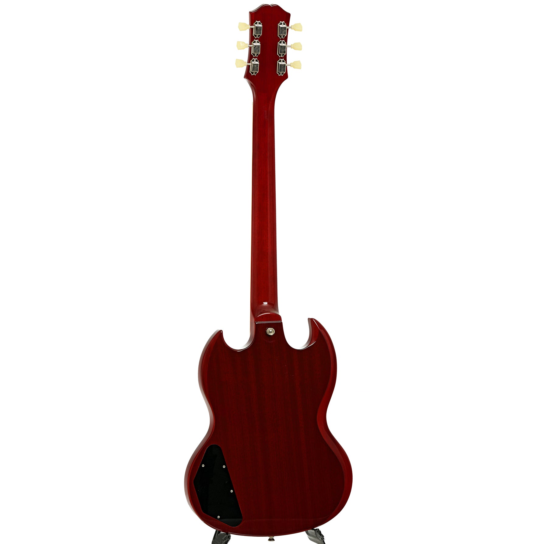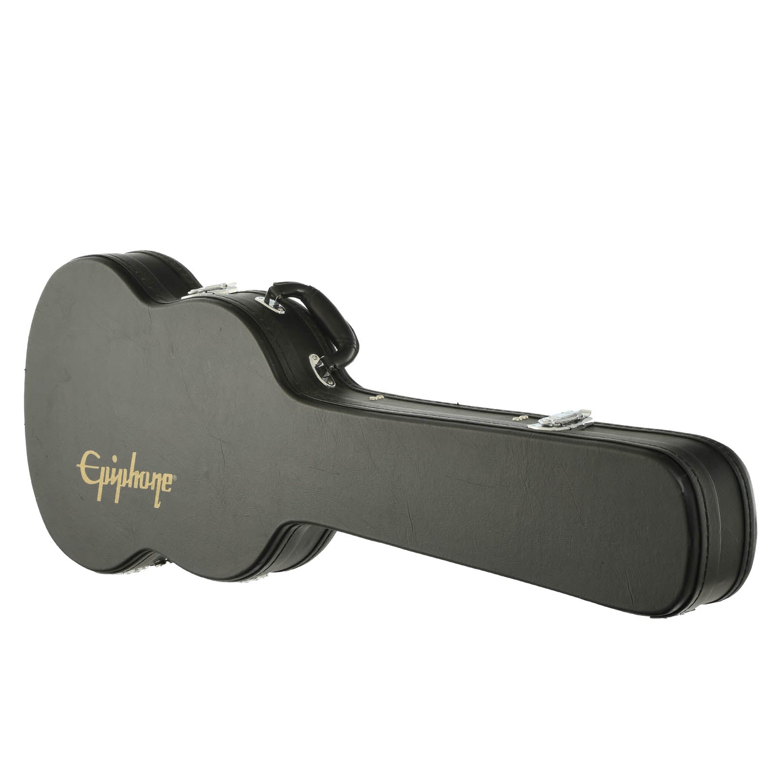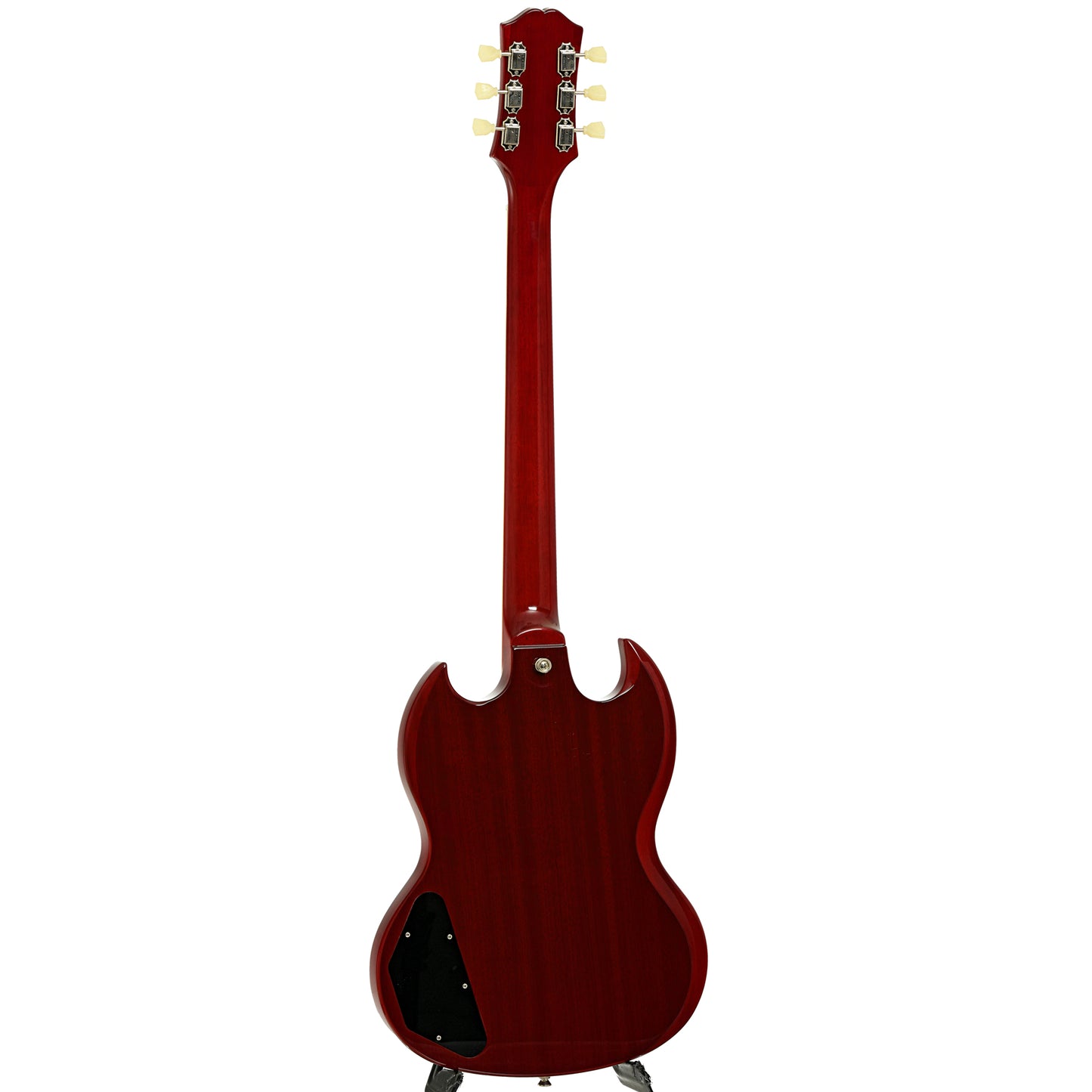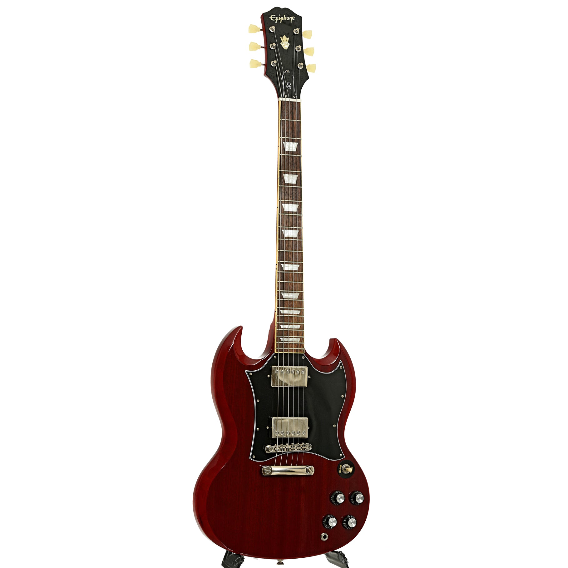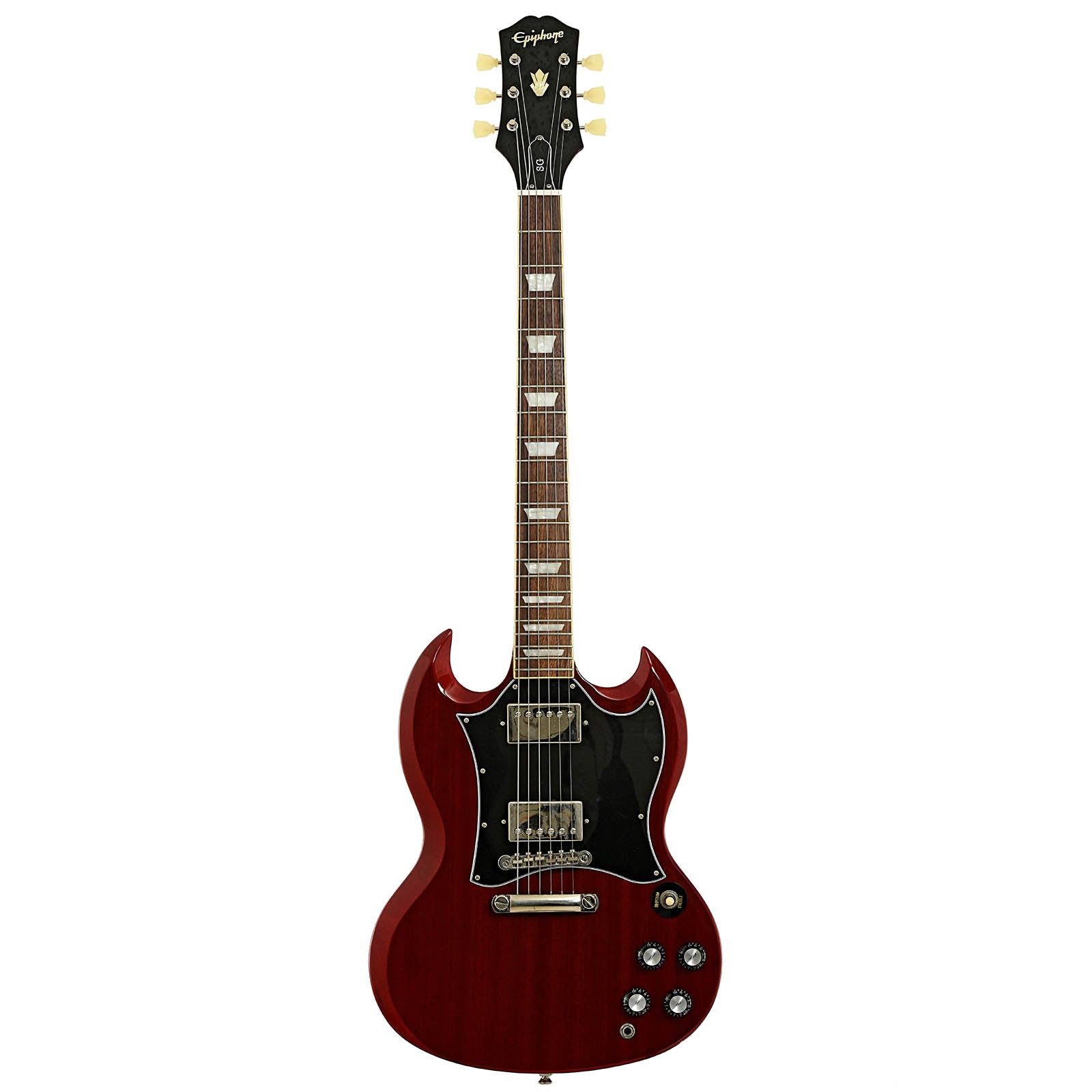 Epiphone recreates the 1960s classic SG with an all-mahogany body and neck in a heritage cherry finish. It has a bound laurel fingerboard with trapezoid inlays, "Batwing" large b-w-b-w plastic pickguard. Equipped with dual humbucking pickups, T-O-M-style bridge, and vintage-style tuners. Original hard shell. Import.