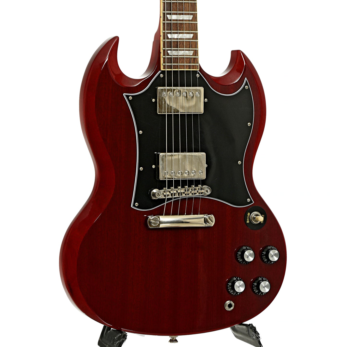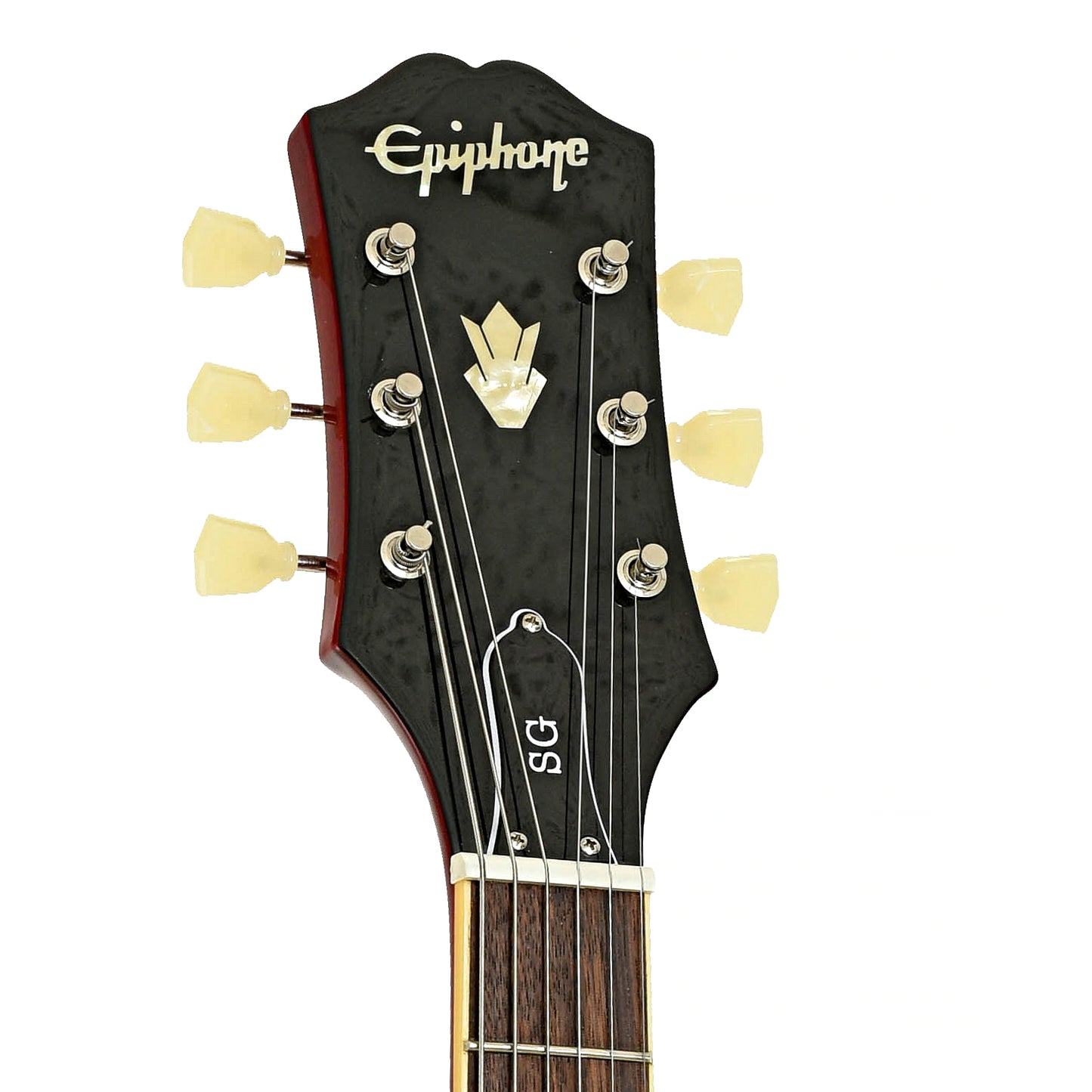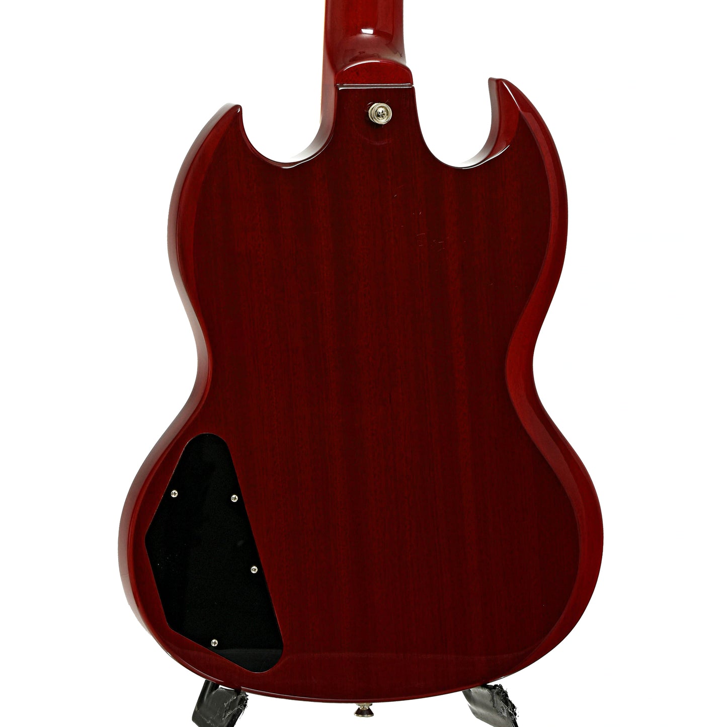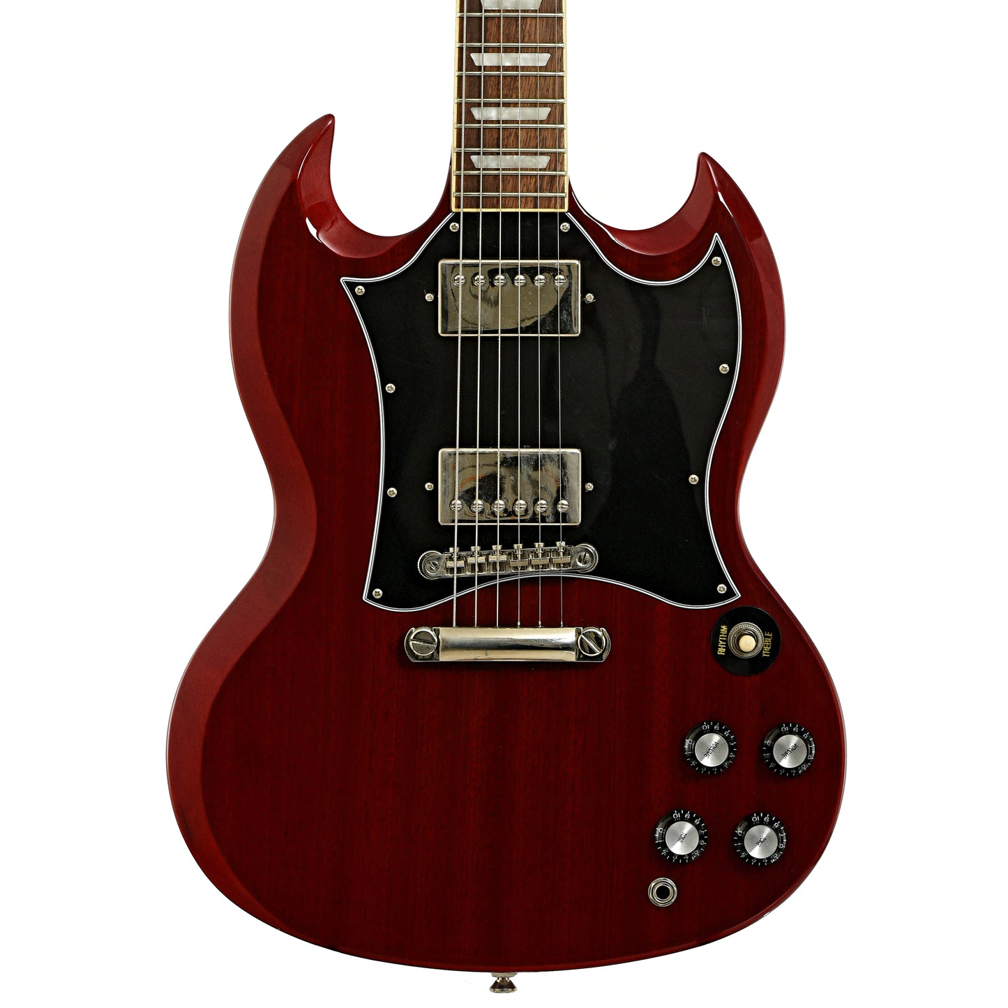 Epiphone recreates the 1960s classic SG with an all-mahogany body and neck in a heritage cherry finish. It has a bound laurel fingerboard with trapezoid inlays, "Batwing" large b-w-b-w plastic pickguard. Equipped with dual humbucking pickups, T-O-M-style bridge, and vintage-style tuners. Original hard shell. Import.