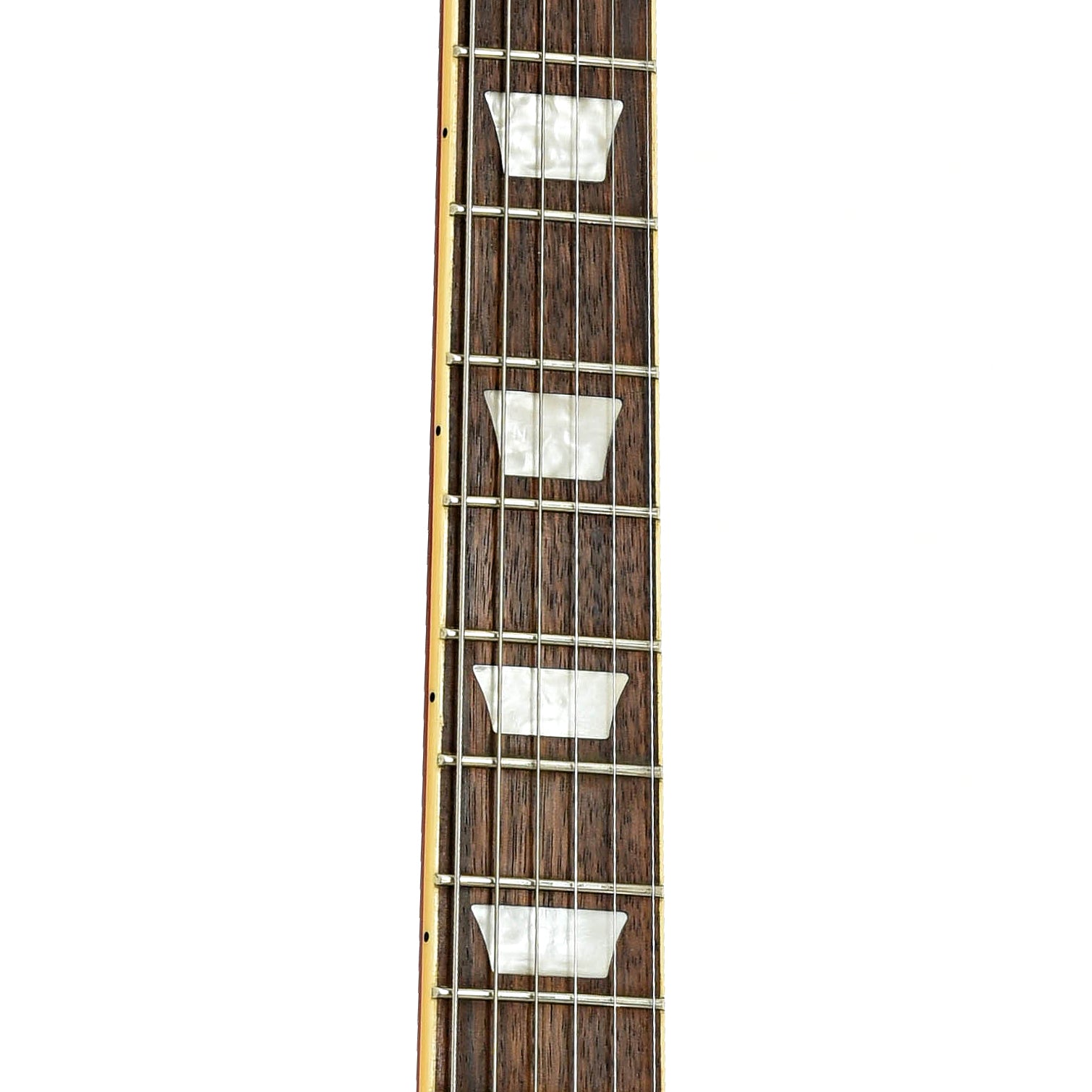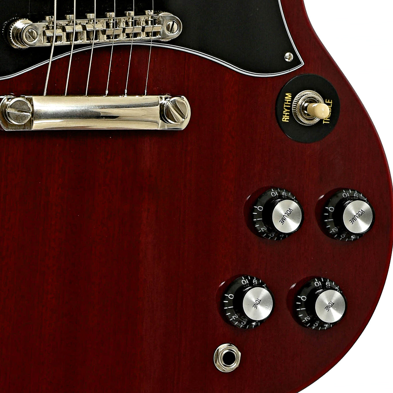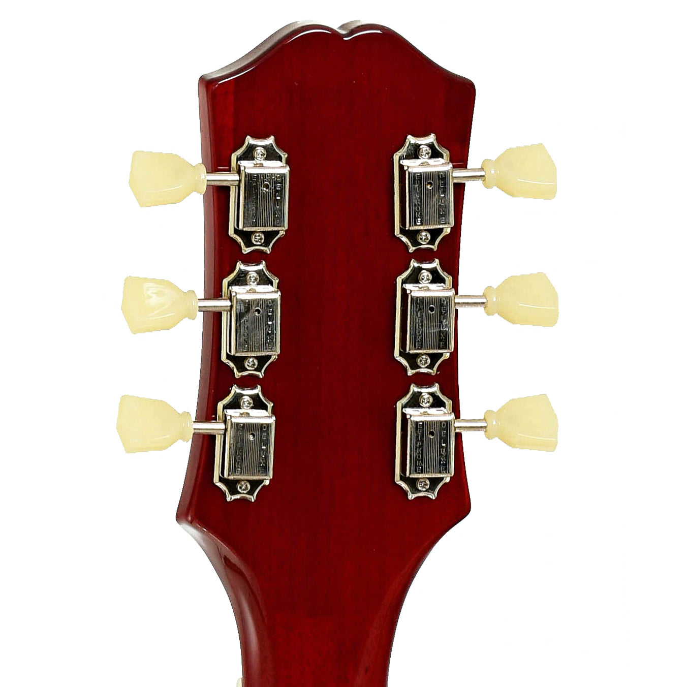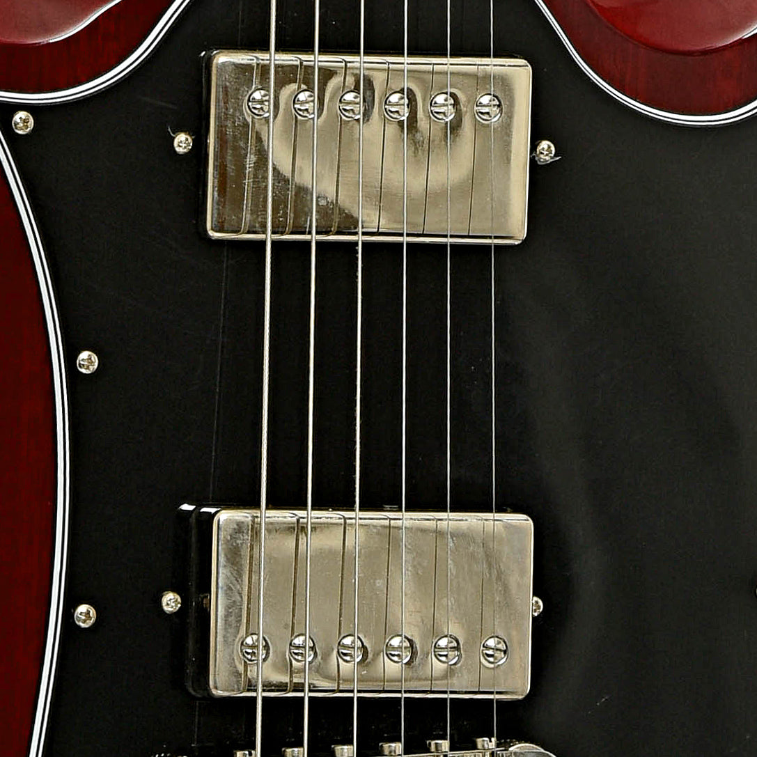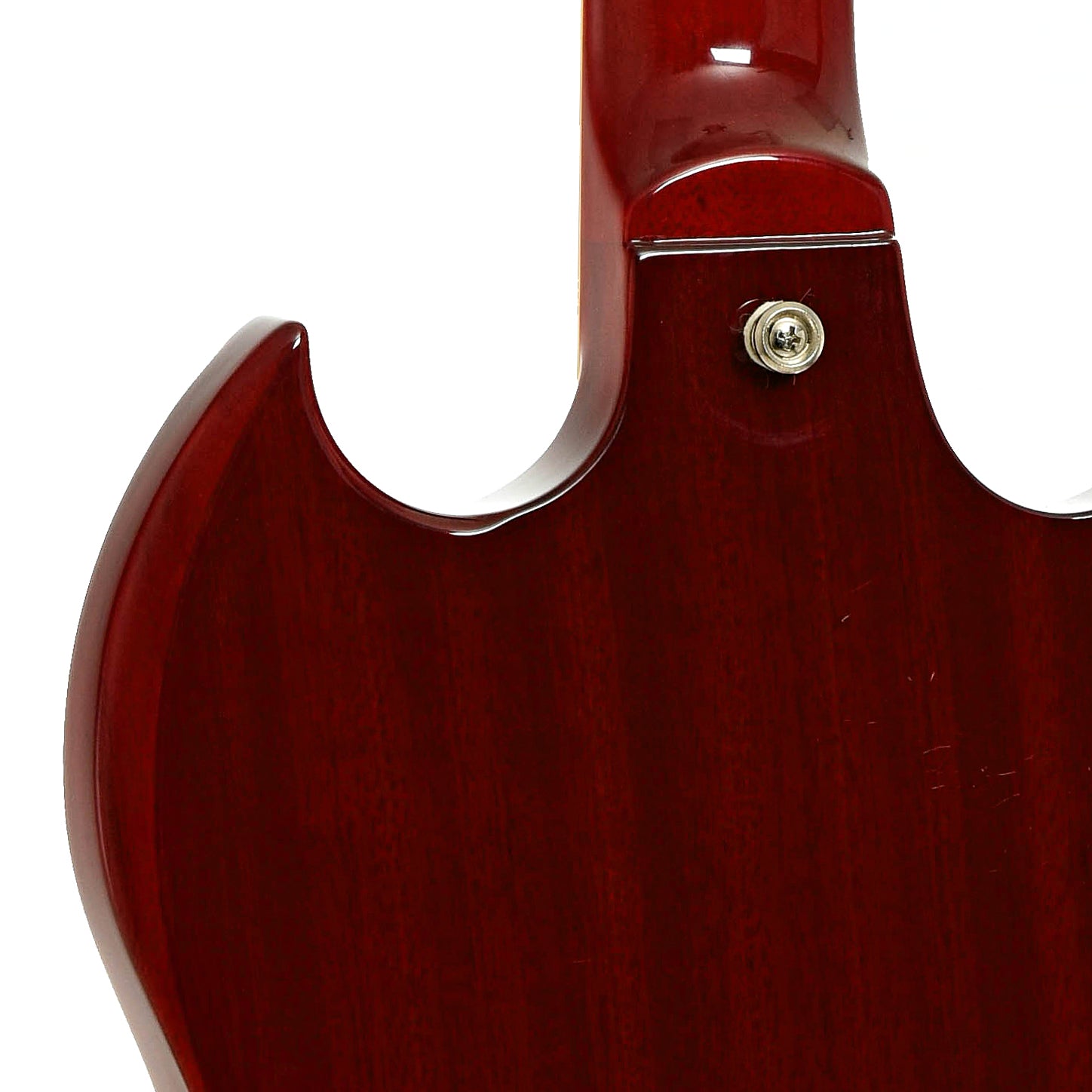 Epiphone recreates the 1960s classic SG with an all-mahogany body and neck in a heritage cherry finish. It has a bound laurel fingerboard with trapezoid inlays, "Batwing" large b-w-b-w plastic pickguard. Equipped with dual humbucking pickups, T-O-M-style bridge, and vintage-style tuners. Original hard shell. Import.