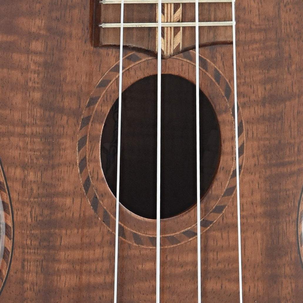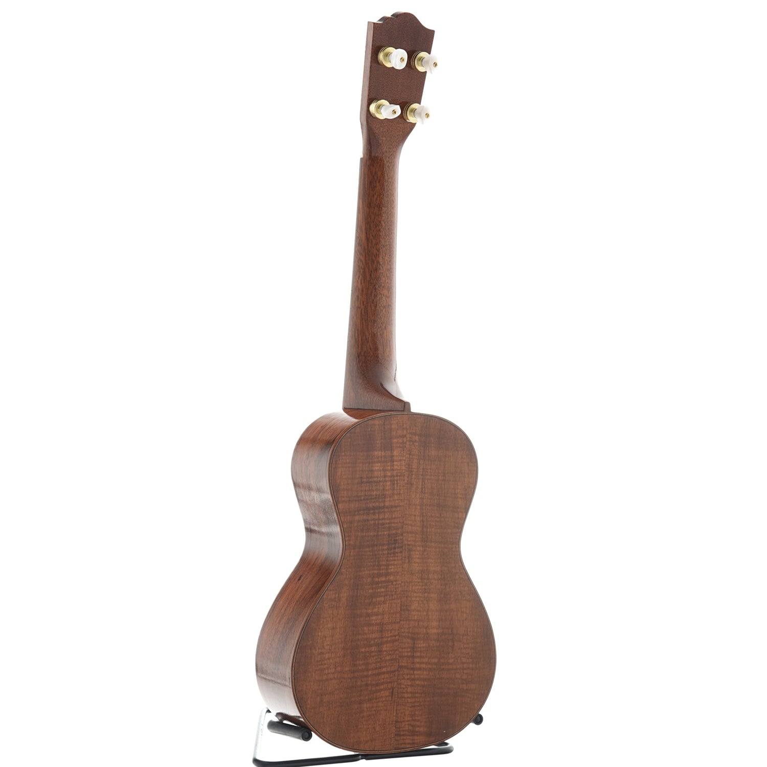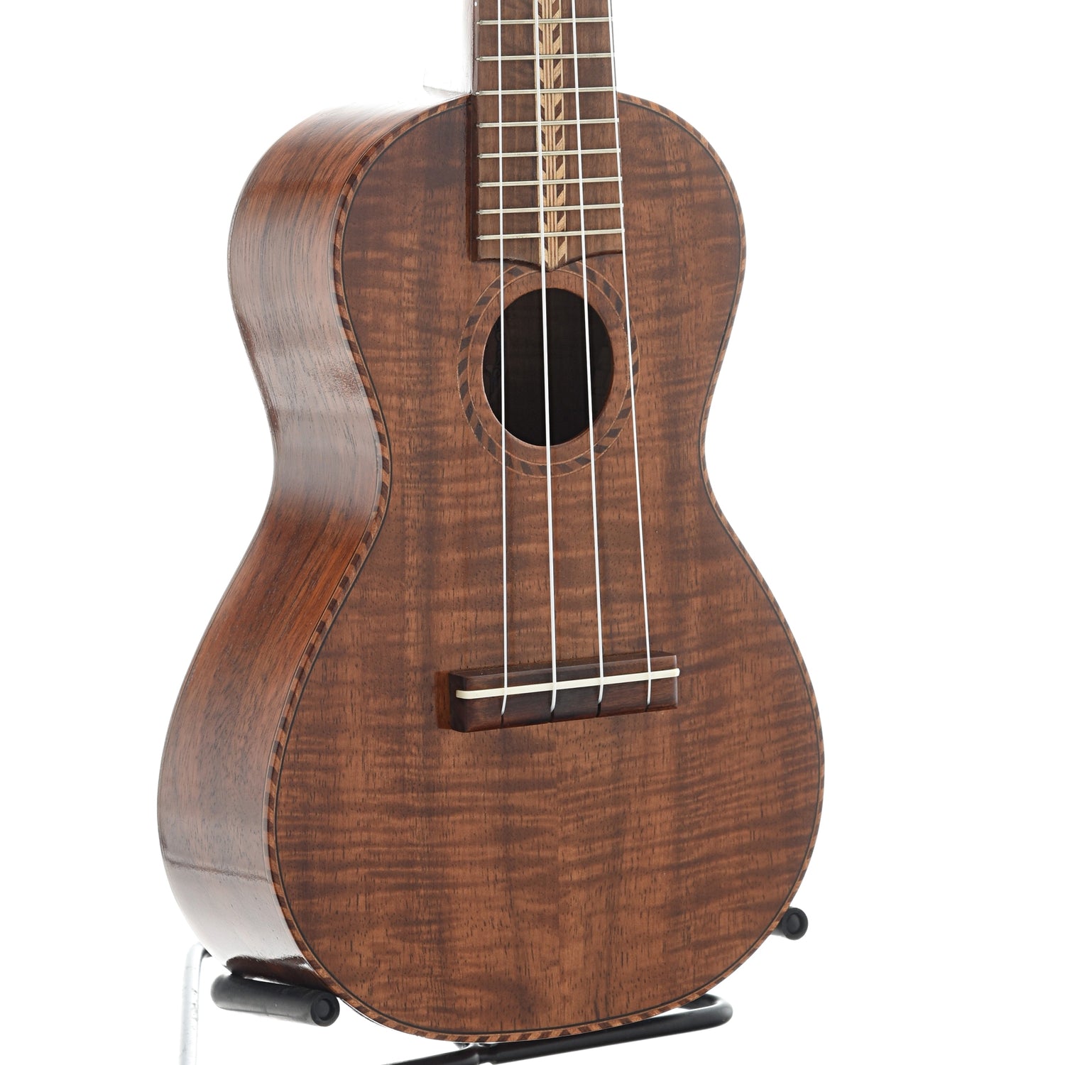 An impressive concert ukulele with high end appointments and terrific sound, this instrument compares favorably to ukes costing twice as much. Features a lightly constructed body of highly flamed, all solid koa and a mahogany neck. Premium details include "rope" style binding and rosette, koa bridge and fingerboard, fancy wood marquetry, Planetary geared tuners, and a thin nitrocellulose lacquer finish. A truly remarkable instrument.