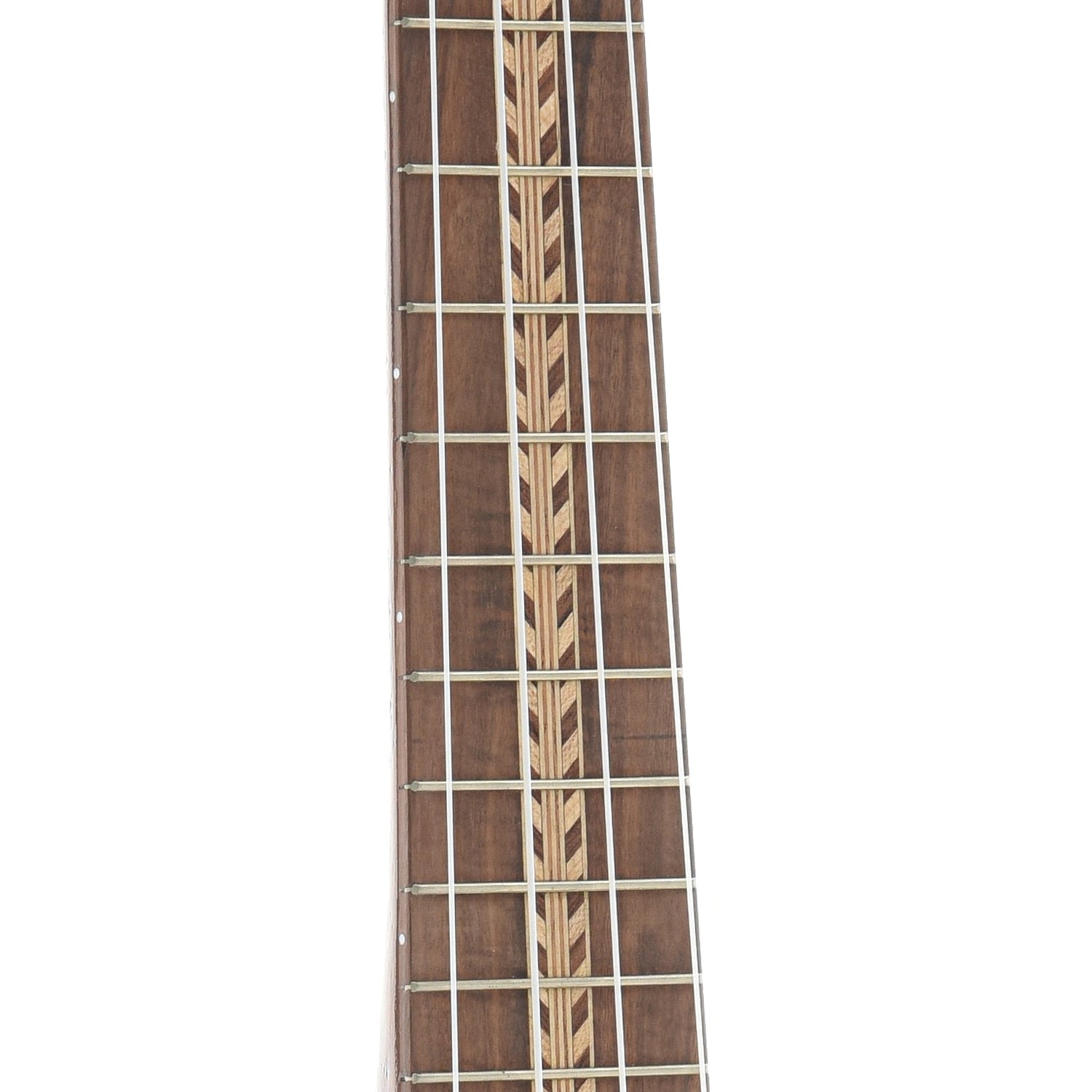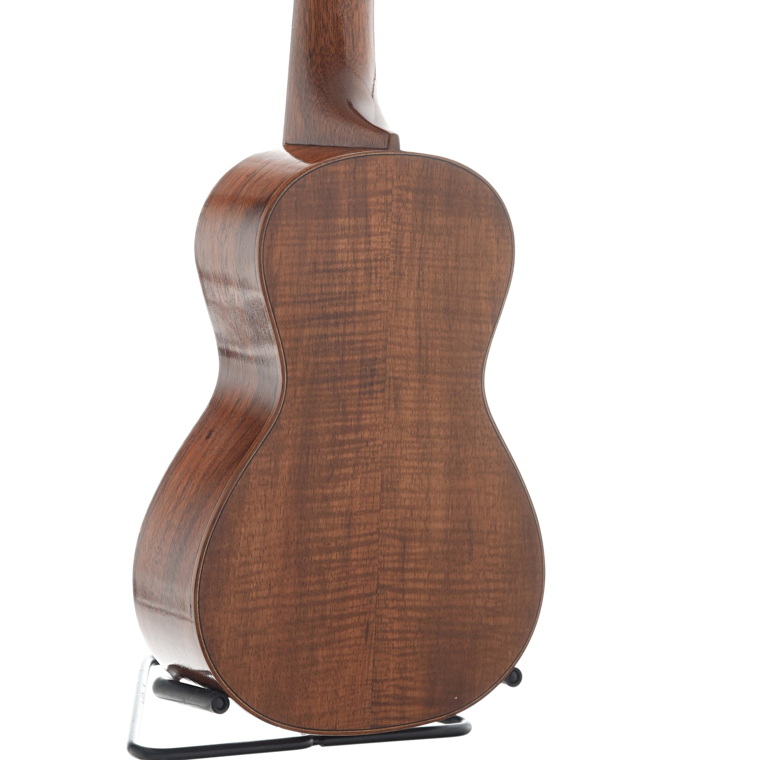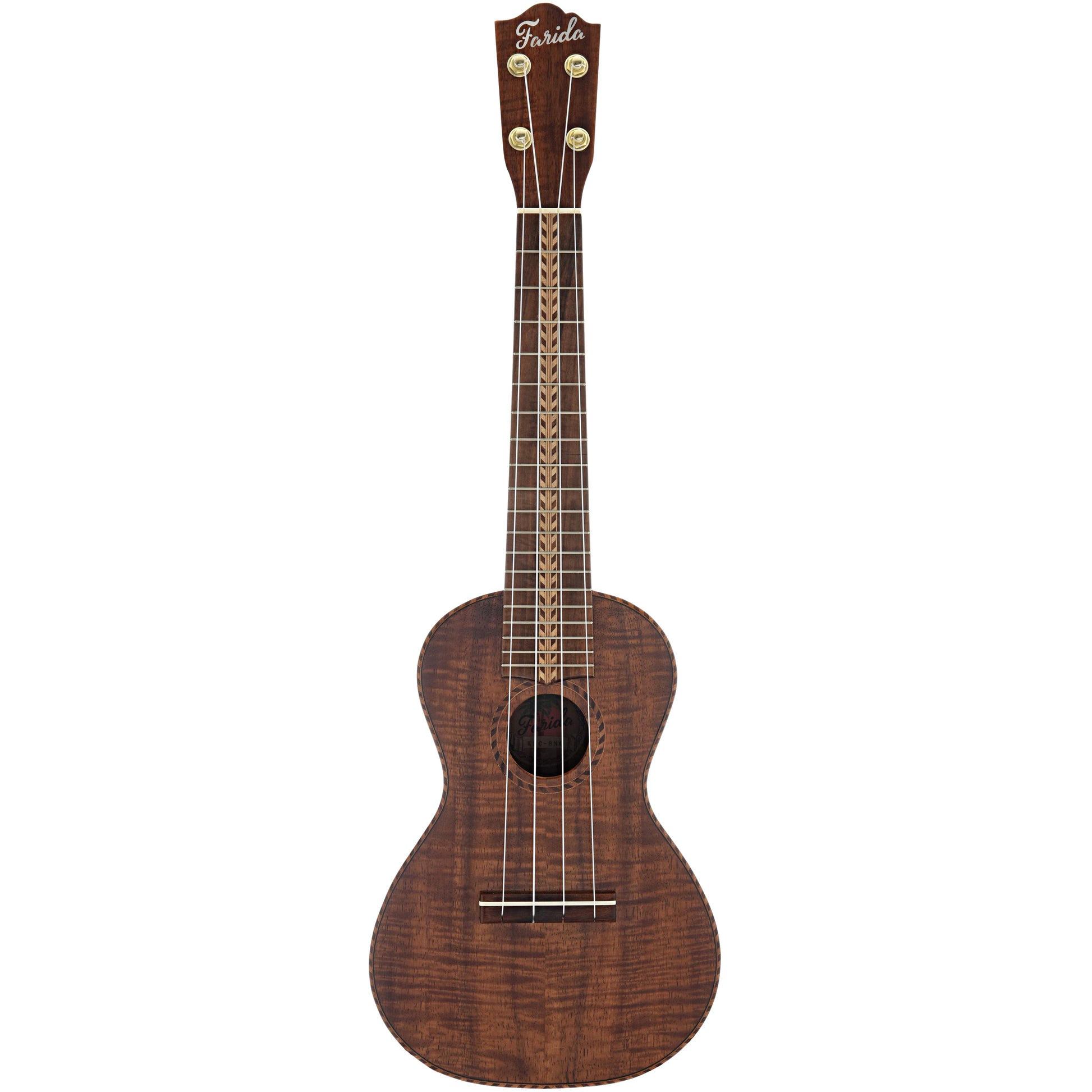 An impressive concert ukulele with high end appointments and terrific sound, this instrument compares favorably to ukes costing twice as much. Features a lightly constructed body of highly flamed, all solid koa and a mahogany neck. Premium details include "rope" style binding and rosette, koa bridge and fingerboard, fancy wood marquetry, Planetary geared tuners, and a thin nitrocellulose lacquer finish. A truly remarkable instrument.