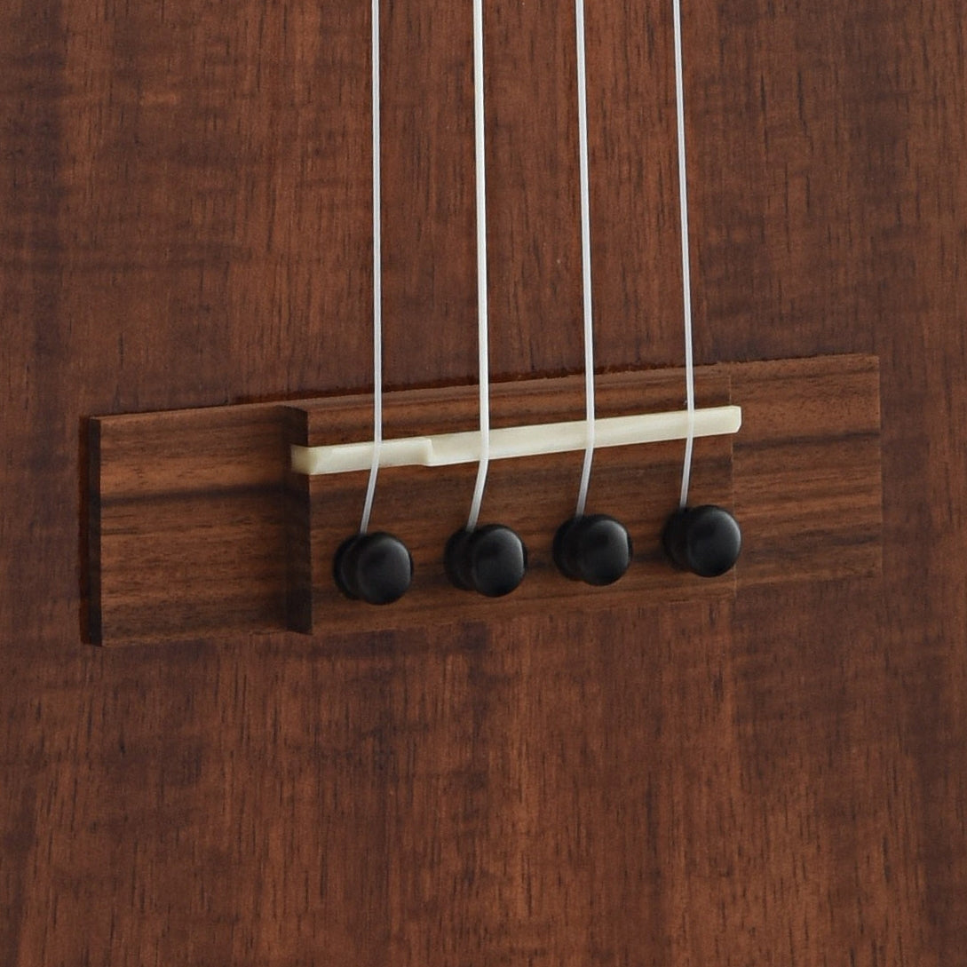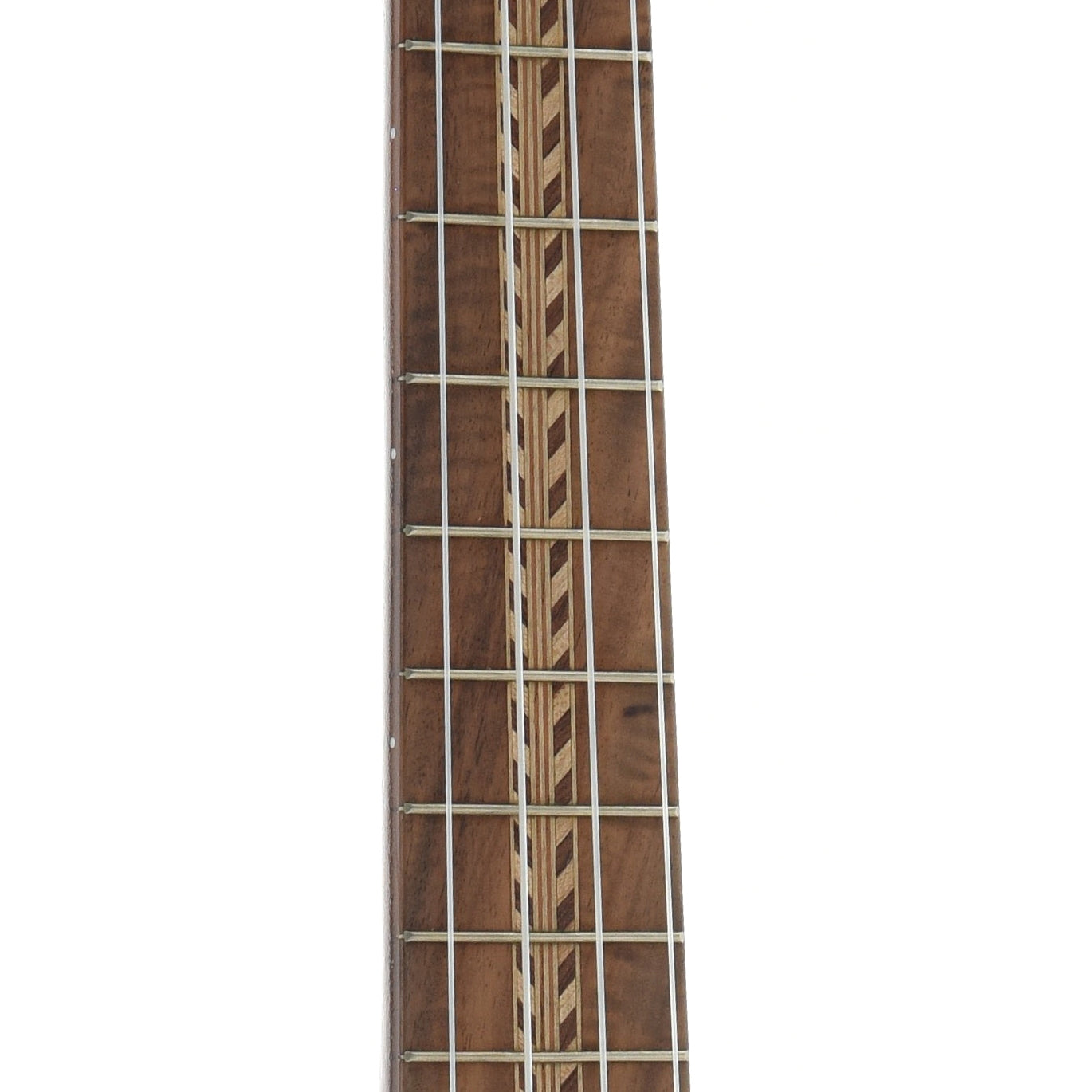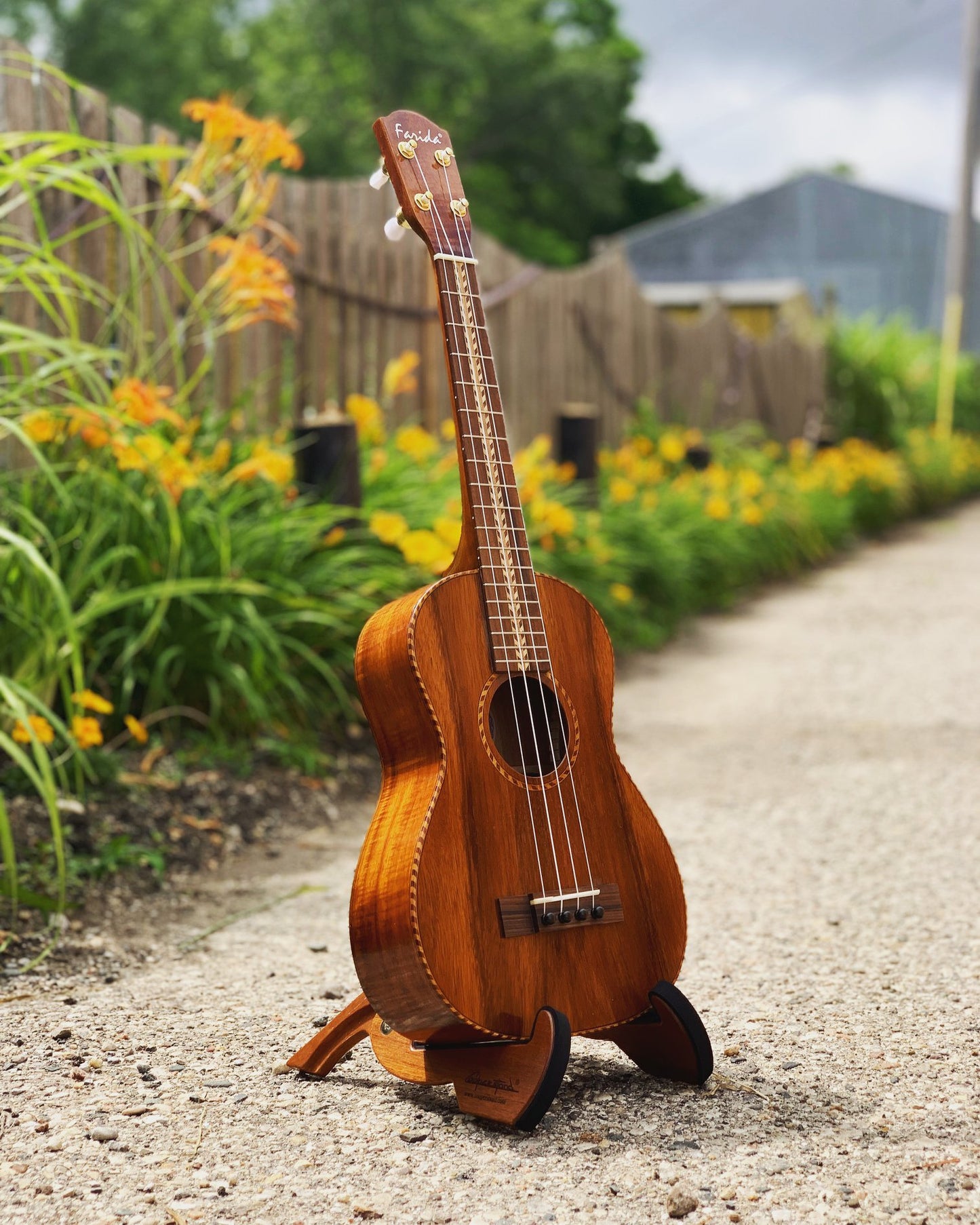 An impressive tenor ukulele with high end appointments and terrific sound, this instrument compares favorably to ukes costing twice as much. Features a lightly constructed body of highly flamed, all solid koa and a mahogany neck. Premium details include "rope" style binding and rosette, koa bridge and fingerboard, fancy wood marquetry, planetary geared tuners, and a thin nitrocellulose lacquer finish. A truly remarkable instrument.